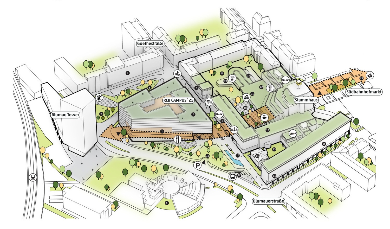Der Neubau der Raiffeisenlandesbank Oberösterreich wird zum zentralen Baustein des Campus und verwandelt das Areal zwischen dem Blumau Tower und dem Südbahnhofmarkt in ein innovatives und lebendiges Umfeld. Es liefert Impulse für Unternehmen durch Coworking Zones, Geschäfte, Gastronomie, Ausstellungsräume und schafft gleichzeitig eine erhöhte Freiraumqualität für alle Bürger.