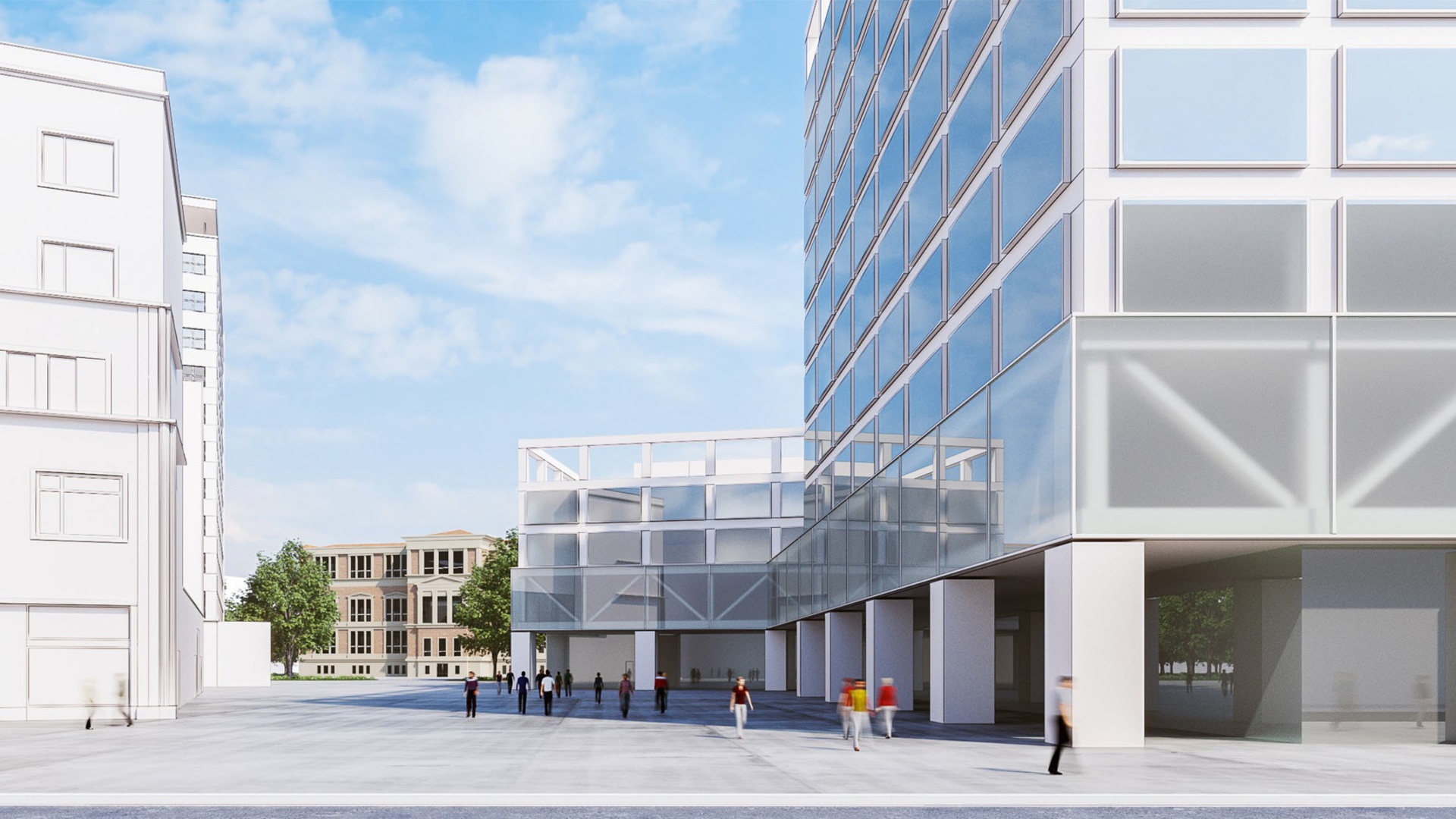 Leitidee des Entwurfs ist es, einen neuen urbanen Kommunikationsraum zu schaffen, der das aktuelle Verhältnis zwischen öffentlichem und nicht-öffentlichem Raum umkehrt und den Bereich zwischen den Gebäuden in einen öffentlich zugänglichen Durchgang umwandelt.