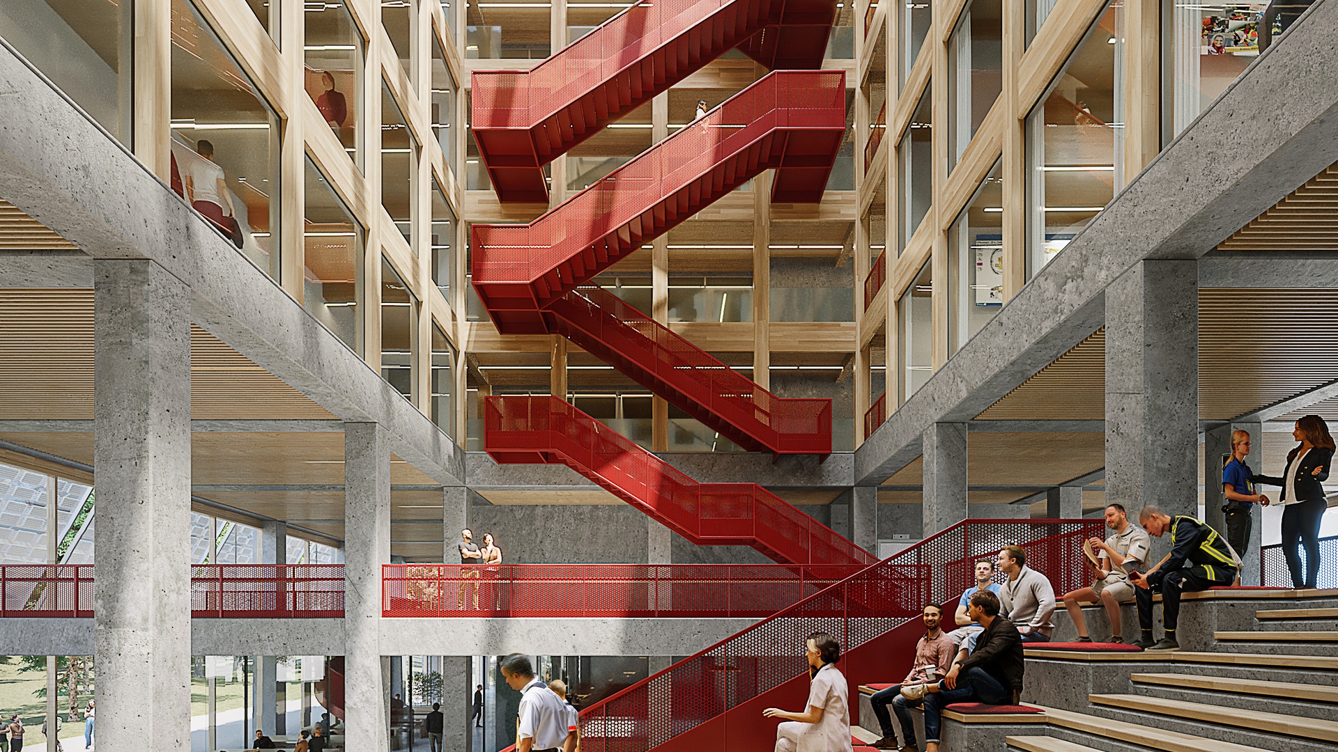 Auf Grundlage eines städtebaulichen Konzepts von kleyer.koblitz.letzel.freivogel und KUULA für den neuen Campus am nördlichen Stadtrand haben wir im Rahmen des VgV-Verfahrens ein neues Akademiegebäude entworfen. Der Neubau dient als kommunikatives Zentrum und bringt Lehrende und Auszubildende zusammen. Mit seiner Höhe und dem zurückgenommenen, bewusst technischen Erscheinungsbild der Fassade fügt sich der Neubau harmonisch in die Umgebung ein und vermittelt so zwischen Alt und Neu. Das Herzstück des Neubaus ist ein zentrales, lichtdurchflutetes Atrium, das alle Geschosse verbindet, Sichtbezüge zulässt und Synergien innerhalb des Gebäudes fördert. Es dient als Treffpunkt für Wissensaustausch und informelle Begegnungen.