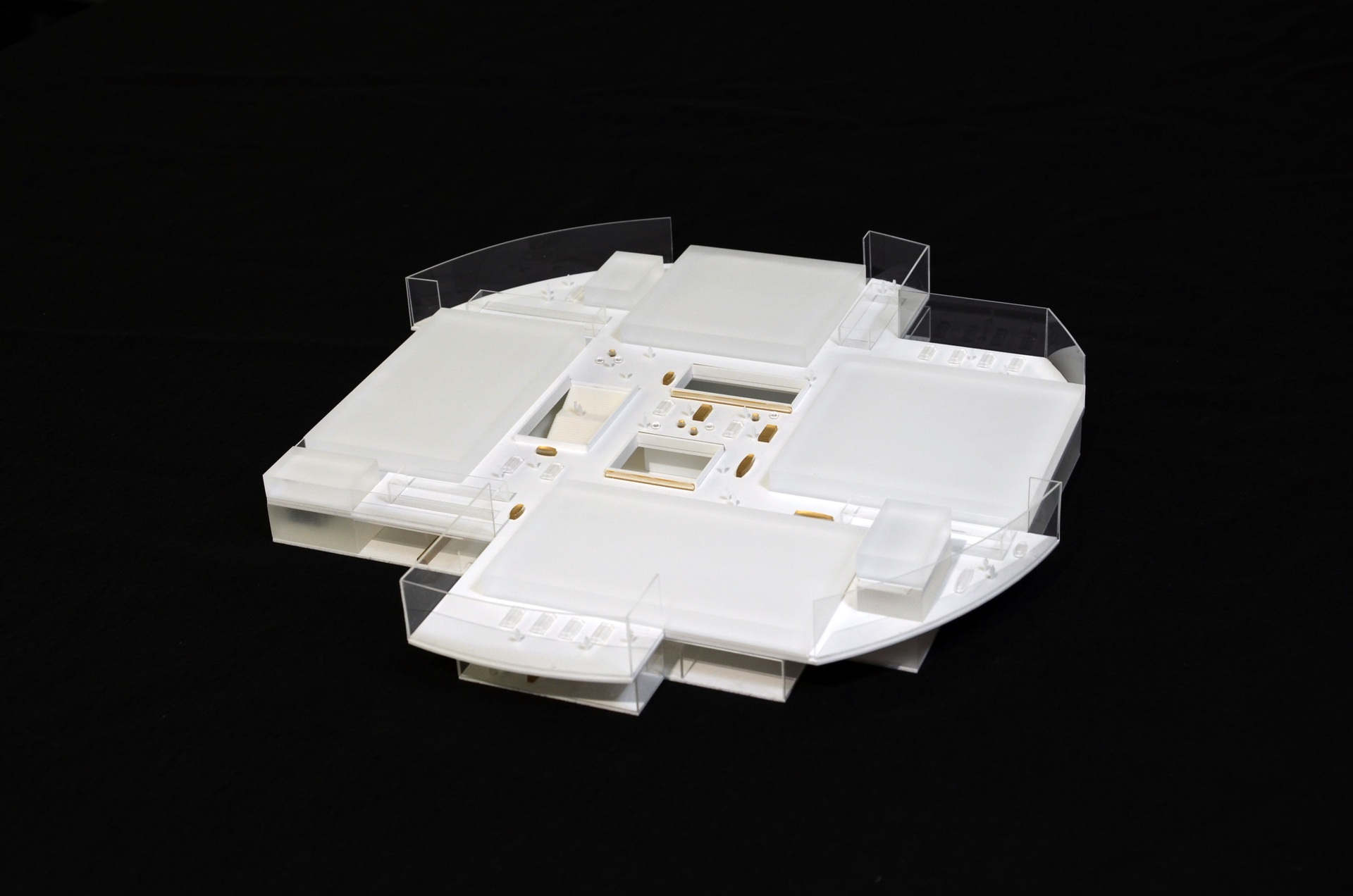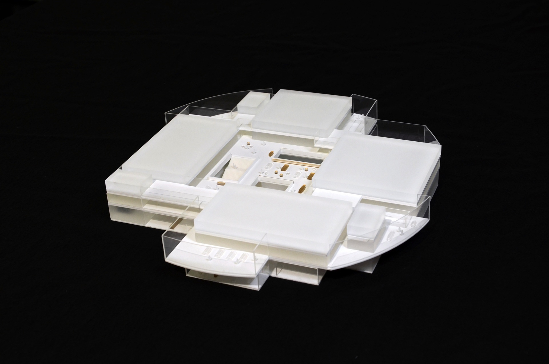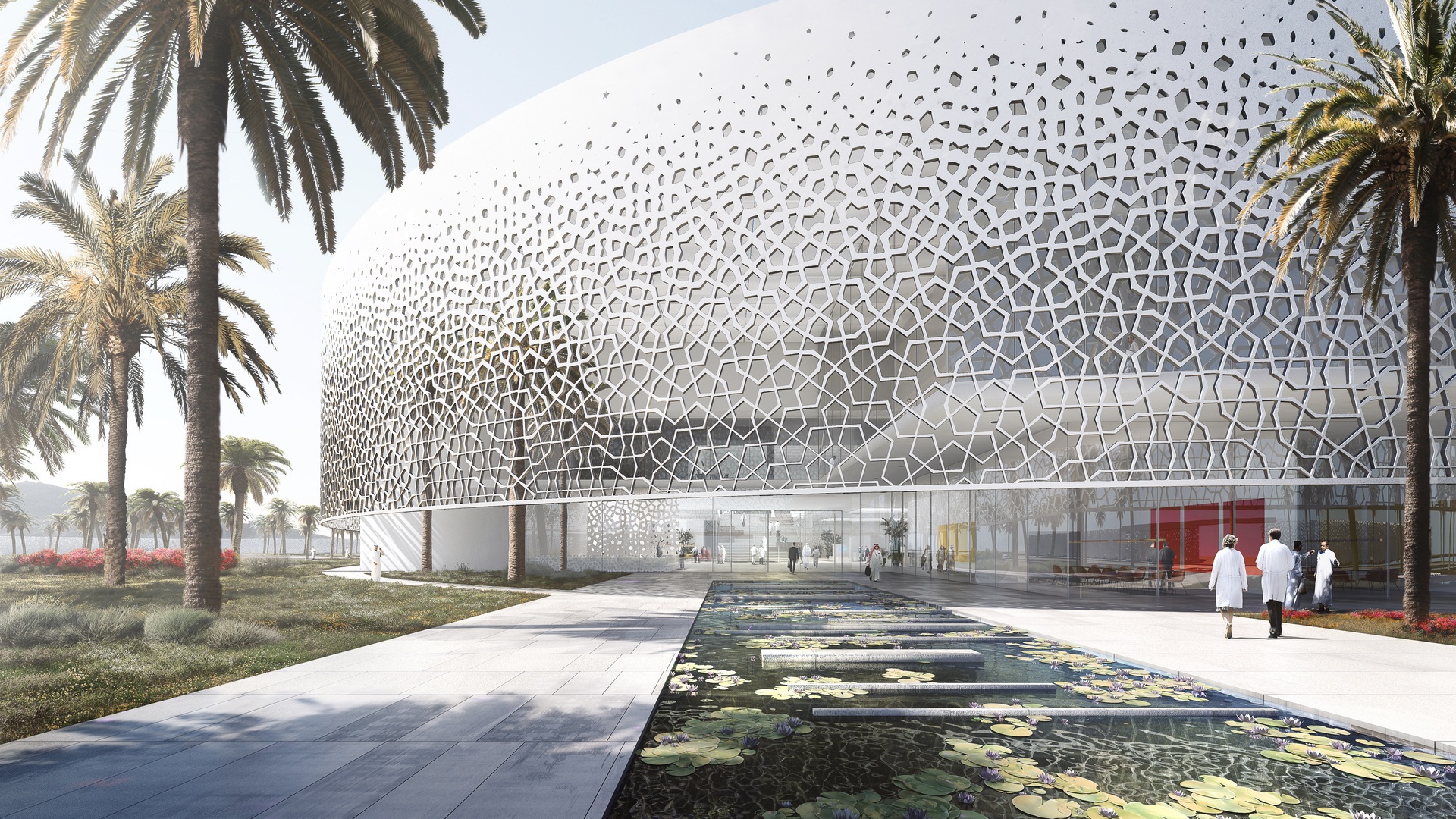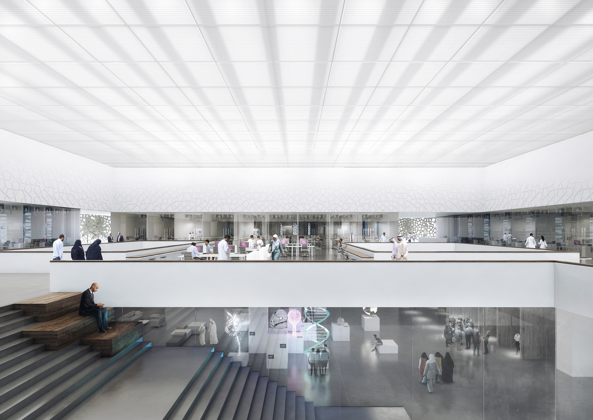 Diese Anordnung der Bereiche zueinander schafft optimale Bedingungen für kurze Wege und effiziente Prozesse. Gemeinsame Arbeitsbereiche schaffen Synergien. Die hohen Sicherheitsanforderungen werden durch ein Zutrittskontrollsystem sichergestellt, das auf ein Zwiebelschalenprinzip basiert. Die ikonische Gestalt des Gebäudes interpretiert mit einer filigranen, schwebenden Außenhülle die traditionellen Maschrabiyya, ein dekoratives Holzgitter in der islamischen Architektur. Die Fassade besteht aus einem Raster, das von offeneren zu geschlosseneren Bereichen verläuft. Entstanden ist eine Architektur, die bei hoher Transparenz und Flexibilität durch ein ausgearbeitetes Schleusen- und Zutrittssystem alle Aspekte an ein Hochsicherheitslabor erfüllt.