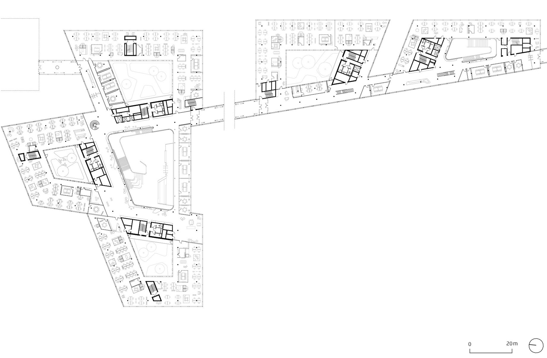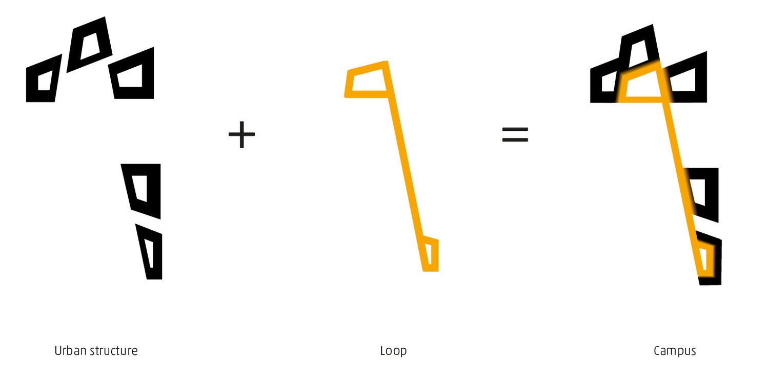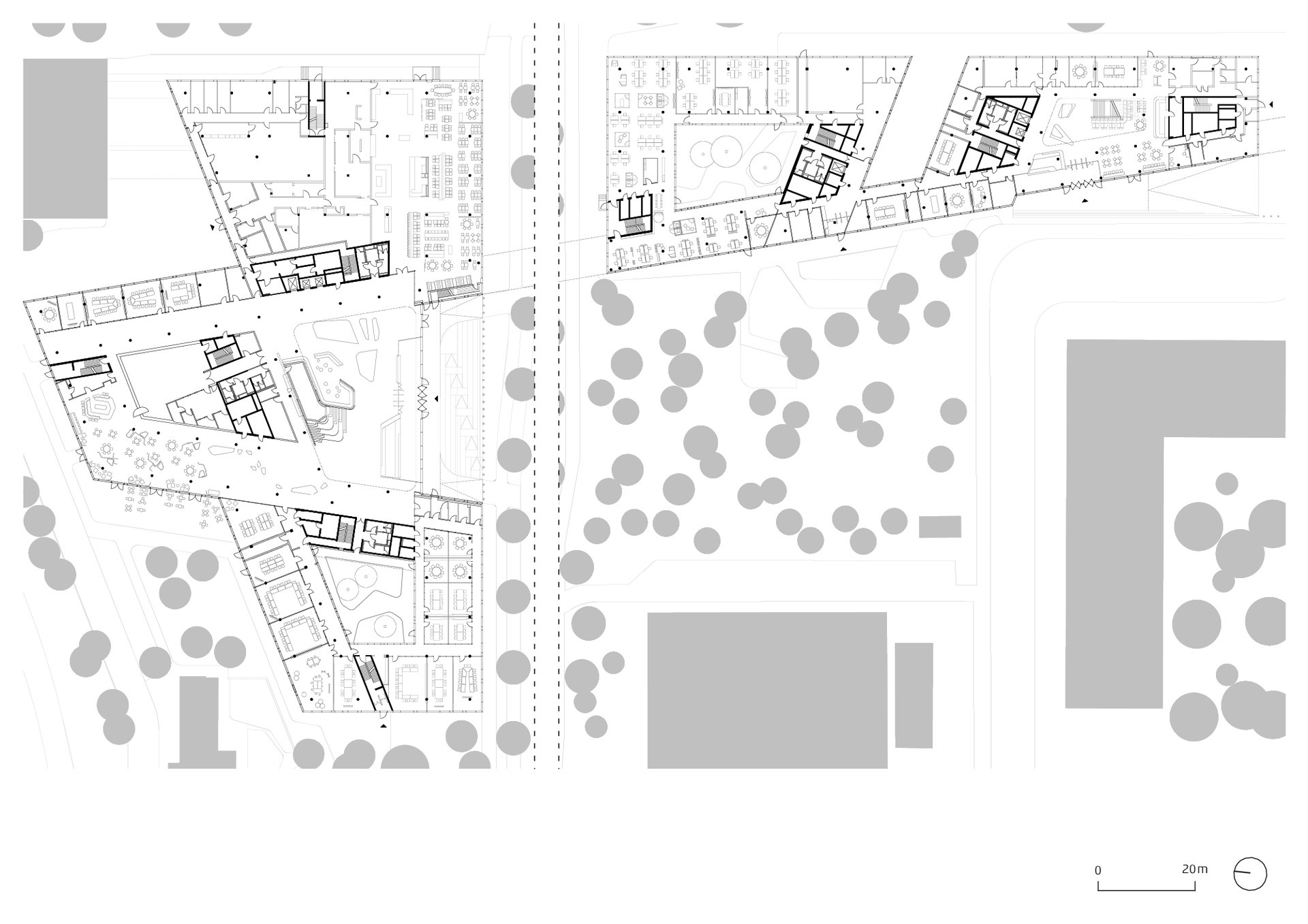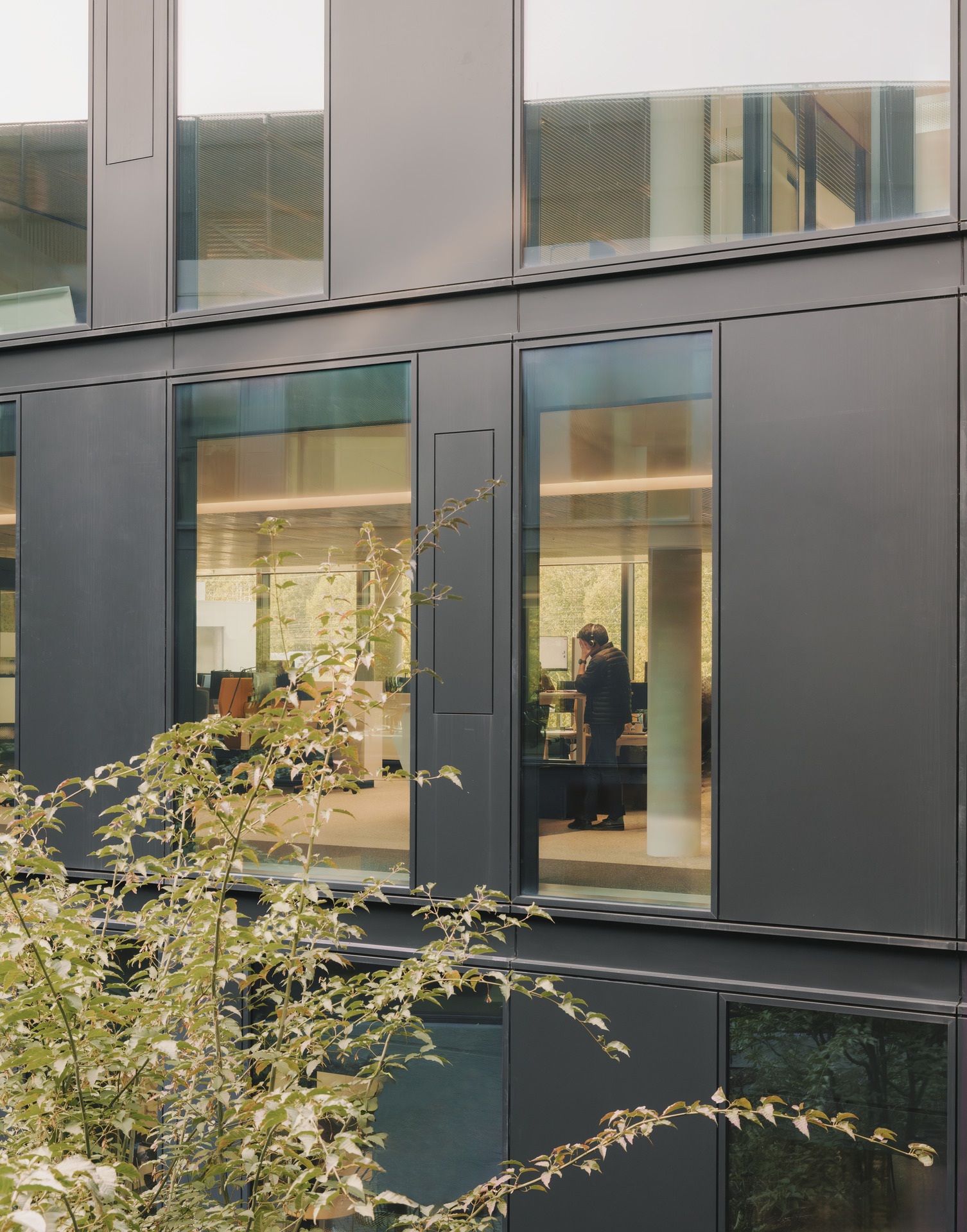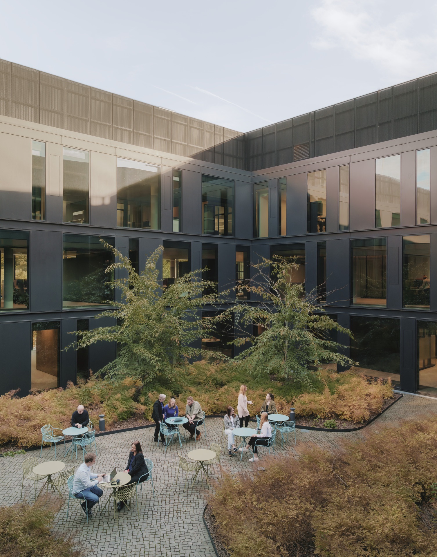 Das Ensemble ist in eine großzügige, öffentlich zugängliche Landschaft eingebettet, die den Baumbestand des umgebenden Landschaftsraums bis in den Campus hineinführt. Die einzelnen Gebäude umschließen privatere, bepflanzte Innenhöfe, die neben Aufenthaltsorten auch Arbeitsplätze im Freien bieten.