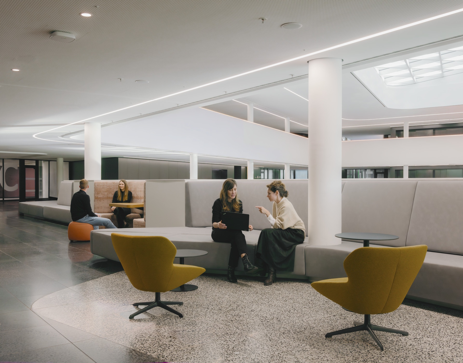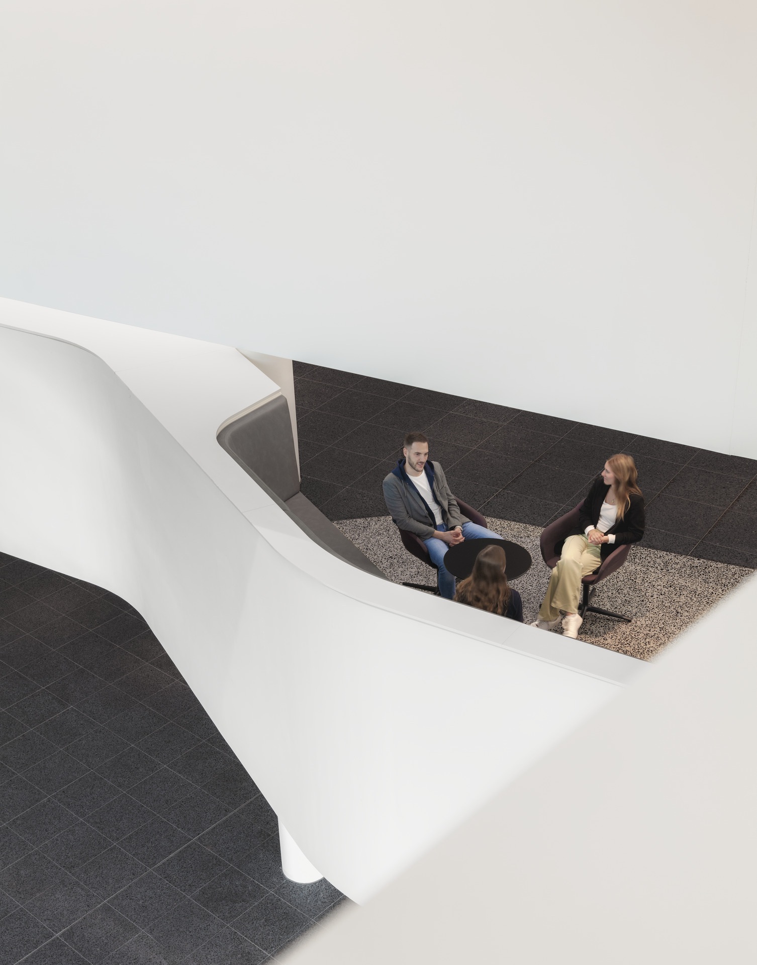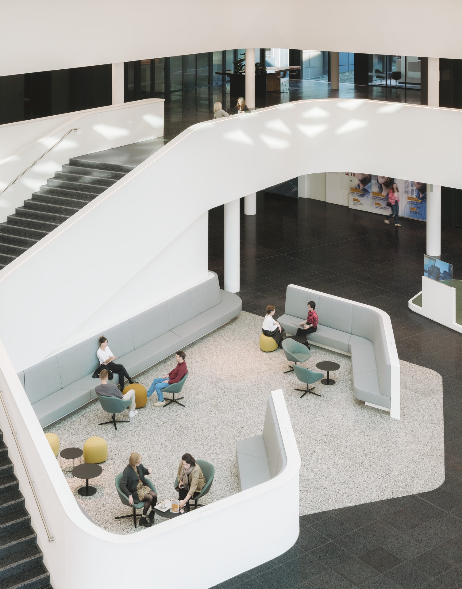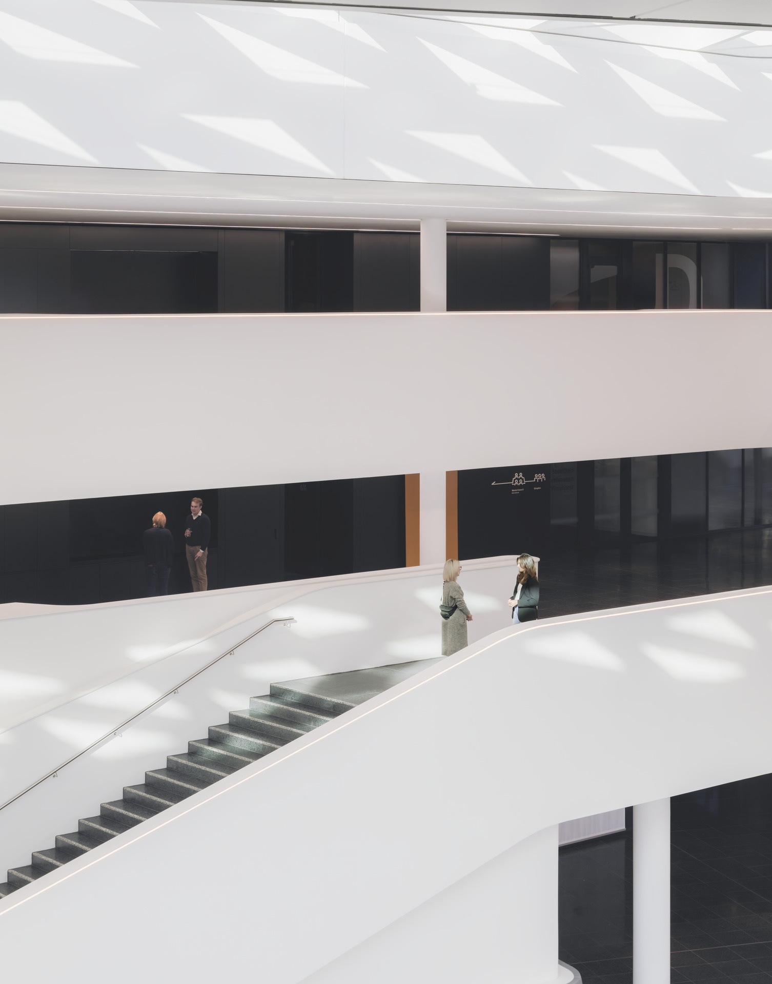 Der Loop, der im zweiten Obergeschoss durch alle Gebäude und über die Brücke hinweg verläuft, ist ein dynamisches Raumkontinuum, das alle Gebäude und Mitarbeiter*innen vernetzt. Als kommunikatives Zentrum der neuen Unternehmenszentrale bietet er eine Vielfalt an Räumen: kollaborative Arbeitsflächen sowie Orte für Wissensaustausch und informelle Begegnungen. So entsteht neben den Zonen für konzentriertes Arbeiten ein sozialer Raum, in dem Menschen zusammenkommen.