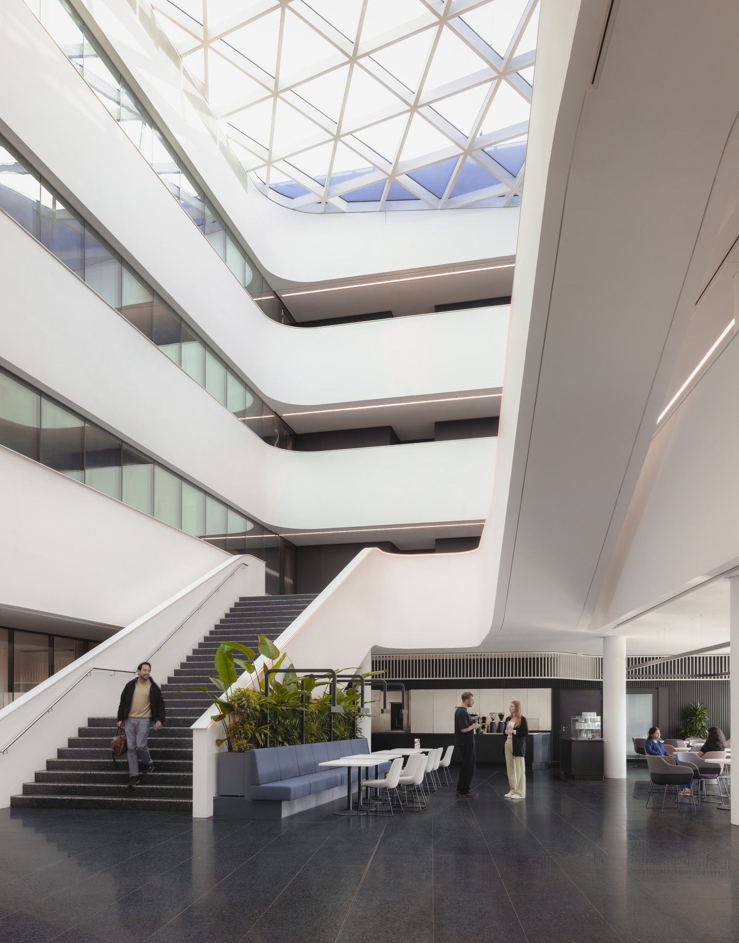 Der Loop schafft ein horizontales Netzwerk von Büro- und Besprechungsräumen, Cafeteria und Gesundheitsbereich. Im Norden und im Süden ist er über zwei Touchdowns mit der Erdgeschossebene verbunden. Dort befindet sich die beiden Atrien, die Mitarbeitende und Gäste im Gebäude empfangen und an die sich die Unternehmenskantine und ein TV-Aufnahmestudio angliedern. Die Interiors der Arbeitswelten und die Mitarbeiterrestaurants wurden von Ippolito Fleitz Group gestaltet.