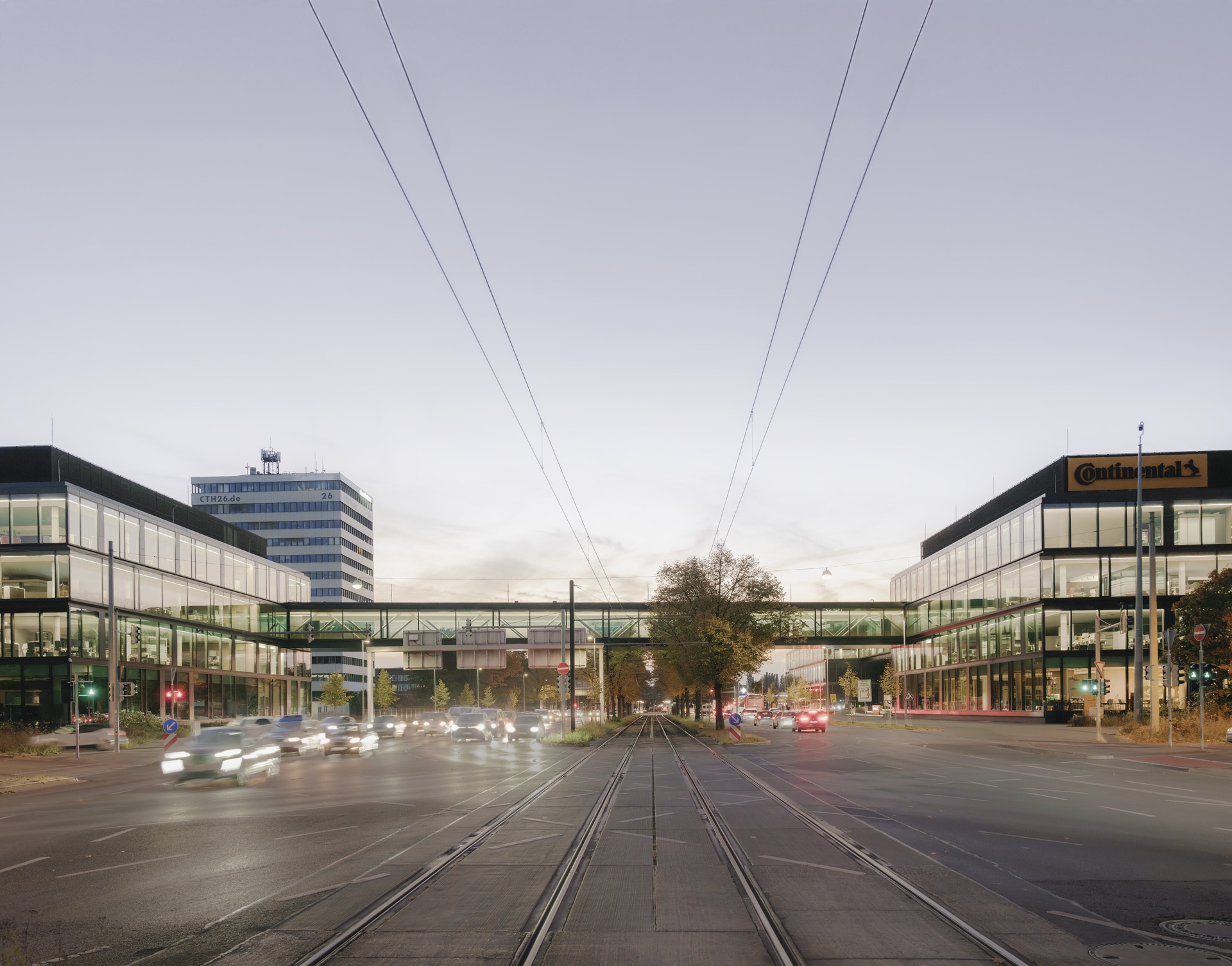 In urbaner Umgebung mit Büro- und Verwaltungsgebäuden, Hotels und Industrie ist für Continental ein Unternehmenscampus mit vernetzten Einzelgebäuden entstanden. Er ist auf zwei getrennten Grundstücken gelegen, die durch eine achtspurige Straße getrennt sind. Aus dieser Lage entwickelt das Design die zentrale Entwurfsidee: ein Gebäudeensemble mit einem von Motorsportrennstrecken inspirierten Grundriss, das über eine Brücke mit über 70 Metern Spannweite Gebäude nördlich und südlich der Straße verbindet.