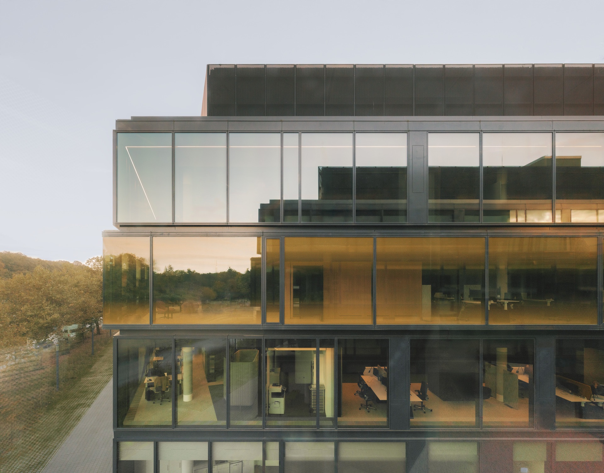 Die konzeptionelle Grundidee des Entwurfs bleibt dadurch nach innen und außen deutlich wahrnehmbar. An der glatten Glasfassade mit dunkelgrauen Profilen markieren farbig bedruckte Glaspaneele umlaufend den Loop und verbinden alle Gebäude visuell zu einem Ganzen. Durch seine energieeffiziente Umkehrfassade kommt das Gebäude ohne außenliegenden Sonnenschutz aus.