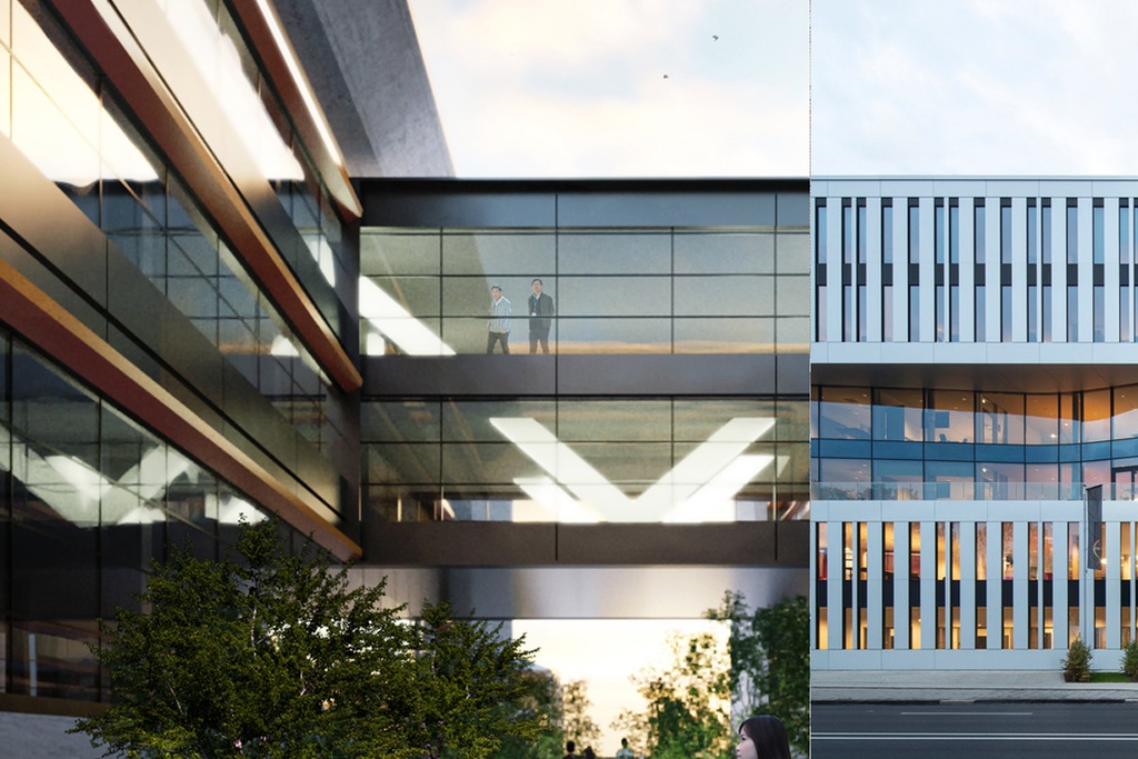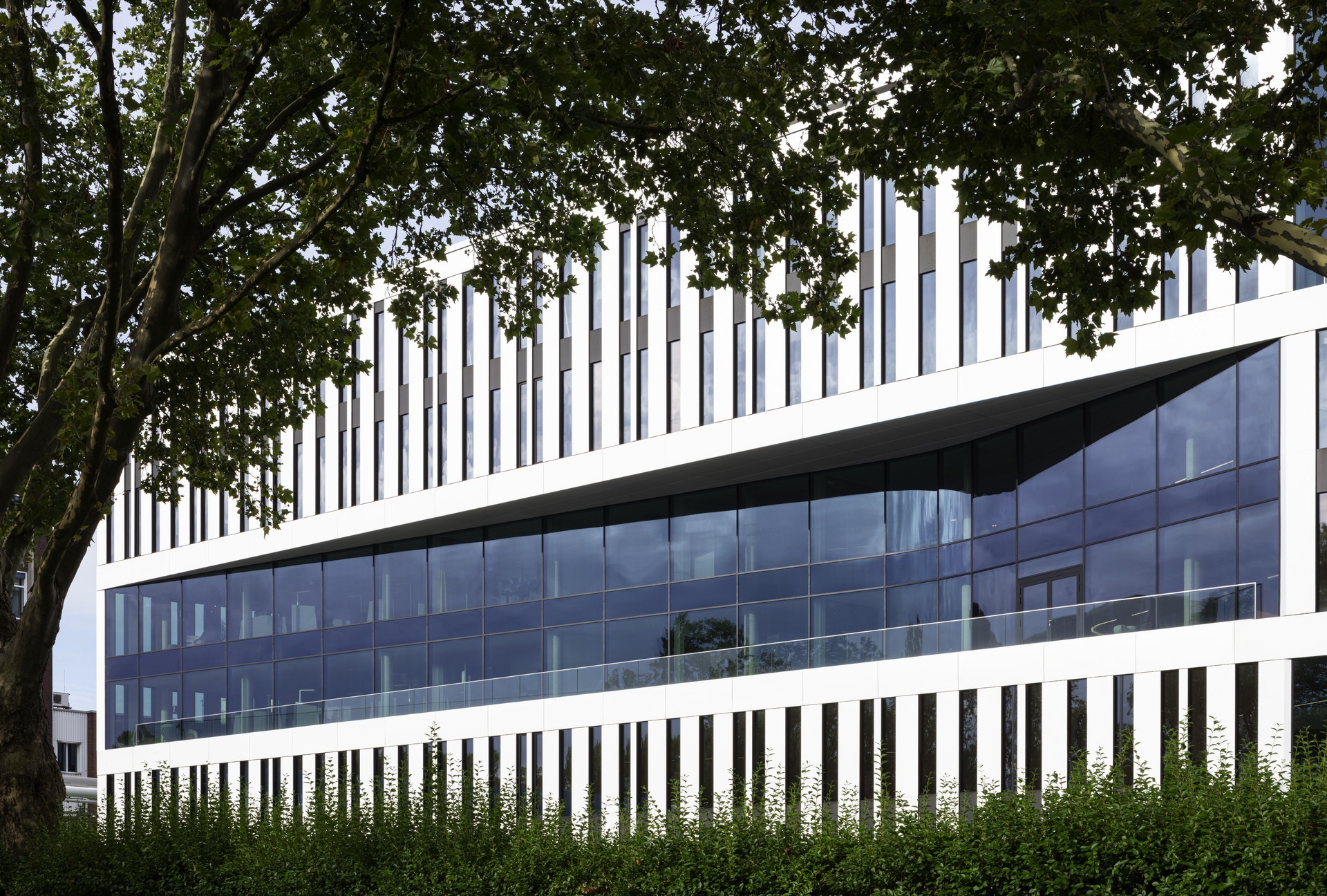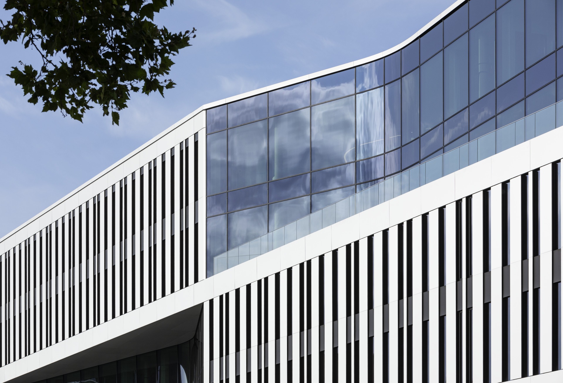 Durch Rücksprünge in der Fassade entstehen Terrassen als grüne Blickpunkte. Das Gebäude ist modular aufgebaut, dafür wird das zweigeschossige Modul mit seinem Fassadenrücksprung doppelt gespiegelt und dann zusammengesetzt. In den folgenden Bauabschnitten entstehen ein doppel-Z-förmiges Hybridgebäude mit Büros und Laboren, flankiert von einem Technikumsgebäude im Süden, das über Stege mit den Laborbereichen verbunden wird.