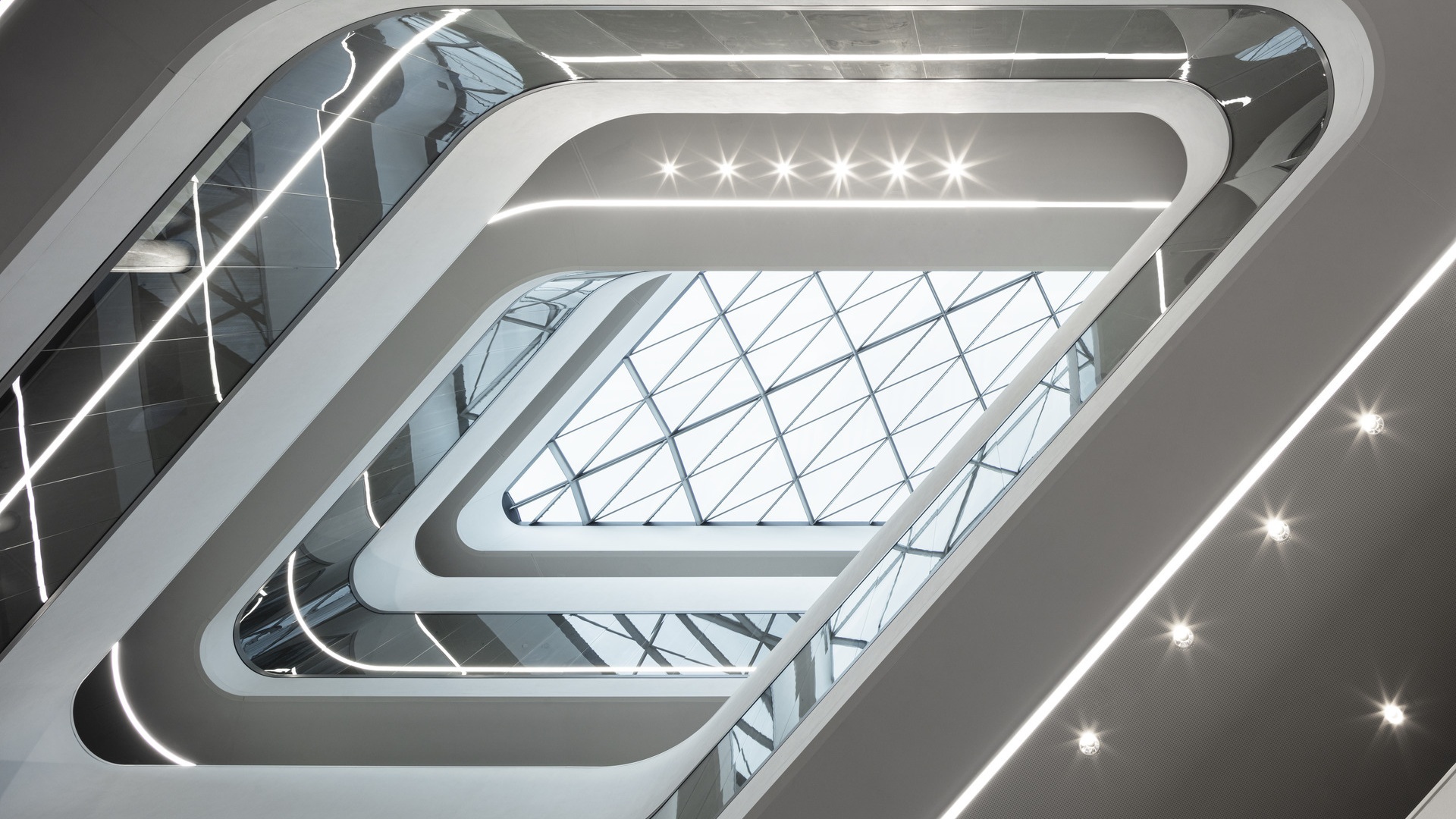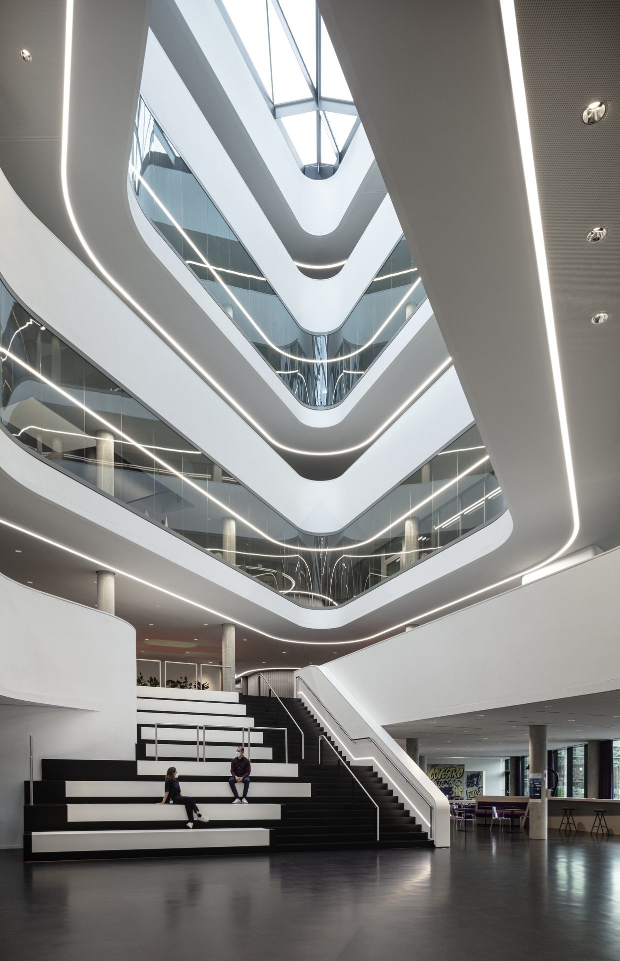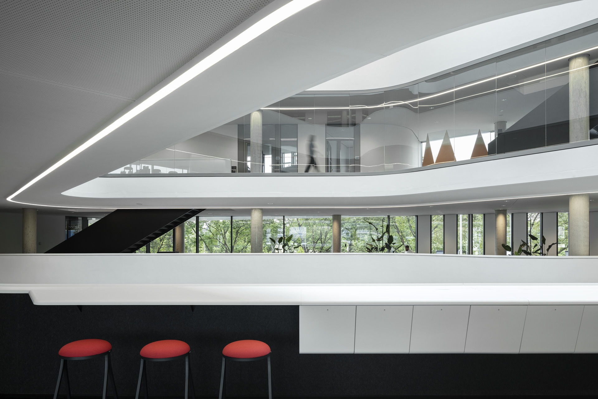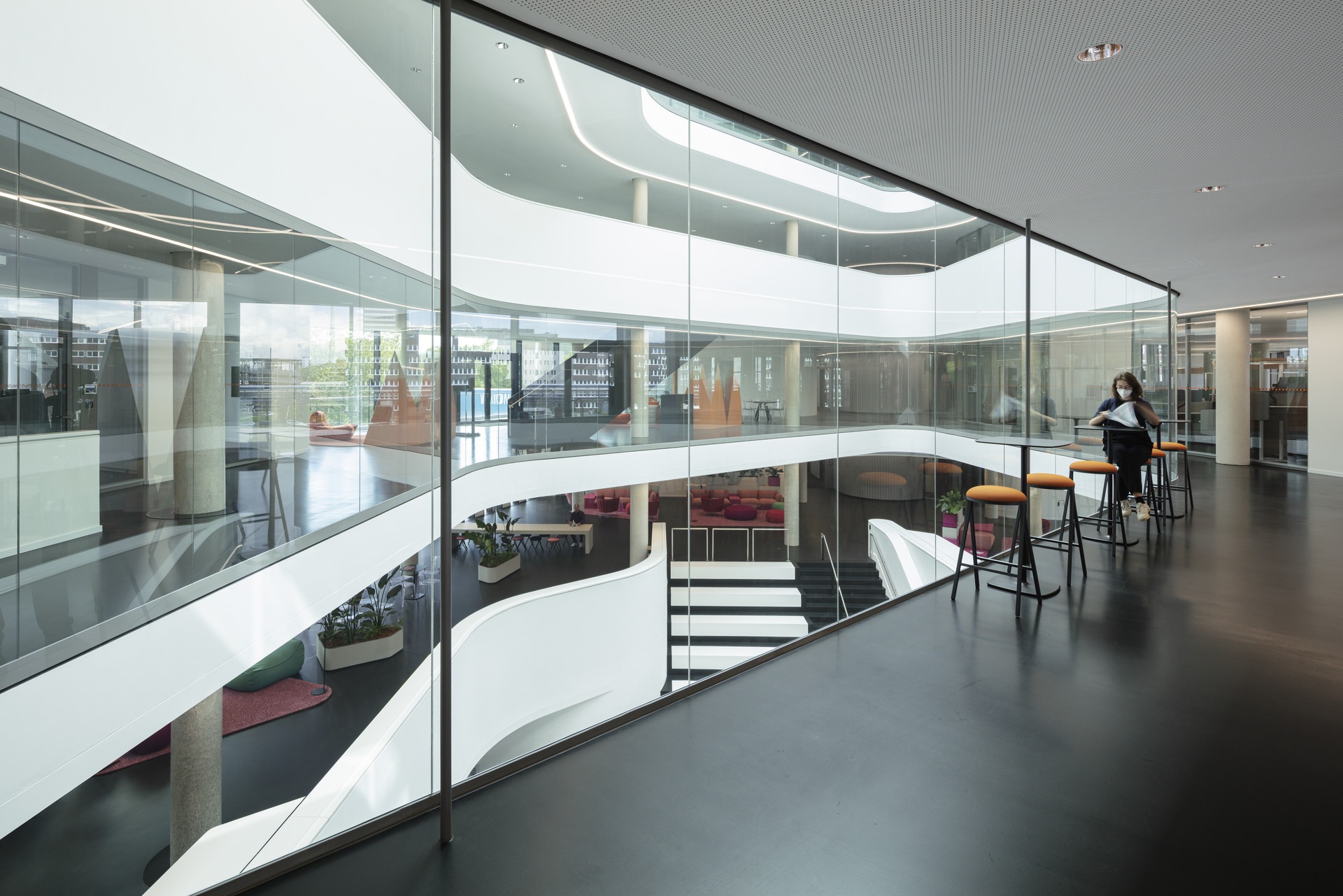 Der Spine verbindet eine Folge von Atrien für die interdisziplinäre Kommunikation des Unternehmens, im Unterschied zu den angrenzenden funktionalen Bereichen mit ihrer Fokussierung auf Fachwissen, Labor, Büro oder Technik.