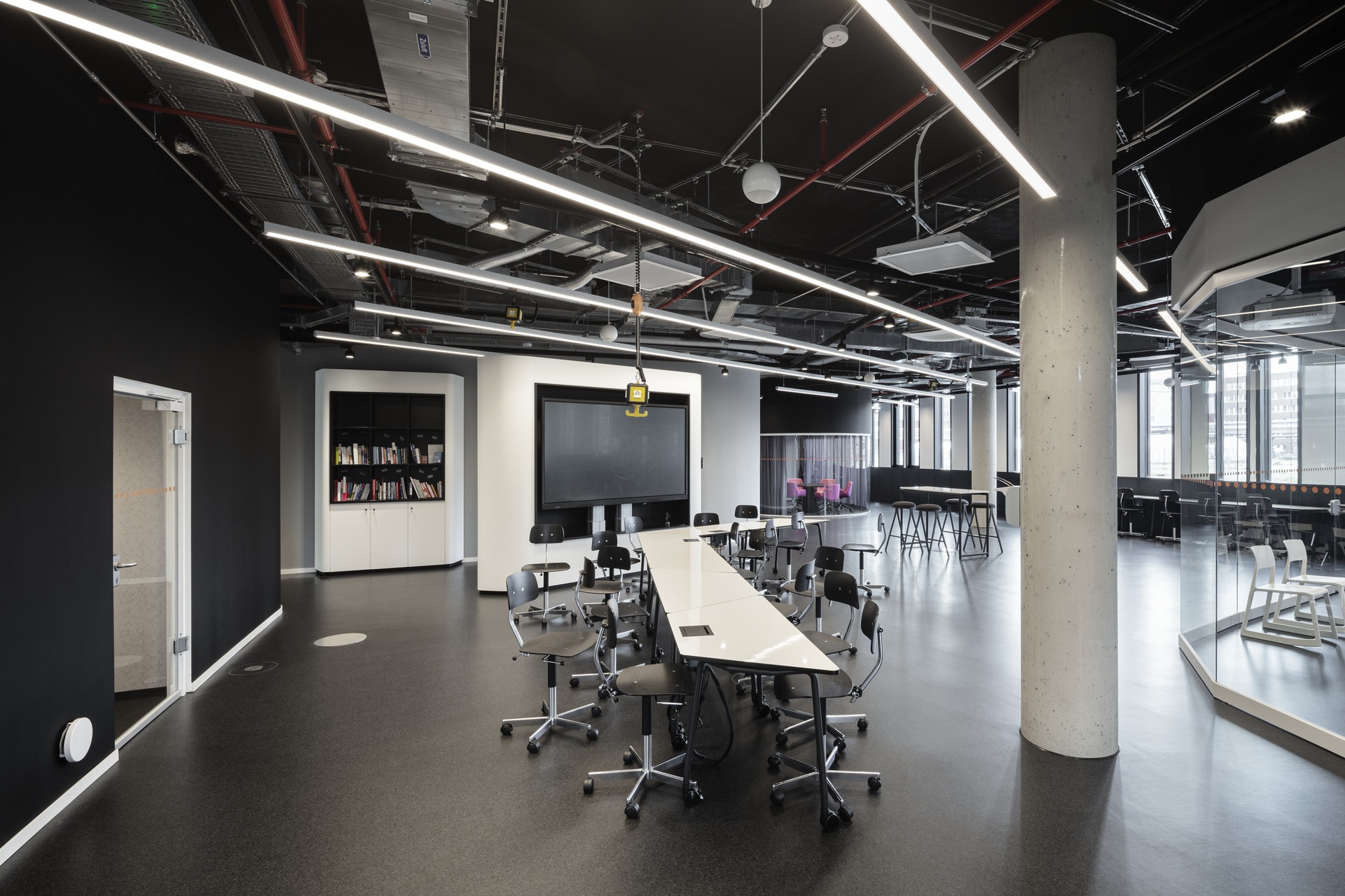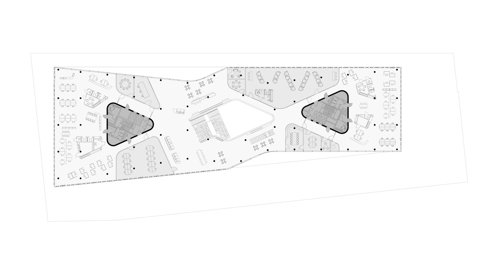 Auf halbem Weg befindet sich das größte Atrium, das Herzstück des Standorts, das dem Konzern als „Townhall“ im Bürogebäude dient, in der sich alle Mitarbeiter treffen und zu Veranstaltungen zusammenkommen können.