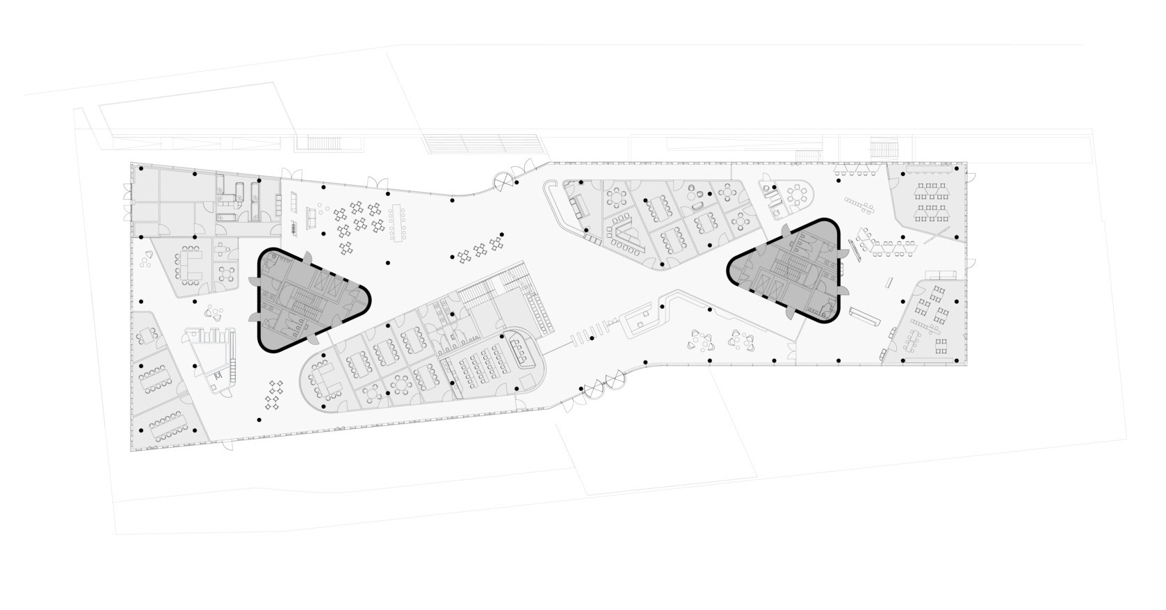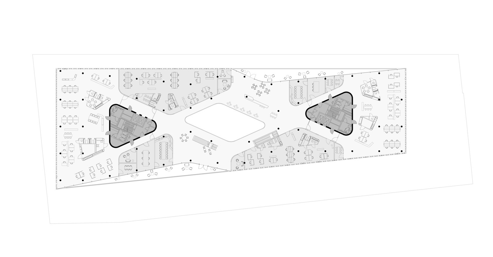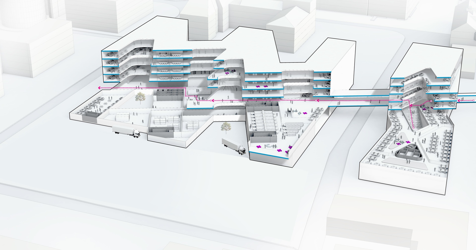 Das Hybridgebäude ist mit dem Headquarter über einen Spine, eine Erschließungsstraße im ersten Obergeschoss, verbunden, die durch das gesamte Gebäude hindurchführt und an deren Enden die Haupteingänge liegen.