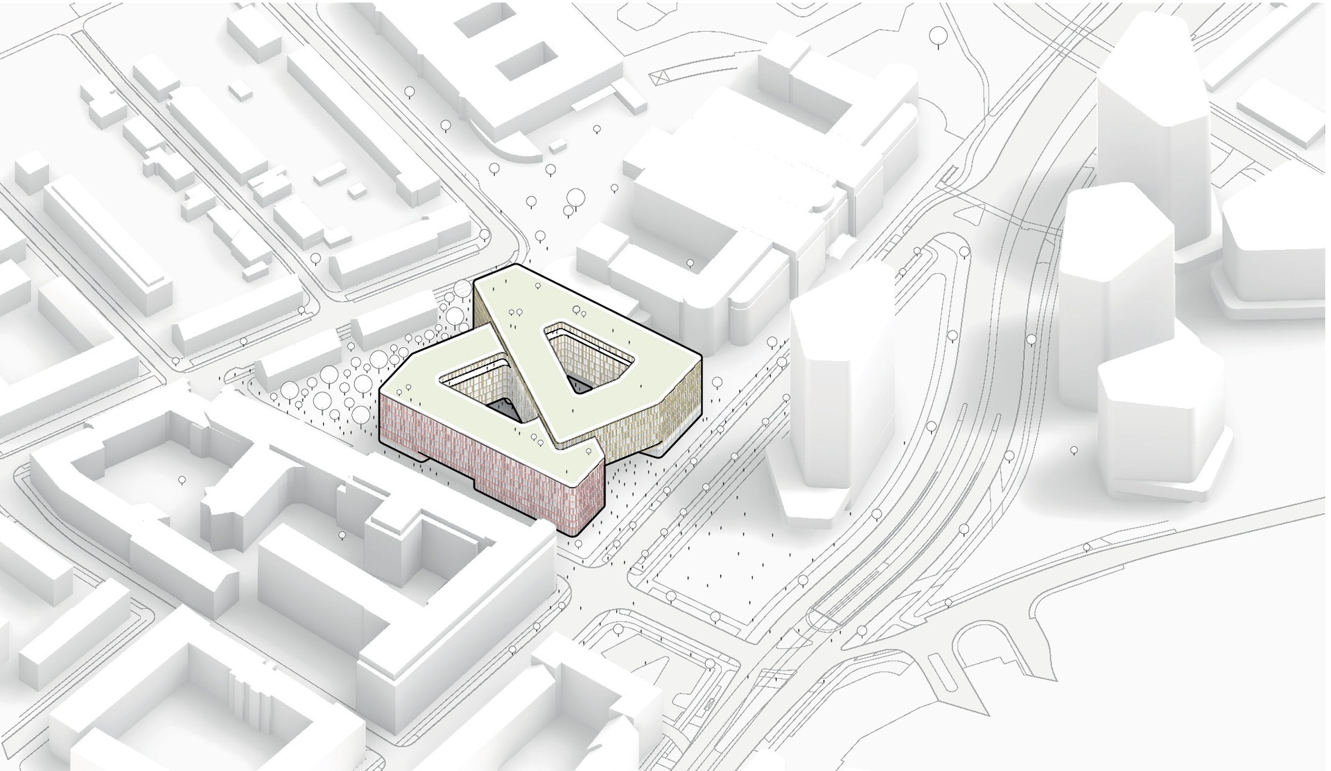 Das Multi-Tenant-Gebäude mit sieben und acht Stockwerken bietet flexibel nutzbare, unterschiedlich große Büromietflächen. Im Erdgeschoss sind Gewerbeflächen, gastronomische Einrichtungen – etwa Supermarkt, Bäckerei und Café – und ein Fitnessstudio vorgesehen, die sowohl für Nutzer*innen als auch Anwohner*innen der umliegenden Bauten zugänglich sind. Urbane, trapezförmige Innenhöfe und begrünte Dachflächen mit Alpenblick dienen als Arbeitsplatz im Freien, als Räume für Austausch sowie der Naherholung.