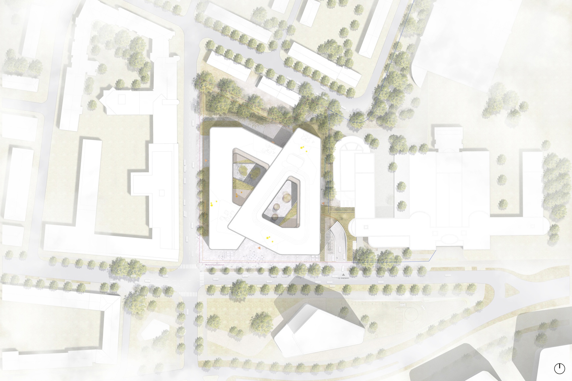 Der Münchener Osten ist ein begehrtes Wohnviertel und entwickelt sich zunehmend zu einem gefragten Businessstandort. Mit dem von HENN entworfenen Gebäudekomplex Der Bogen entsteht ein lebendiger Stadtteilcampus in Bogenhausen, der beides verbindet. Büroflächen und öffentlich genutzte Räume bringen Menschen, die hier leben und arbeiten an einem Ort zusammen. Mit seiner öffentlich zugänglichen Erdgeschosszone verzahnt sich der Neubau in alle Richtungen mit der Nachbarschaft und wird mit zum kommunikativen Treffpunkt des Stadtbezirks.
