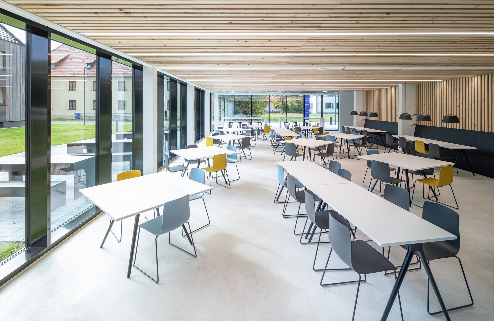 Die zwei benachbarten Unterkunftsgebäude werden saniert und erhalten eine neue, gedämmte Holzfassade. Es entstehen 80 Zimmer für Lehrgangsteilnehmer.