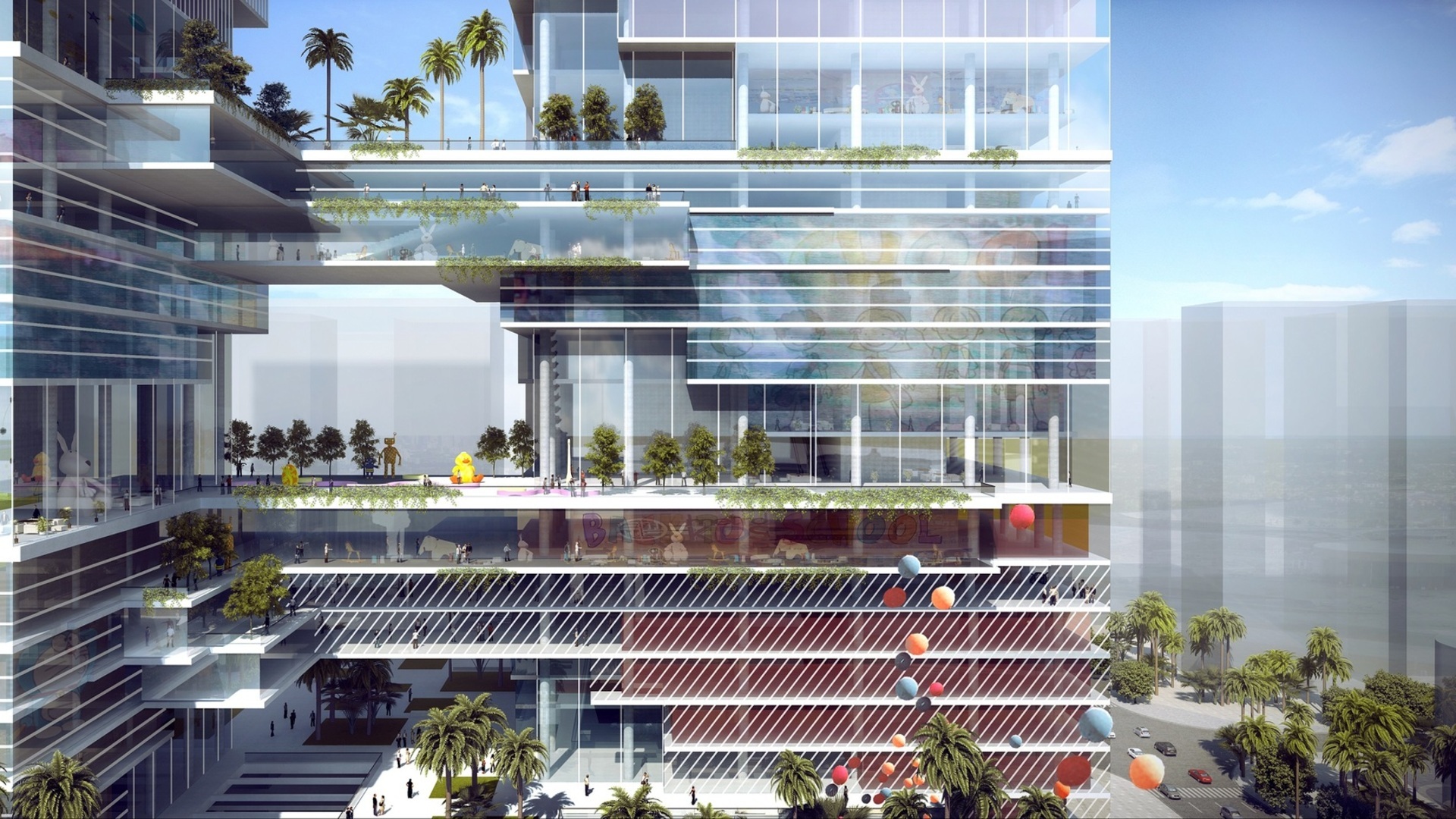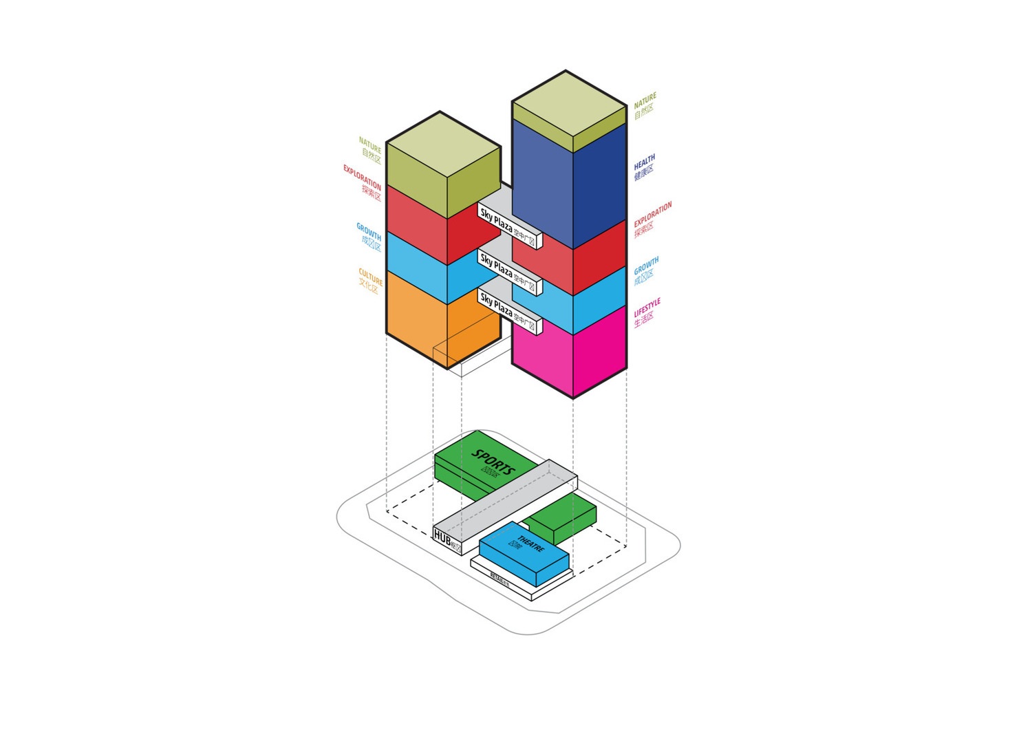 Ein 160 Meter Turm und ein weiterer 220 Meter Turm bilden das Ensemble. Auf bestimmten Ebenen sind die beiden Gebäude durch große Brücken verbunden. Die Brücken markieren den Wechsel zwischen zwei verschiedenen Raumprogrammen wie Wachstum, Kultur oder Erforschung und verbinden die Türme in den Lobby-Ebenen. Sie dienen auch als Unterstützung zur Zirkulation innerhalb jeder Zone und durch die Türme. Die Türme beherbergen mehrere Hohlräume innerhalb ihres Kerns sowie in verschiedenen Bereichen entlang der Fassade. Sie schaffen sowohl aufregende Innenräume als auch eine einzigartige Fassadenkonfiguration. Diese reflektiert die inneren Abläufe und Vorgänge, die von seinen Hauptnutzern, den Kindern, beeinflusst werden.