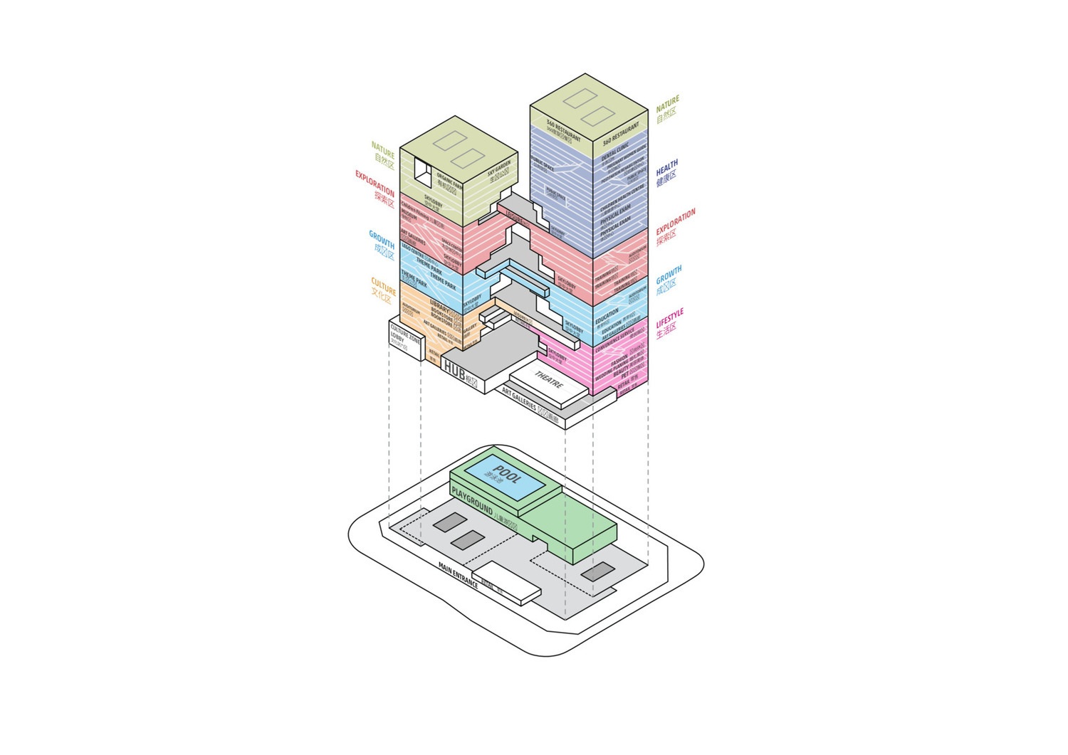 Aufgrund des anspruchsvollen funktionalen Programms ist die Gebäudestruktur höchst komplex. Ziel war es, spielerisches Lernen und Erziehung in einem benutzerorientierten Raumgefüge zu kombinieren, das auch in einem Hochhaus funktioniert. Darüber hinaus galt das Prinzip, alle Programme durch die Augen eines Kindes zu betrachten. Die architektonische Typologie orientiert sich an populären Videospielen, die sowohl für Kinder als auch für Erwachsene anspruchsvoll und herausfordernd sind. Begriffe wie „Mehrfachebenen", „Himmelsplatz" und „Epizentrum" wurden weiter erforscht und in das Design des Neubaus eingebunden.