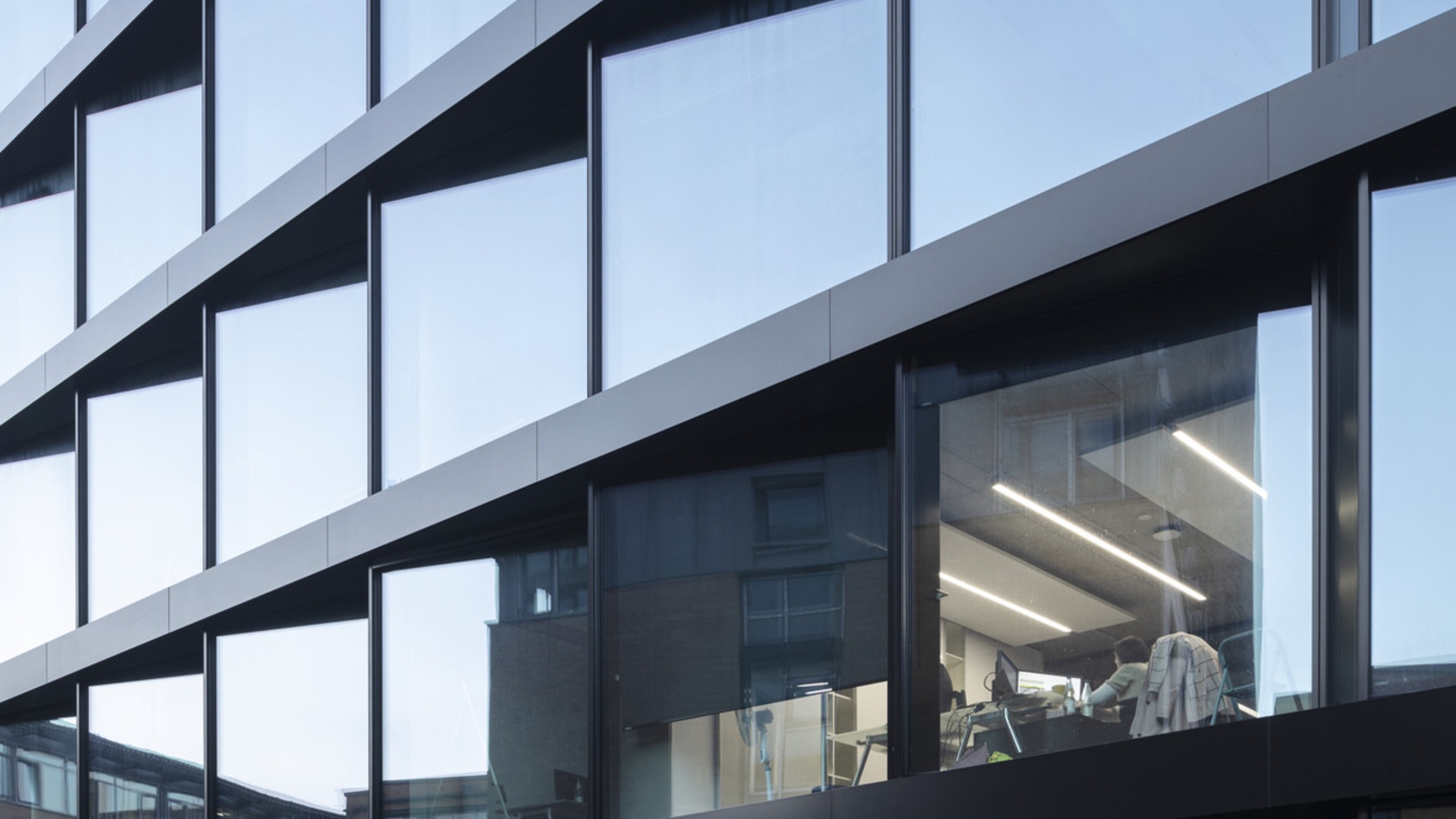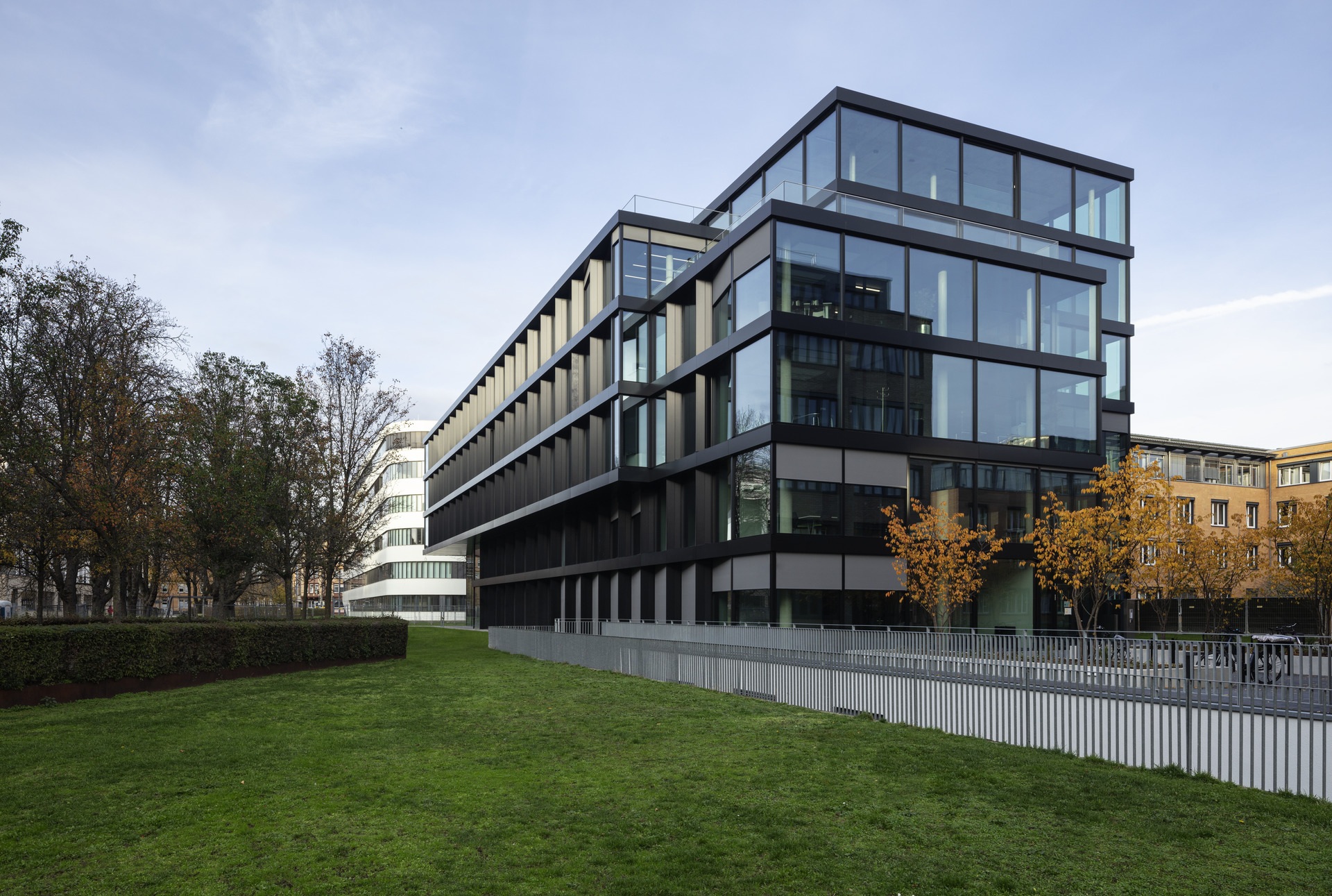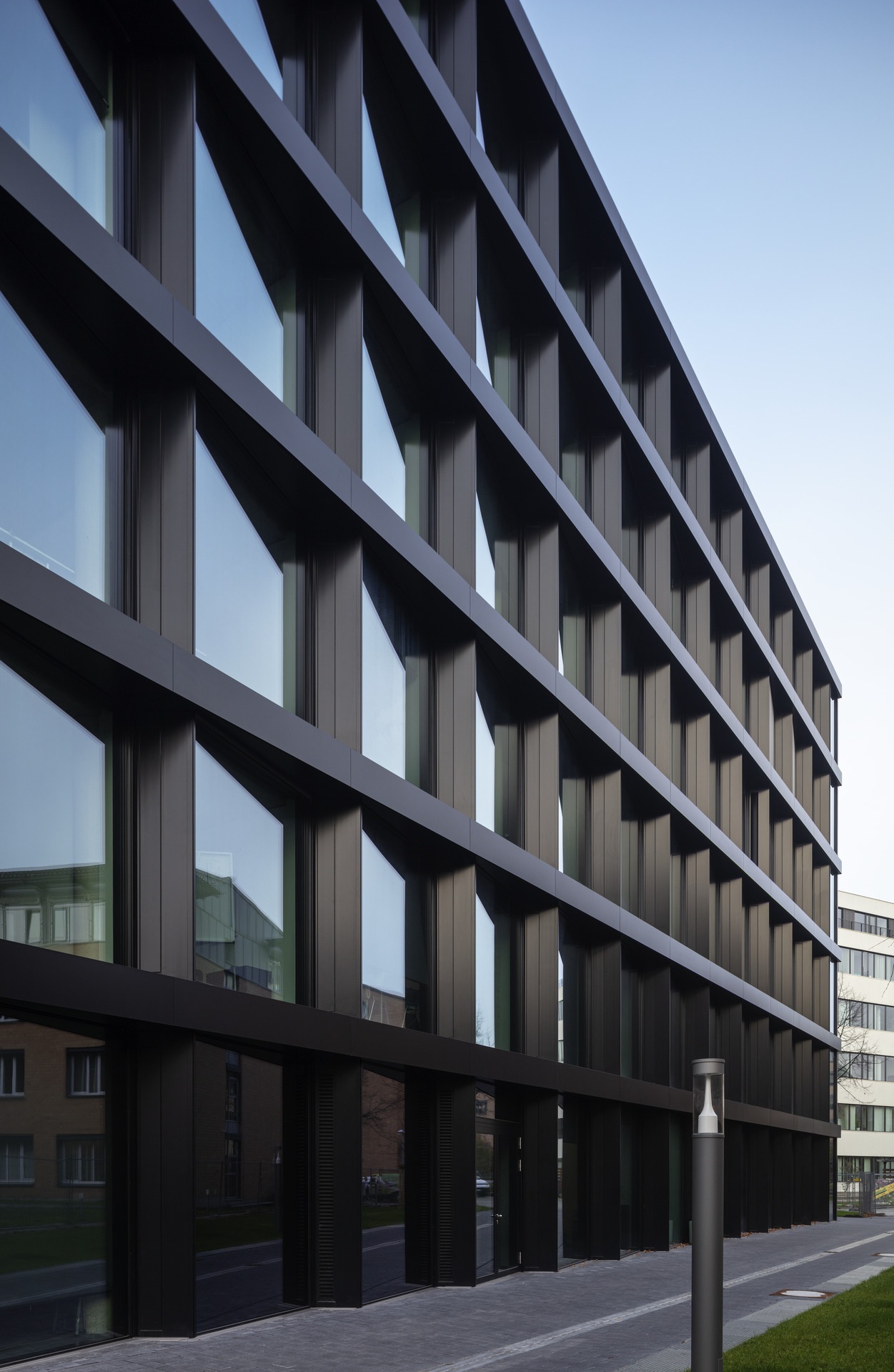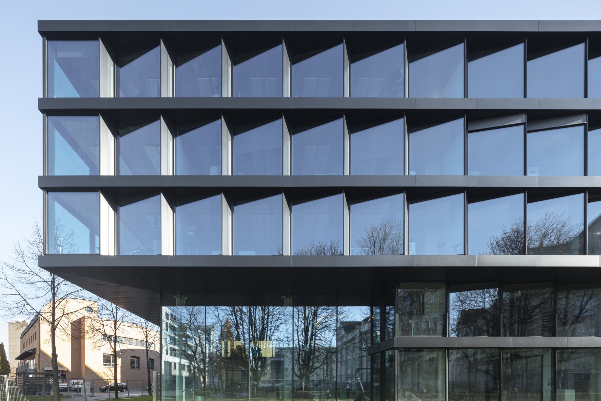 Drei ineinander geschobene und leicht versetzte Volumen bilden zahlreiche Terrassen und akzentuieren den Haupteingang auf der nördlichen Seite. Die Fassade und äußere Erscheinung des Gebäudes ist geprägt von großformatigen, feststehenden Fensterelementen, die sich in Richtung Norden auffächern und so eine Grundverschattung ermöglichen. Die gestaffelte Anordnung der opaken und transparenten Fassadenelemente verleiht dem Gebäude eine subtile Tiefe und lässt es in einem Spiel von Licht und Schatten changieren. Im Inneren ermöglichen offene, transparente Raumgefüge variierende Bürotypologien, die Bereiche für Kommunikation und Konzentration miteinander vereinen, sowohl für Kunden als auch für Mitarbeiter ein helles, abwechslungsreiches Arbeitsumfeld bieten.