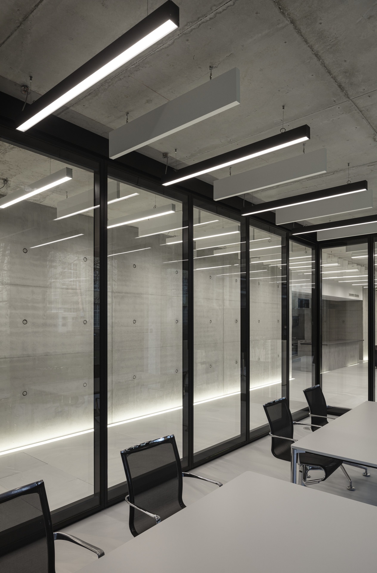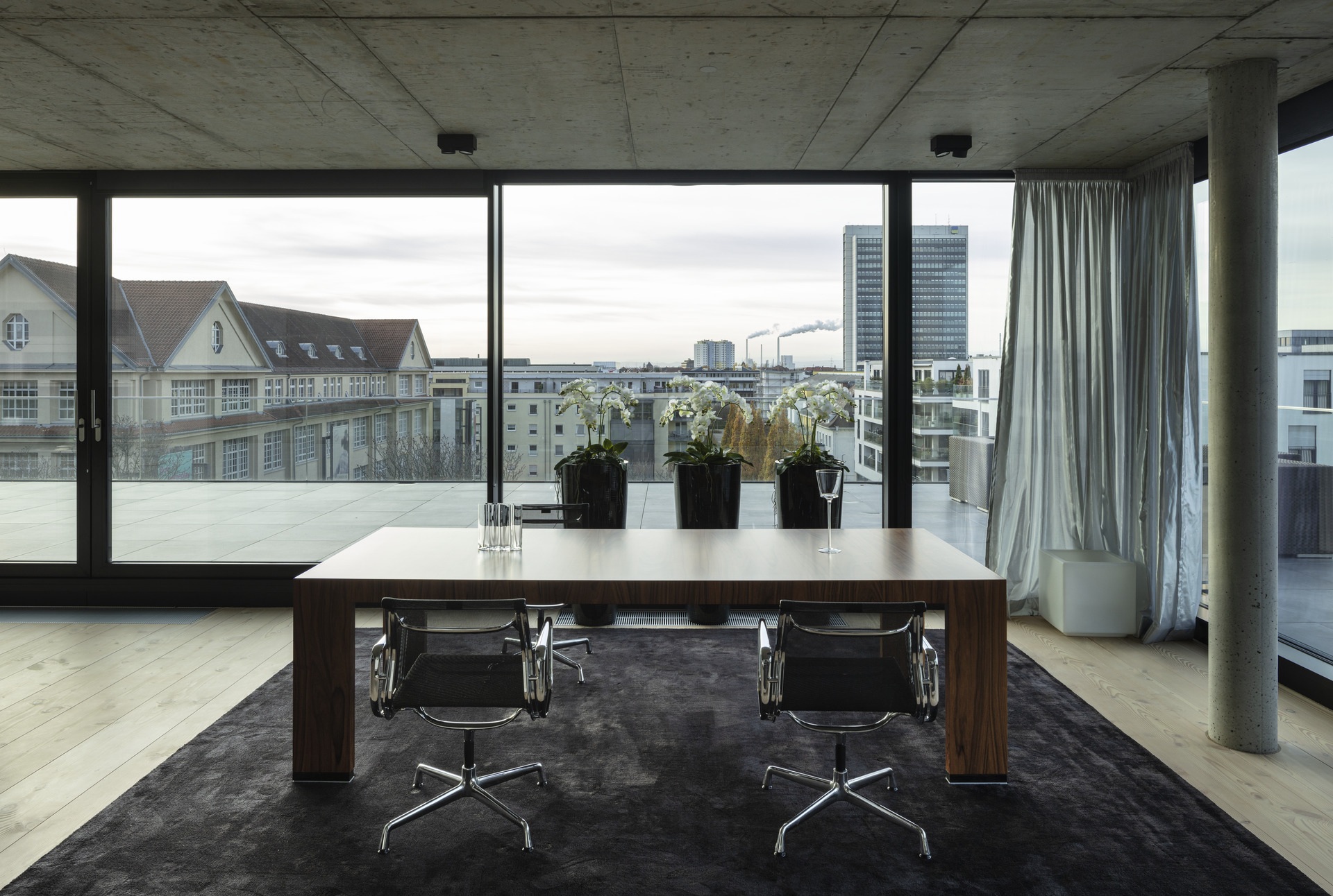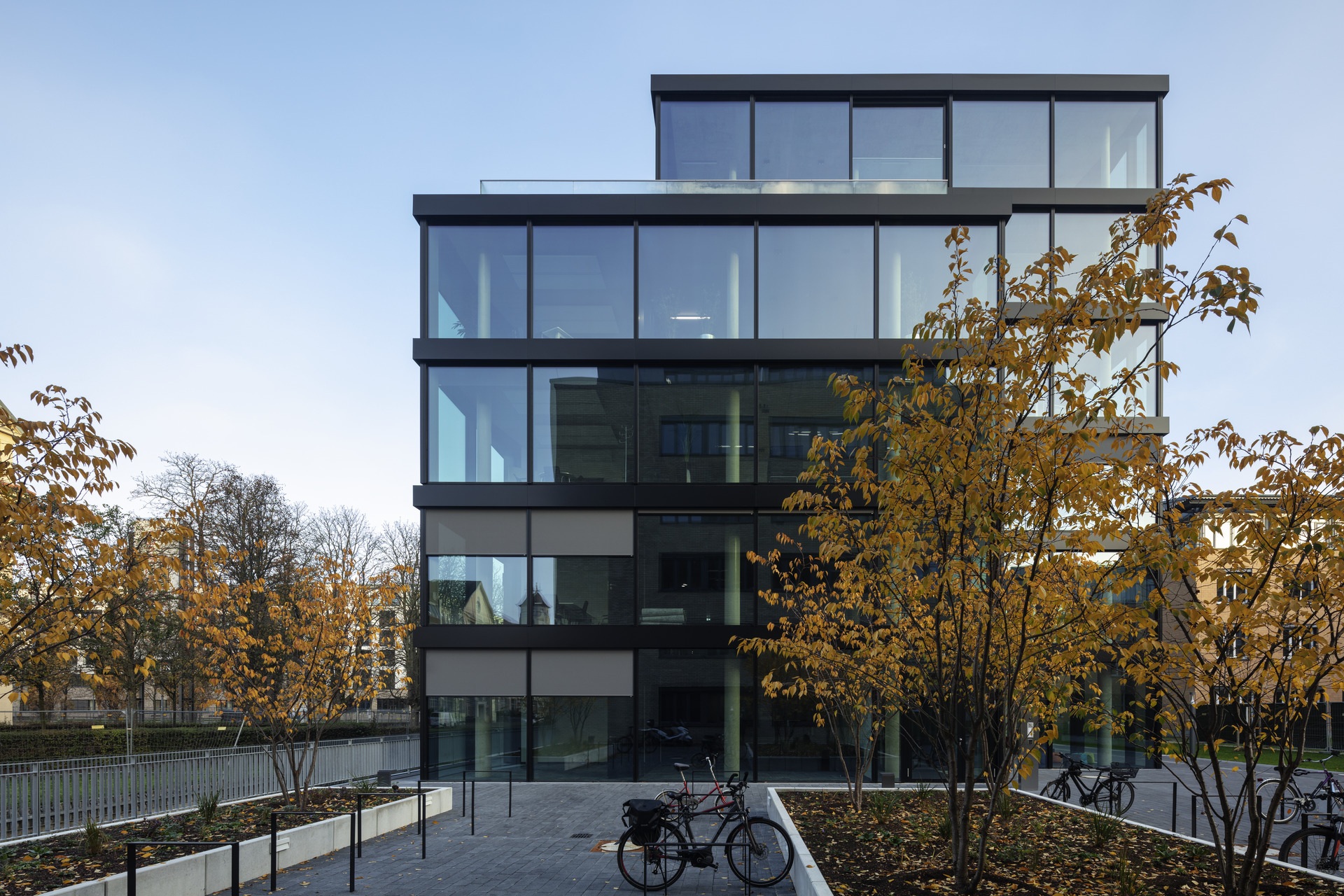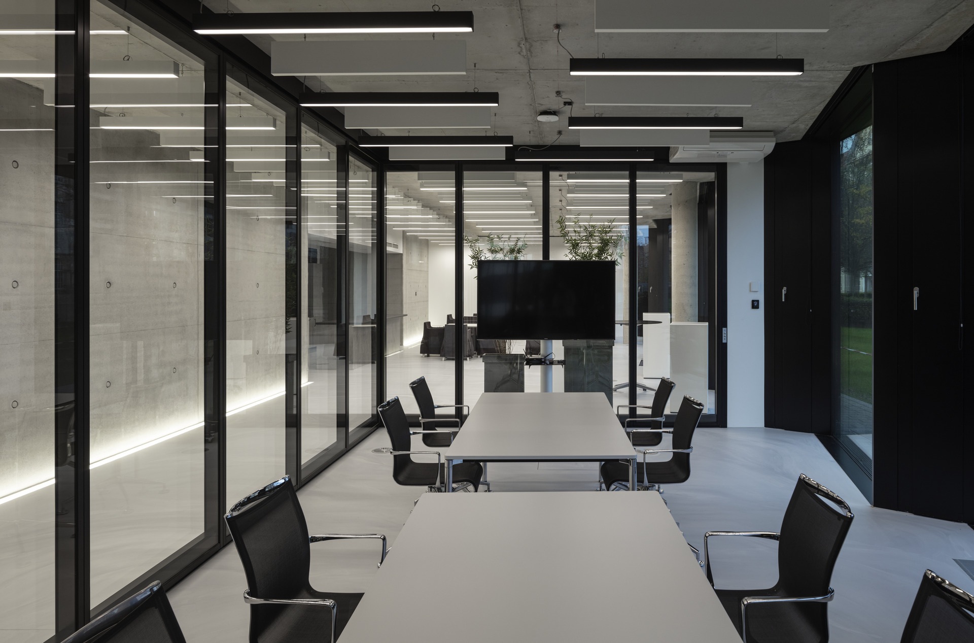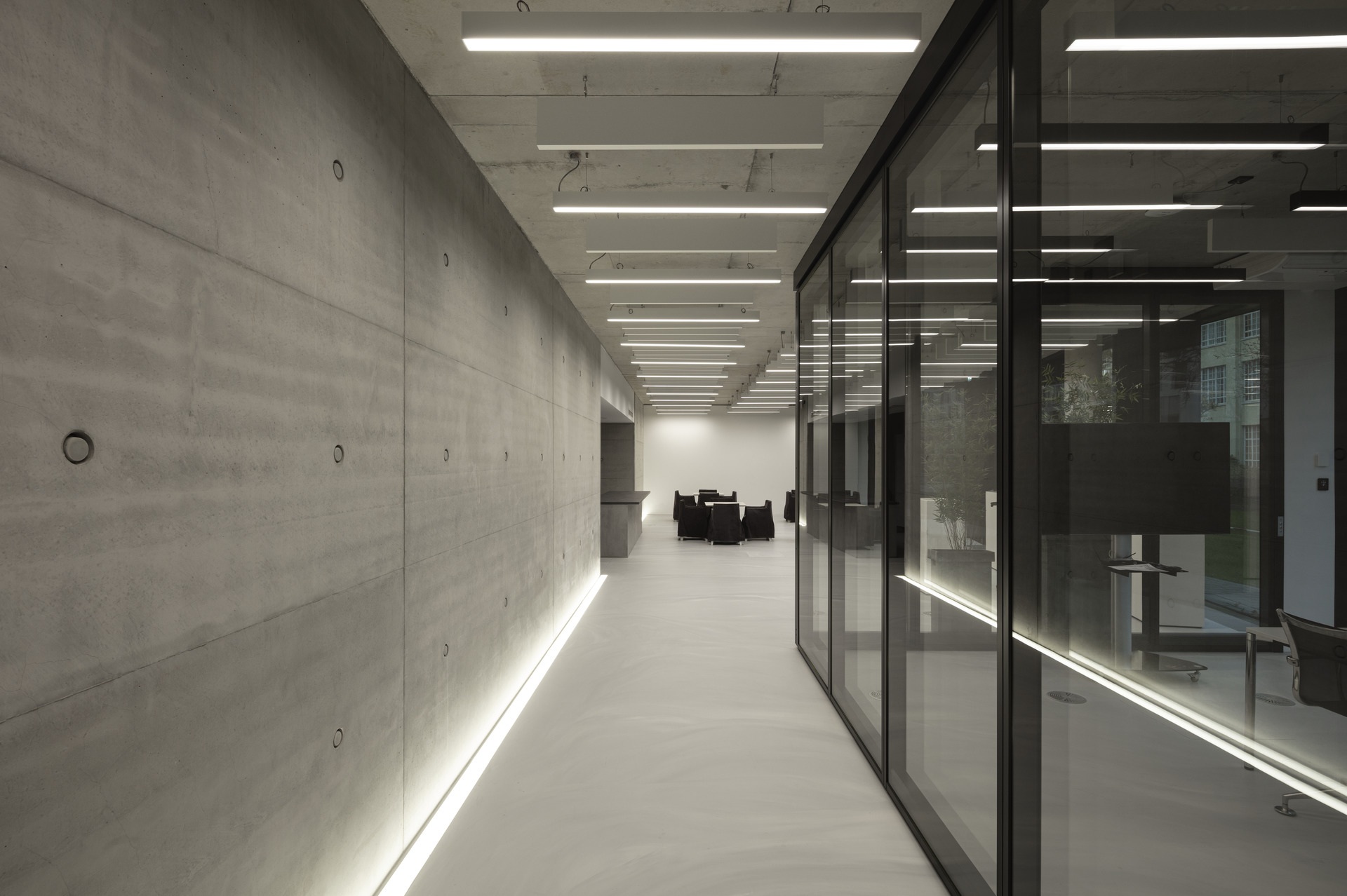 Die Boden-, Decken- und Wandoberflächen werden weitestgehend in Sichtbeton ausgeführt, die Installationen und Haustechnik verschwinden im Hohlraumboden. Damit stellt der Ausbau zusammen mit der schwarzen Metalloberfläche der Fassade ein klar definiertes, stringentes Materialkonzept dar.