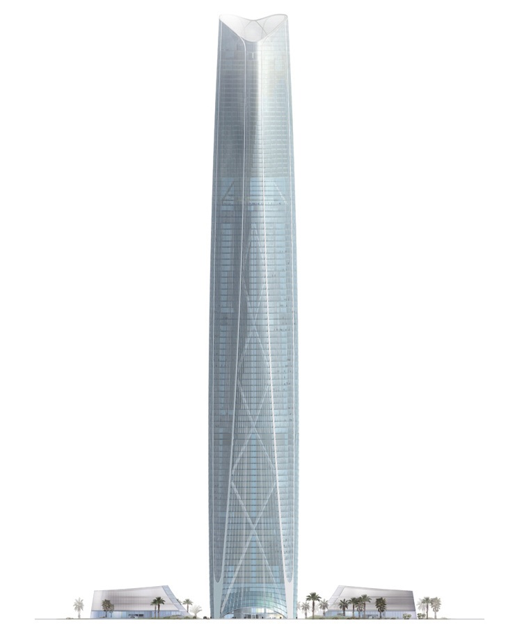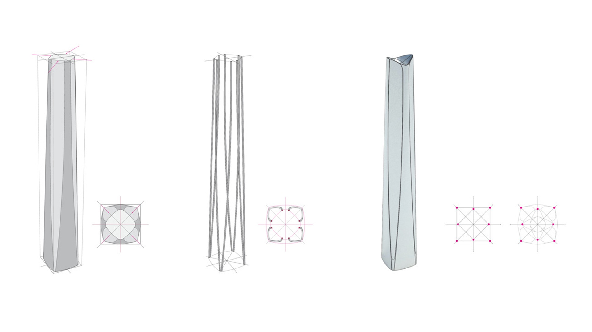 Acht Mega-Stützen, die paarweise an den Gebäudeecken positioniert sind, bilden die Primärstruktur des Towers. Sie neigen sich mit der Form des Turms, lösen sich voneinander und laufen an der Turmspitze wieder zusammen.