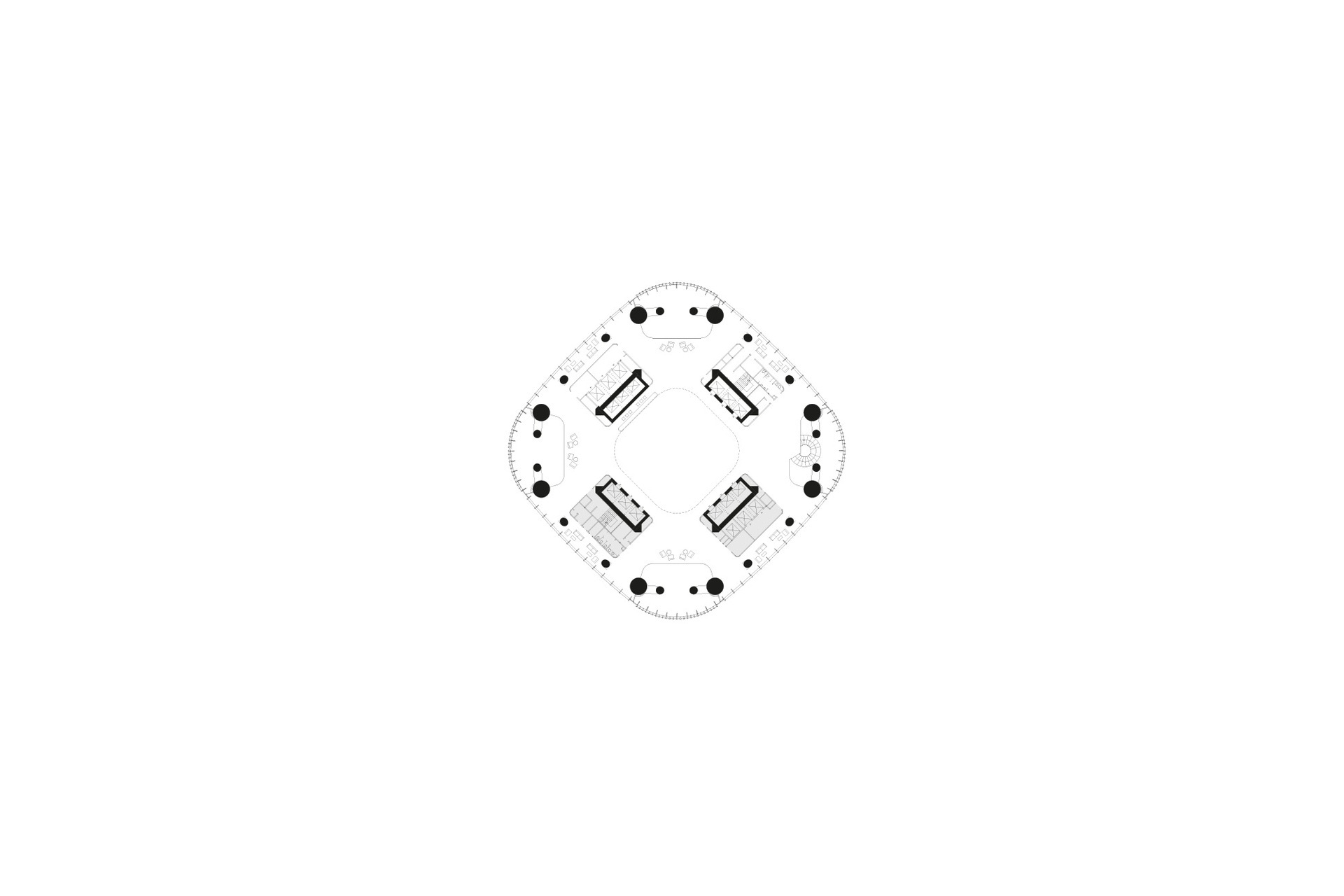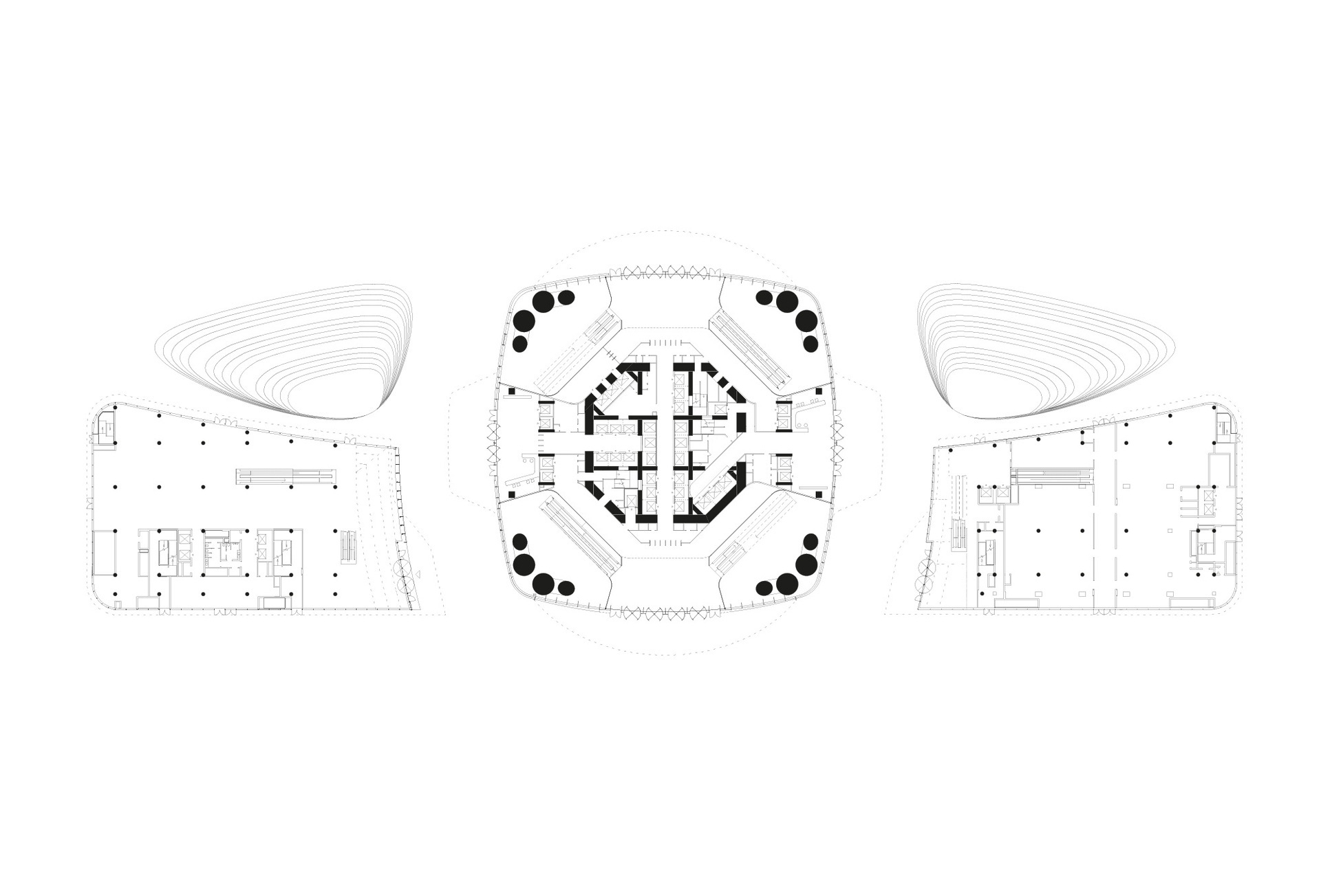 Die Sekundärstruktur ist unmittelbar aus dem Raumprogramm abgeleitet. Während die Büros im unteren Teil flexible und großzügige Räume erfordern, erhalten die Hotelzimmer im oberen Teil einen ungestörten Blick über die Stadt und darüber hinaus.