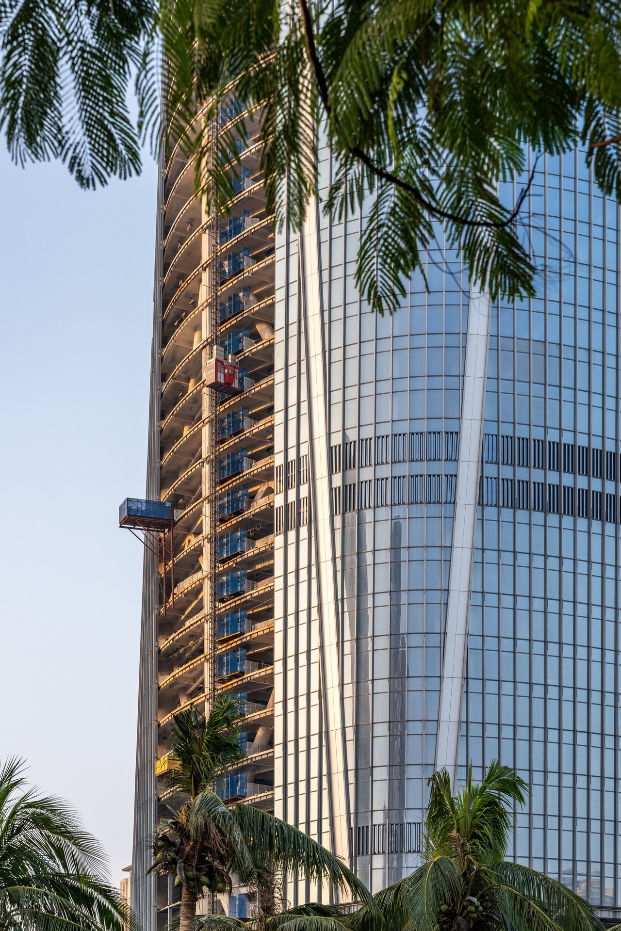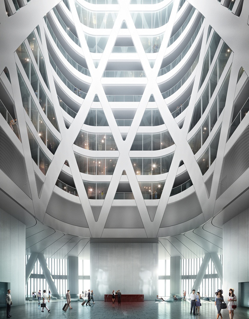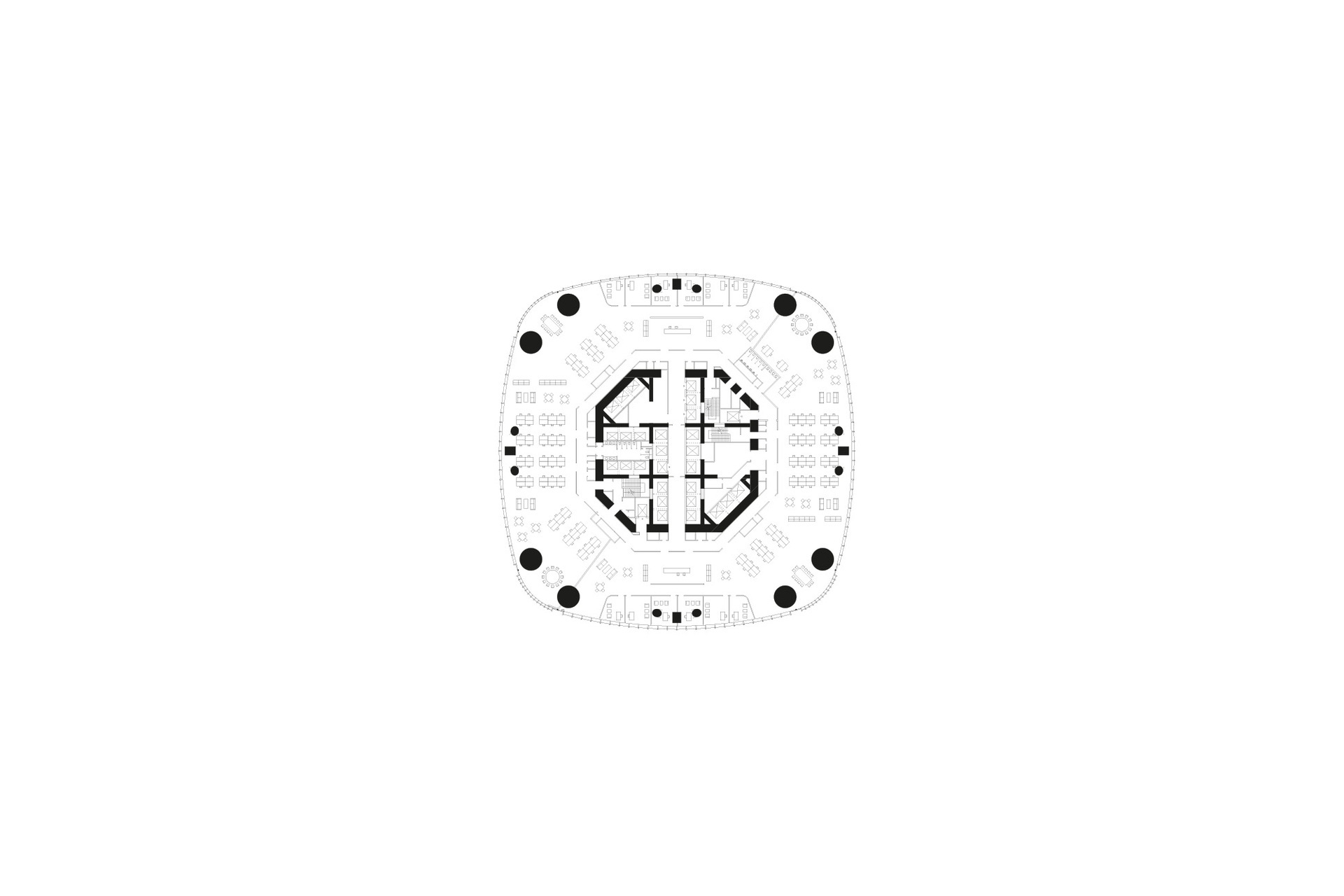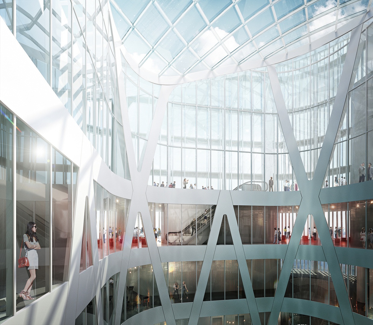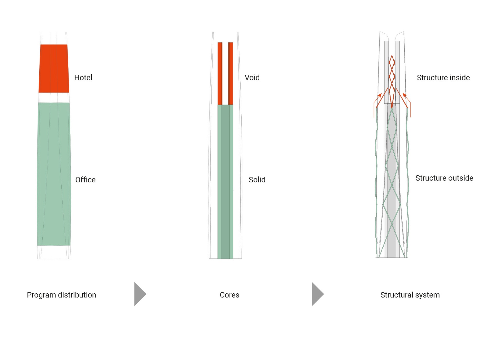 Zu diesem Zweck vollzieht sich am Übergang zwischen Büro- und Hotelnutzung ein konstruktiver Systemwechsel: Die Streben der Sekundärstruktur liegen im unteren Bereich außen, wodurch im Inneren ein stützenfreier Raum entsteht. Im 68. Stockwerk werden die Streben von außen nach innen geführt, um eine uneingeschränkte Aussicht für die Hotelzimmer in den obersten Etagen zu gewährleisten. Gleichzeitig öffnet sich der tragende zentrale Kern zu einem Atrium.