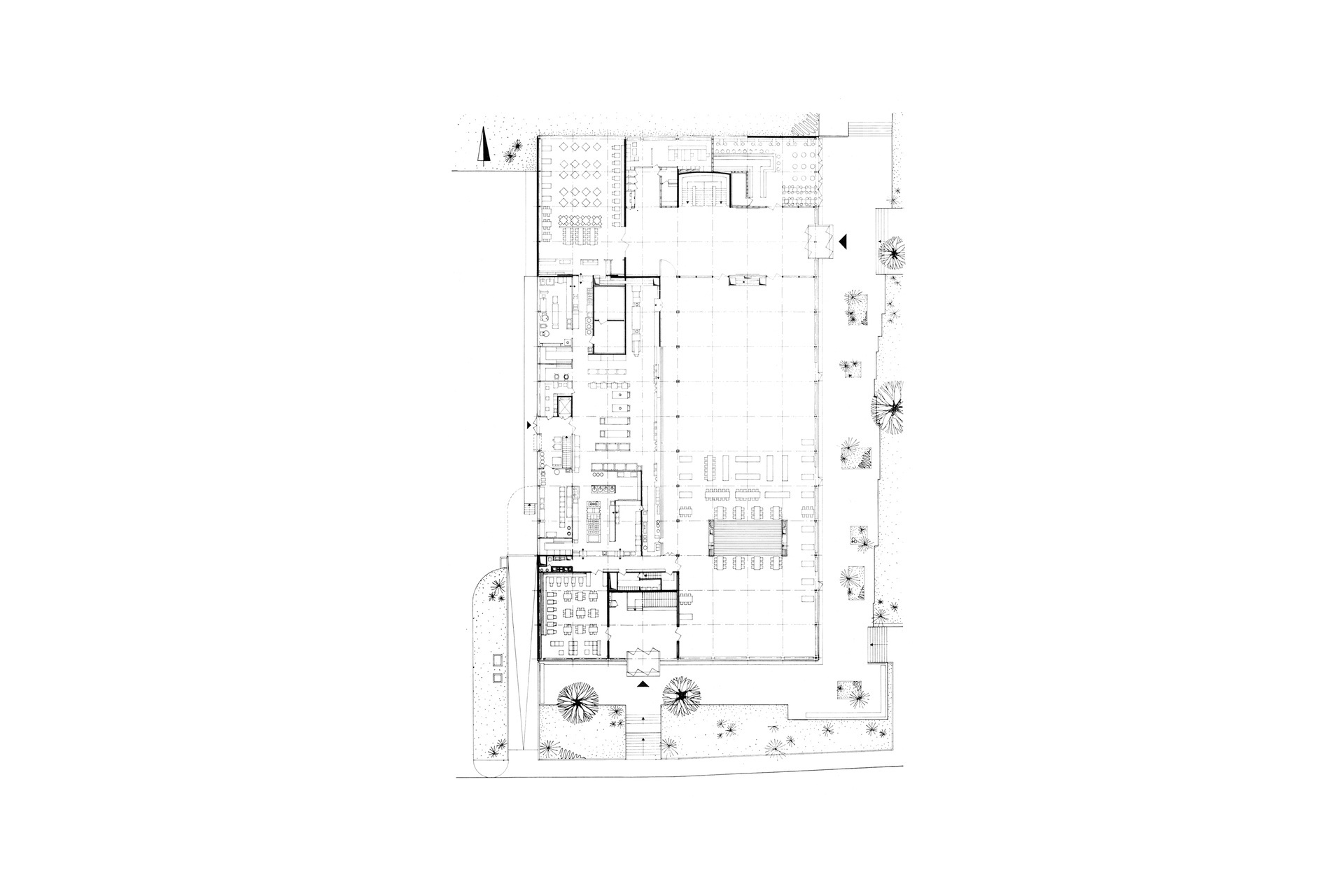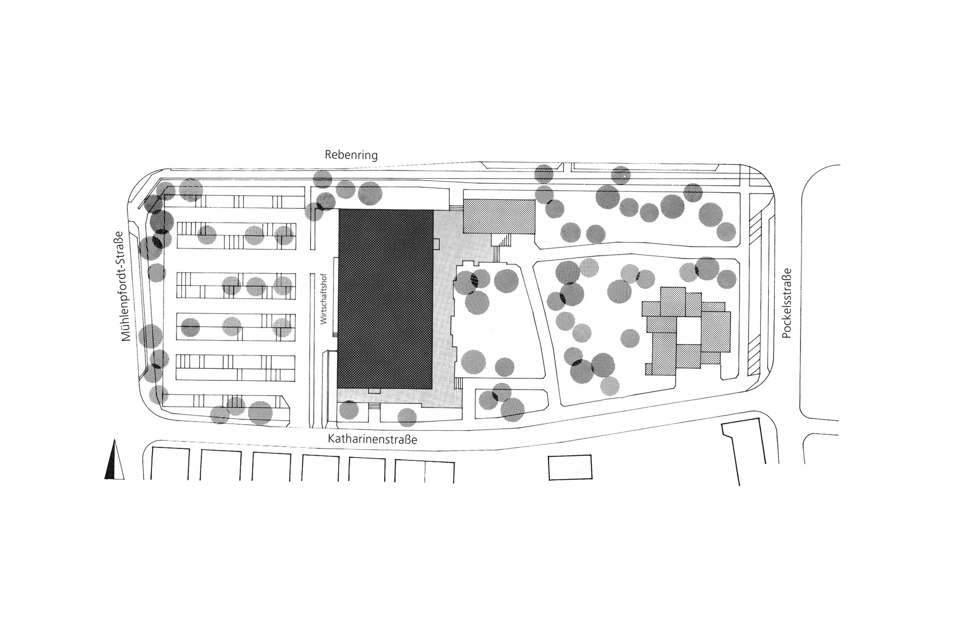 Die in der ersten Bauphase errichtete Mensa öffnet sich zur parkähnlichen Anlage des aufgelassenen Katharinenfriedhofs. Ihr langgestreckter, eingeschossiger Baukörper steht in wirkungsvollem Kontrast zum alten Baumbestand. Die Verwendung von nur drei Materialien – Aluminium, Stahl, Glas – an der zum Park orientierten Ostfassade unterstreicht die strenge, sachlich-reduzierte Gliederung des Bauwerks und lässt den Unterschied zwischen Gebautem und Gewachsenem noch deutlicher werden. Im Inneren ist die Mensa in mehrere Speisesäle untergliedert, nicht nur um den Eindruck einer Massenabspeisung zu vermeiden, sondern auch aus funktionalen Überlegungen heraus. Im Vorfeld durchgeführte Funktionsstudien hatten ergeben, dass alle Speiseräume und die dazugehörigen Küchen auf einer Ebene liegen sollten. So sind alle Speiseräume um einen großen Küchenkern angeordnet, wobei die beiden großen Säle zum Park orientiert sind und mit ihren vorgelagerten Terrassen eine unmittelbare Verbindung zum Grünen erzeugen. Im Untergeschoss, ausgeführt als Stahlbetonskelett, befinden sich Garderobe, Nebenräume, eine Kegelbahn und Tischtennisräume. Das Erdgeschoss wurde als Stahlkonstruktion realisiert und besteht aus 16 Fachwerkbindern mit einem Abstand von je fünf Metern. Sie überspannen zwei Felder von 19,75 Meter, wodurch Küchen und Speisesäle von allen Stützen und tragenden Wänden frei gehalten werden konnten.