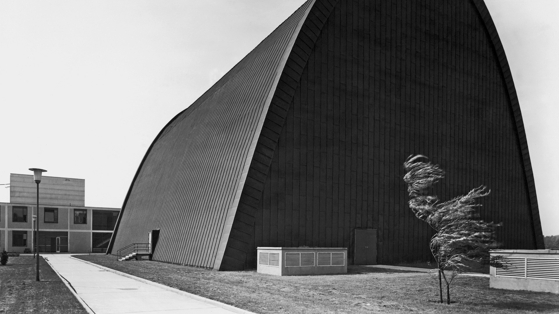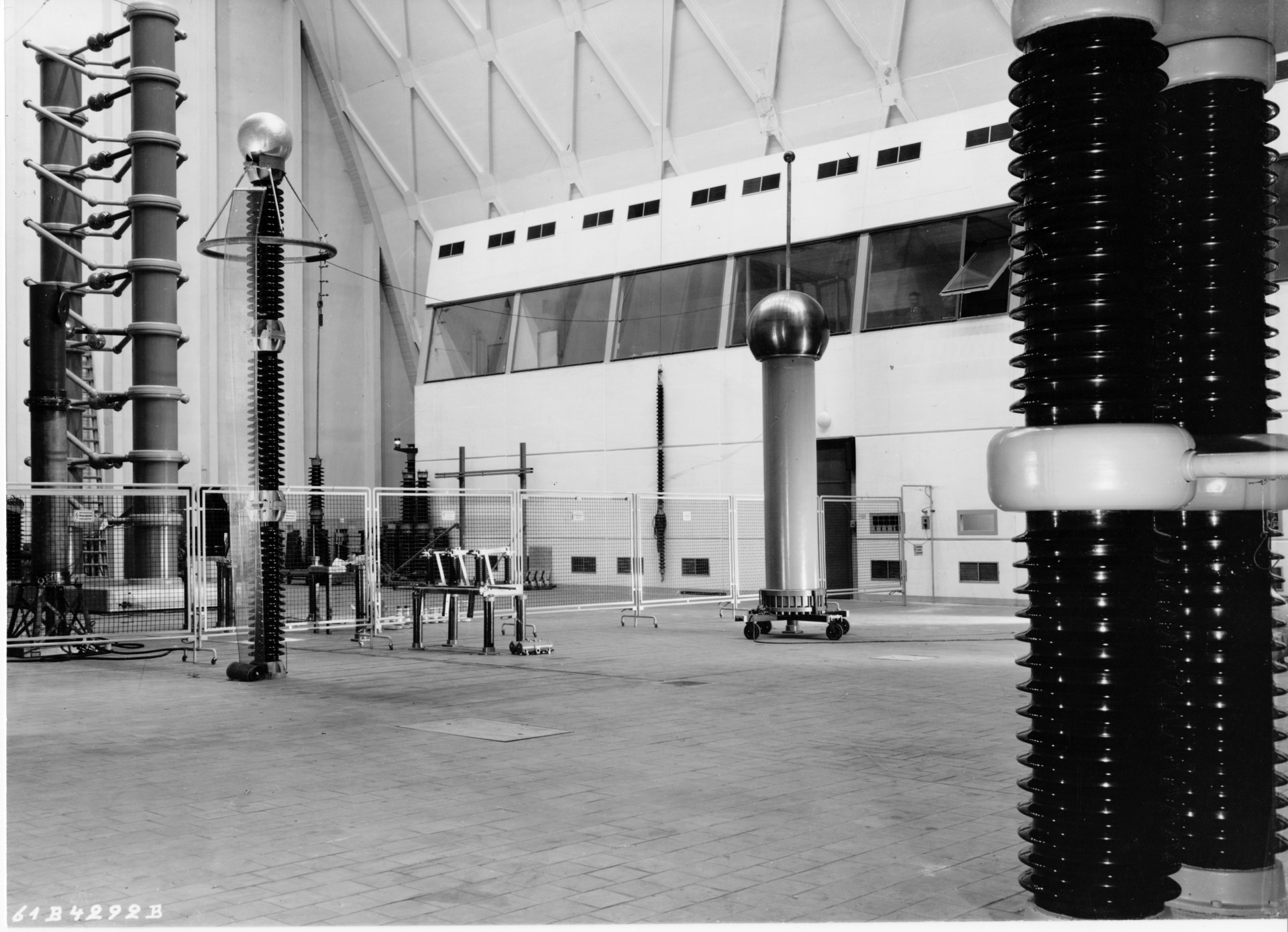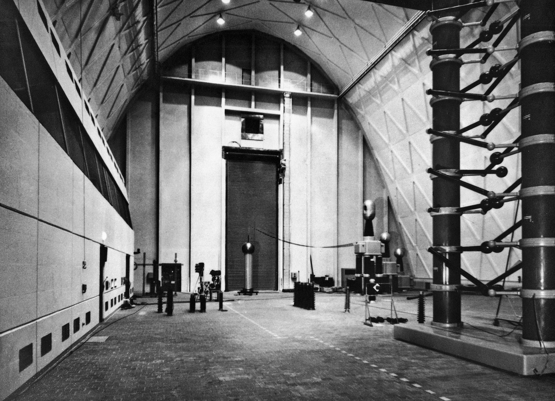 Die große Hochspannungshalle, die – durch einen Zwischenbau verbunden – rechtwinklig an das Laborgebäude anschließt, stellte eine besondere Herausforderung dar. Ihre Form und Dimensionen wurden von dem Ausmaß des Spannungskreises bestimmt, wodurch ungenutzter Luftraum im oberen Drittel der Halle vermieden und zusätzliche Nutzfläche am Boden gewonnen werden konnte.