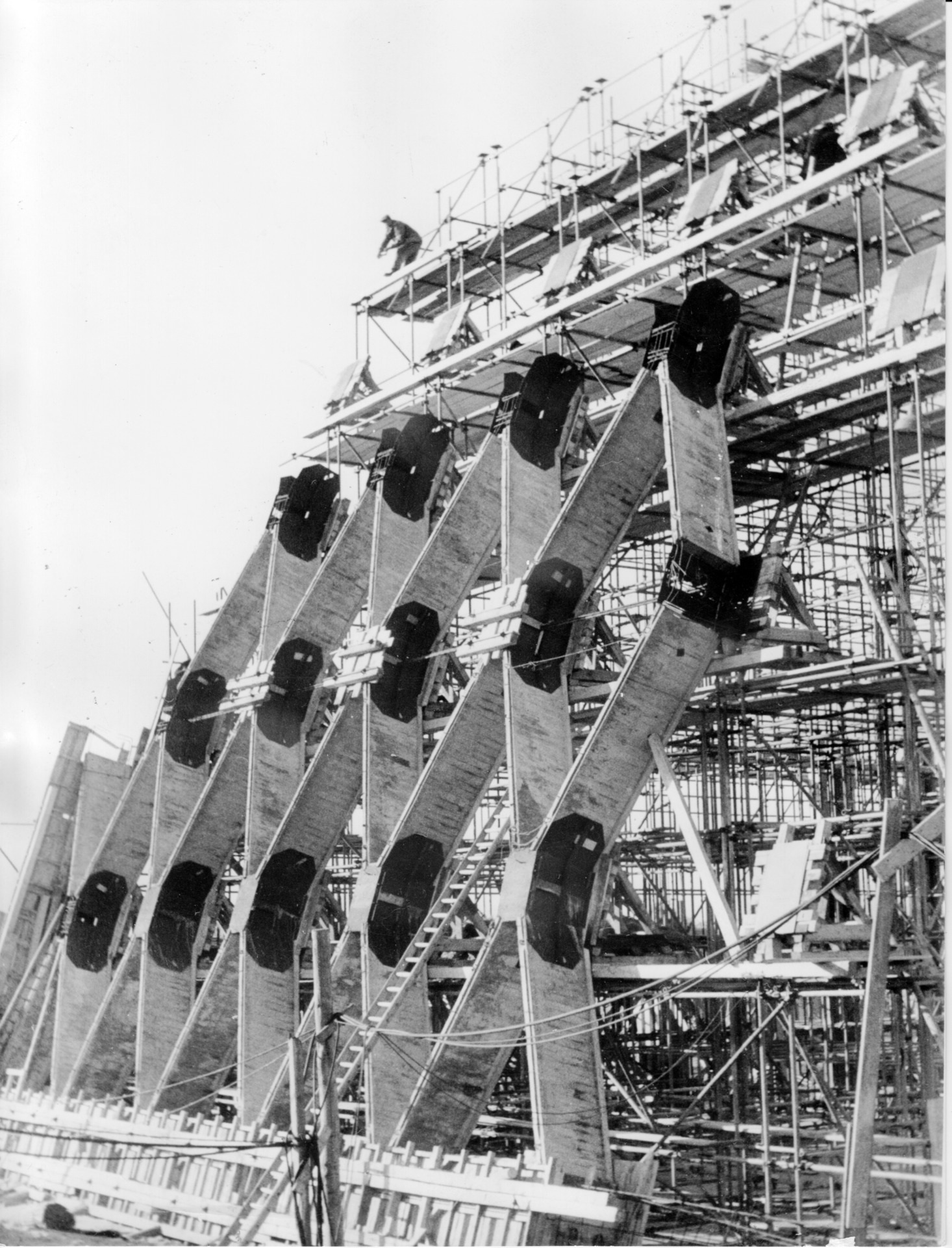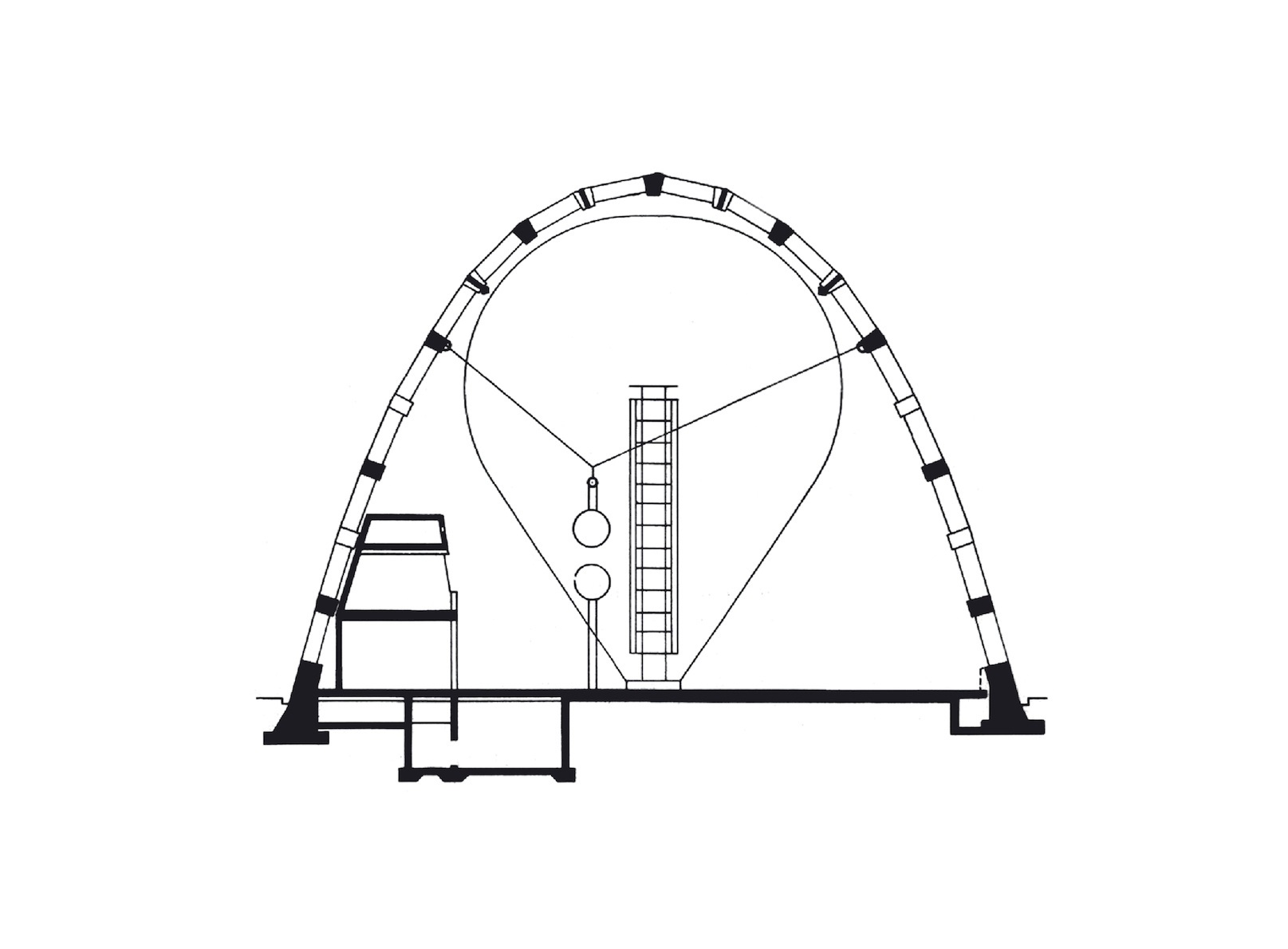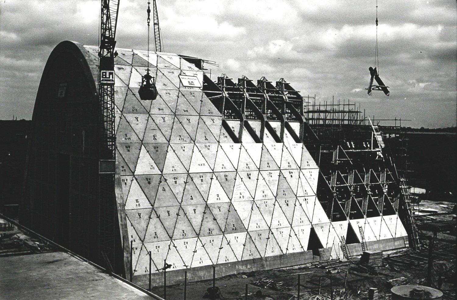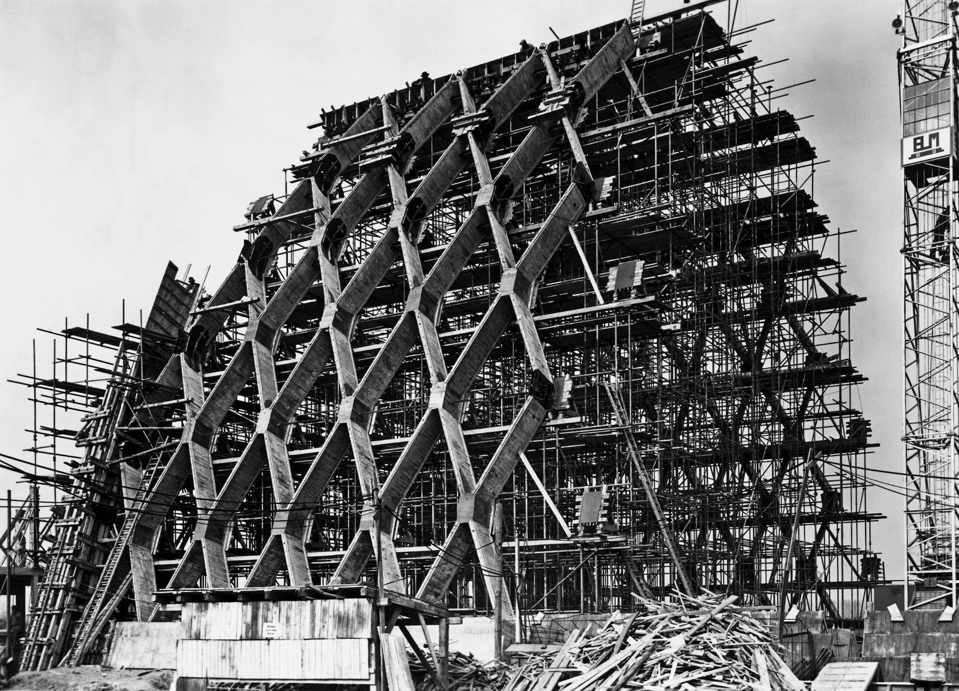 Die Strukturierung des Gewölbes in ein Rautenfachwerk wurde mit der ausführenden Firma Beton- & Monierbau entwickelt. Es ermöglichte, die gesamte Halle im Wesentlichen aus nur zwei verschiedenen Stahlbeton-Fertigteilen herzustellen, nämlich aus T-förmigen Balken und aus dreieckförmigen Füllungsplatten.
