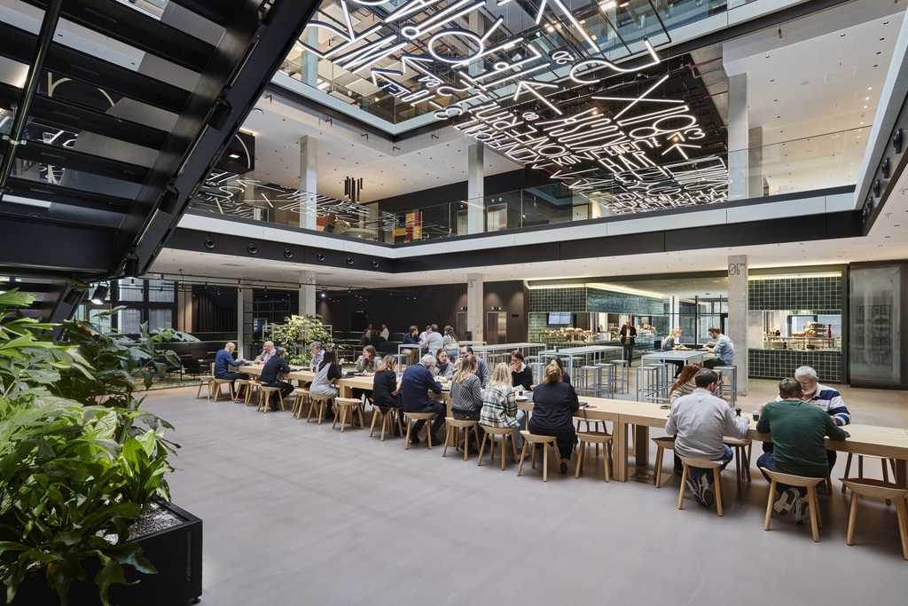 Mit gemeinsamen Bereichen für fokussiertes und kollaboratives Arbeiten, mit Orten um sich sozial zu vernetzen, gemeinsam zu essen oder auf der Dachterrasse zu entspannen.