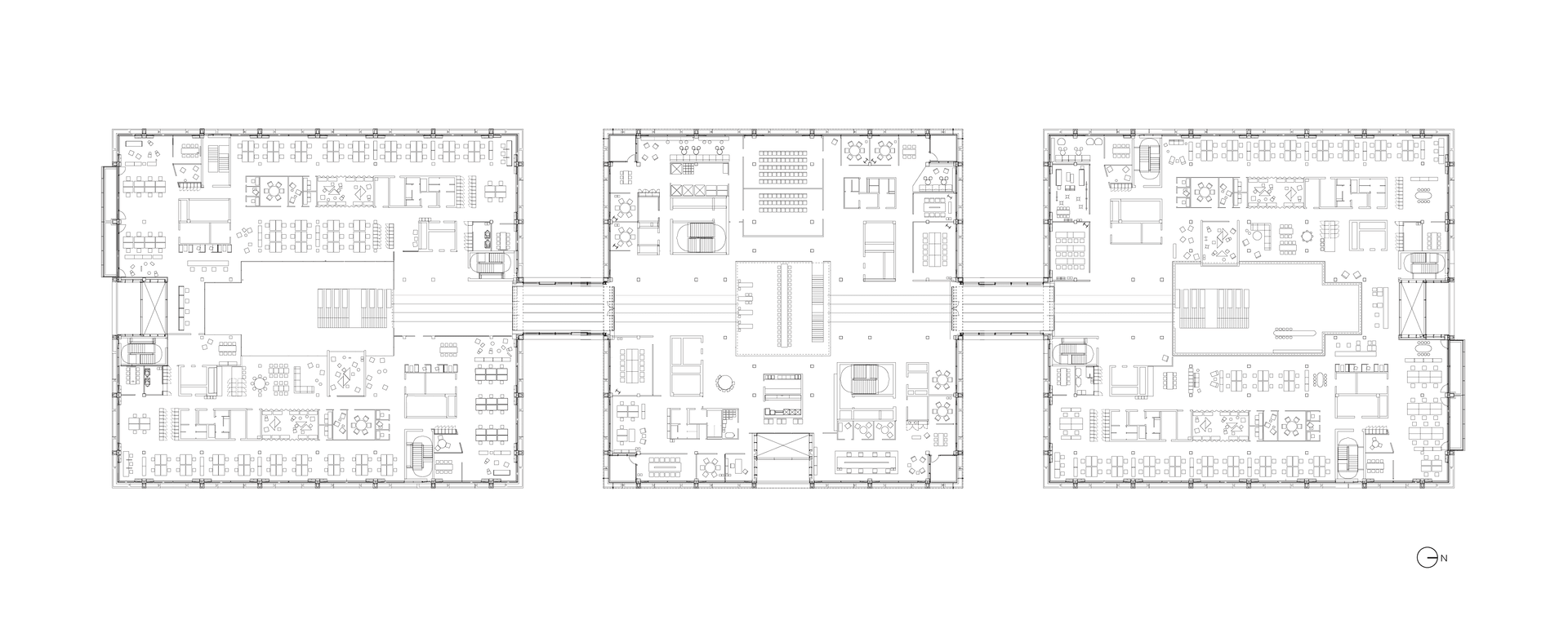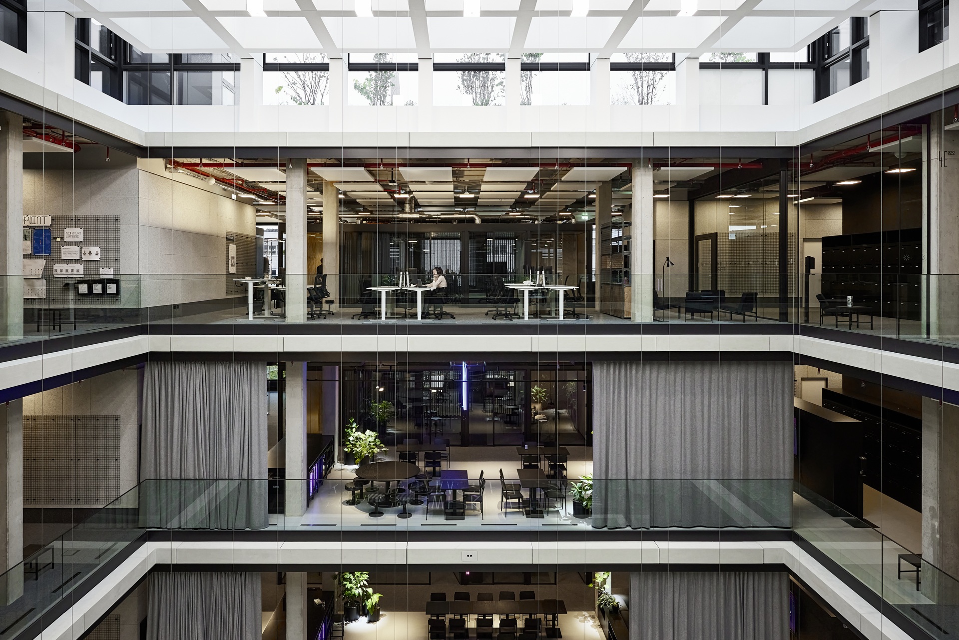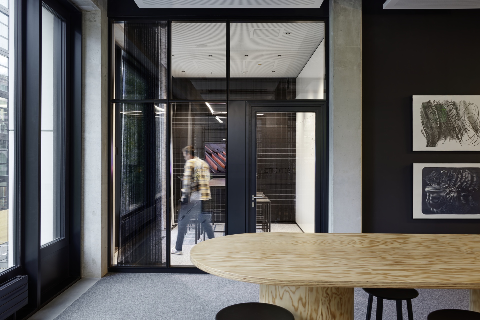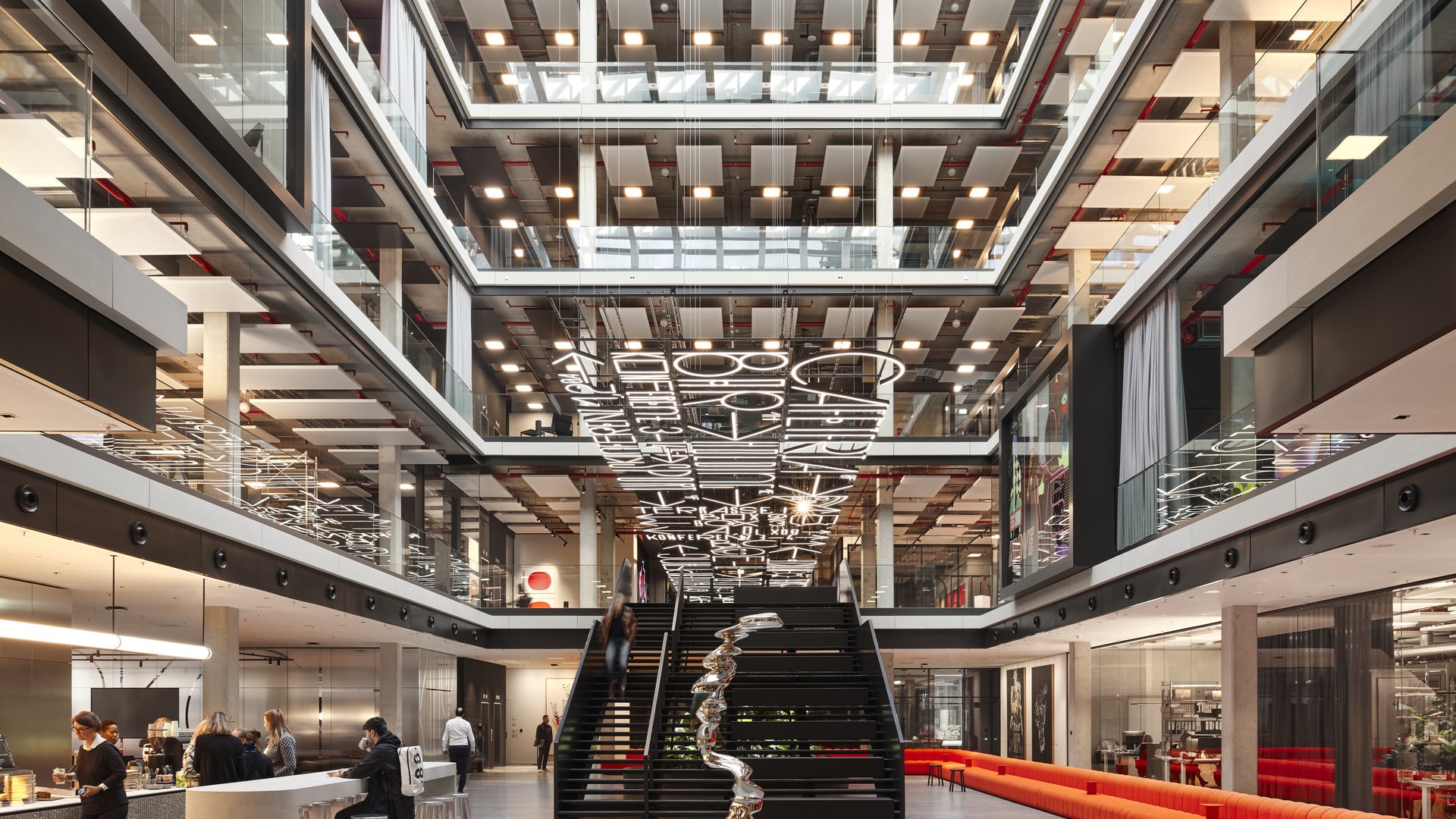 In den zum Atrium hin offenen Büroetagen hat HENN Interior Orte der Begegnung für unterschiedliche Arbeitssituationen definiert, die Menschen virtuell, aber insbesondere wieder persönlich zusammenbringen: An den lebendigsten Teil, rund um die innenliegenden Atrien, schließen sich großzügige Teeküchen und Räume für kollaboratives Arbeiten, informelle Meetings und Präsentationen an. Ganz außen, geschützt durch die Wände der Meetingräume, schließen sich die ruhigeren Arbeitsbereiche der einzelnen Agenturen an – sowie Fokusräume, Telefon- und Videomeetingboxen. Obwohl die Etagen weitgehend ohne Trennwände auskommen, sind kommunikative Bereiche und fokussiertes Arbeiten in nächster Nähe möglich – dank schallabsorbierender Wand- und Deckenpaneele sowie schwerer Filzvorhänge.
