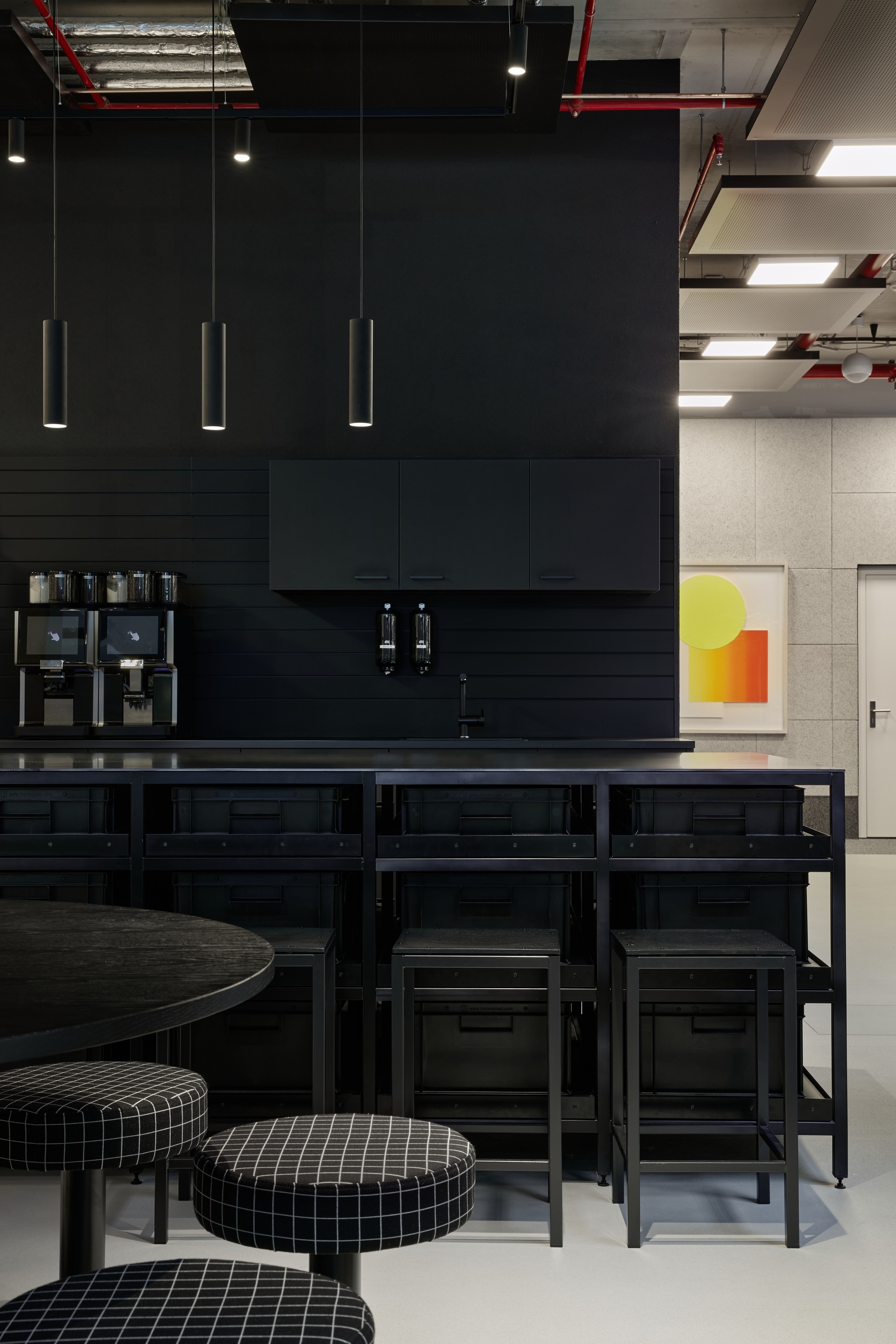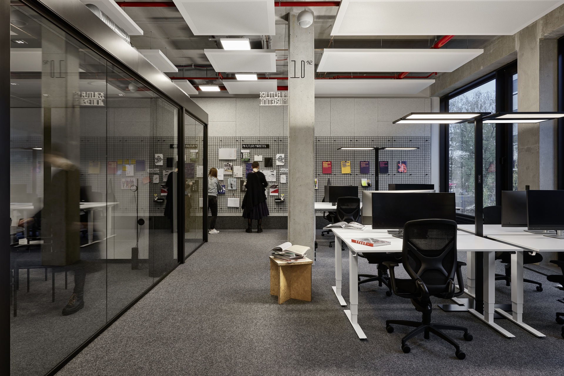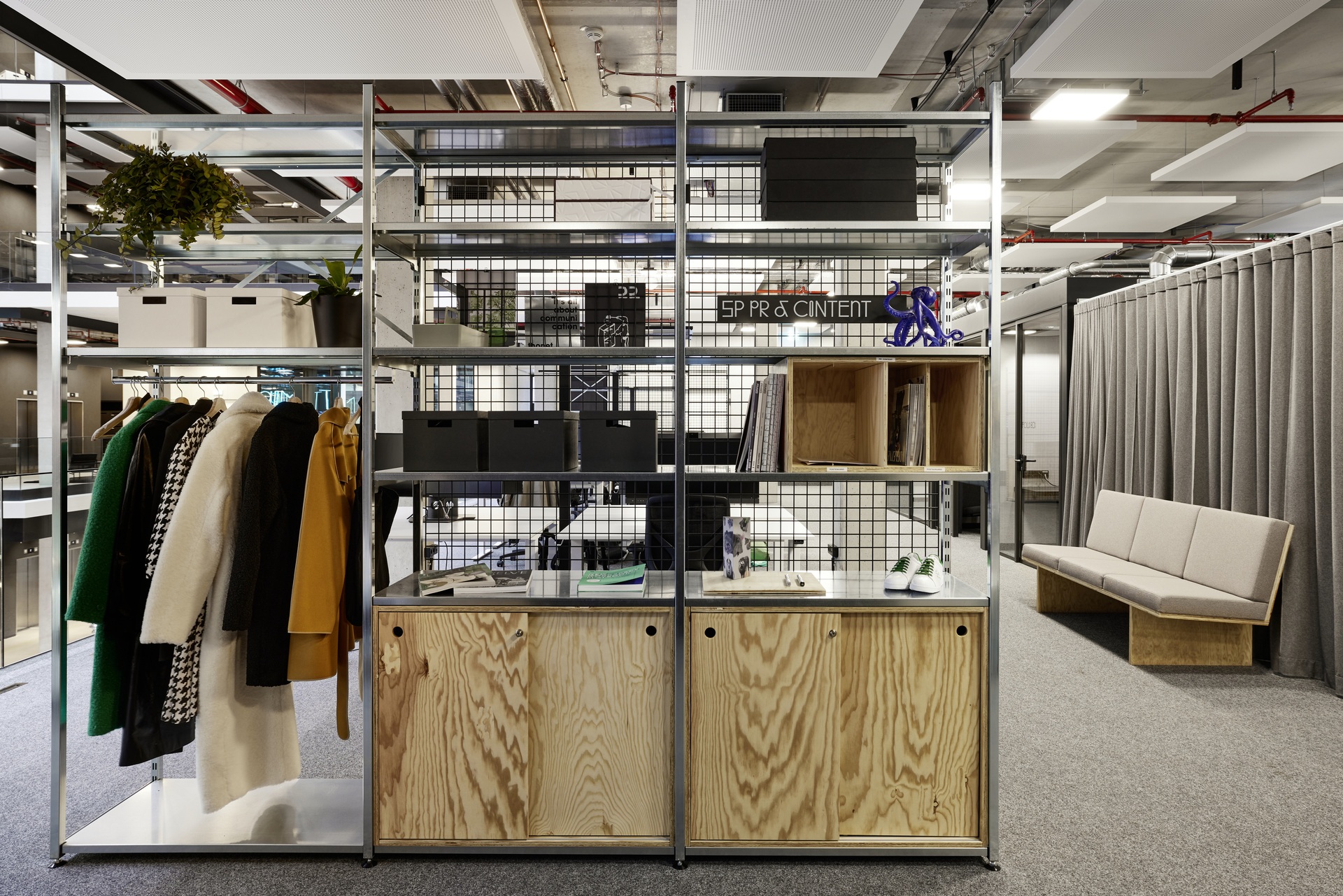 Klare Linien und eine monochrome Farbpalette in Schwarz, Weiß und Grau bilden die verbindende Basis des Gestaltungskonzepts über alle Bereiche und Agenturen hinweg. Dabei erzeugen Materialien mit industriellem Charakter und unbehandelte Oberflächen – etwa roher Stahl, Gitterroste und gebeiztes Holz – eine zwanglose und informelle Atmosphäre. Statement pieces in leuchtenden Farben und mit reflektierenden Oberflächen ergänzen das Konzept zu einer neuen visuellen Identität für Serviceplan.