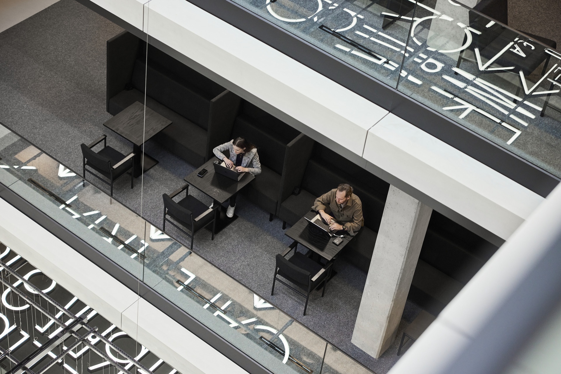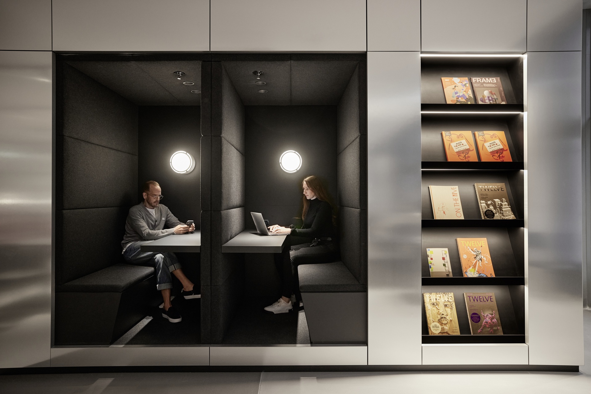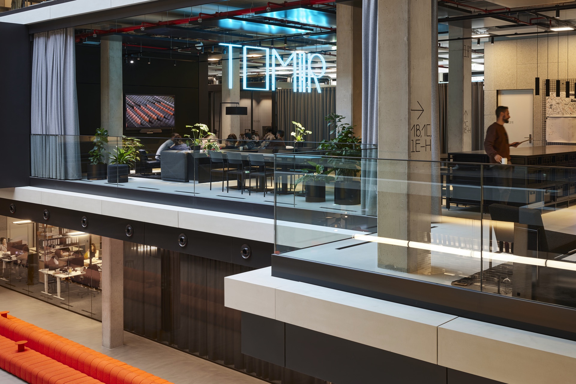 Klare Linien und eine monochrome Farbpalette in Schwarz, Weiß und Grau bilden die verbindende Basis des Gestaltungskonzepts über alle Bereiche und Agenturen hinweg. Dabei erzeugen Materialien mit industriellem Charakter und unbehandelte Oberflächen – etwa roher Stahl, Gitterroste und gebeiztes Holz – eine zwanglose und informelle Atmosphäre. Statement pieces in leuchtenden Farben und mit reflektierenden Oberflächen ergänzen das Konzept zu einer neuen visuellen Identität für Serviceplan.