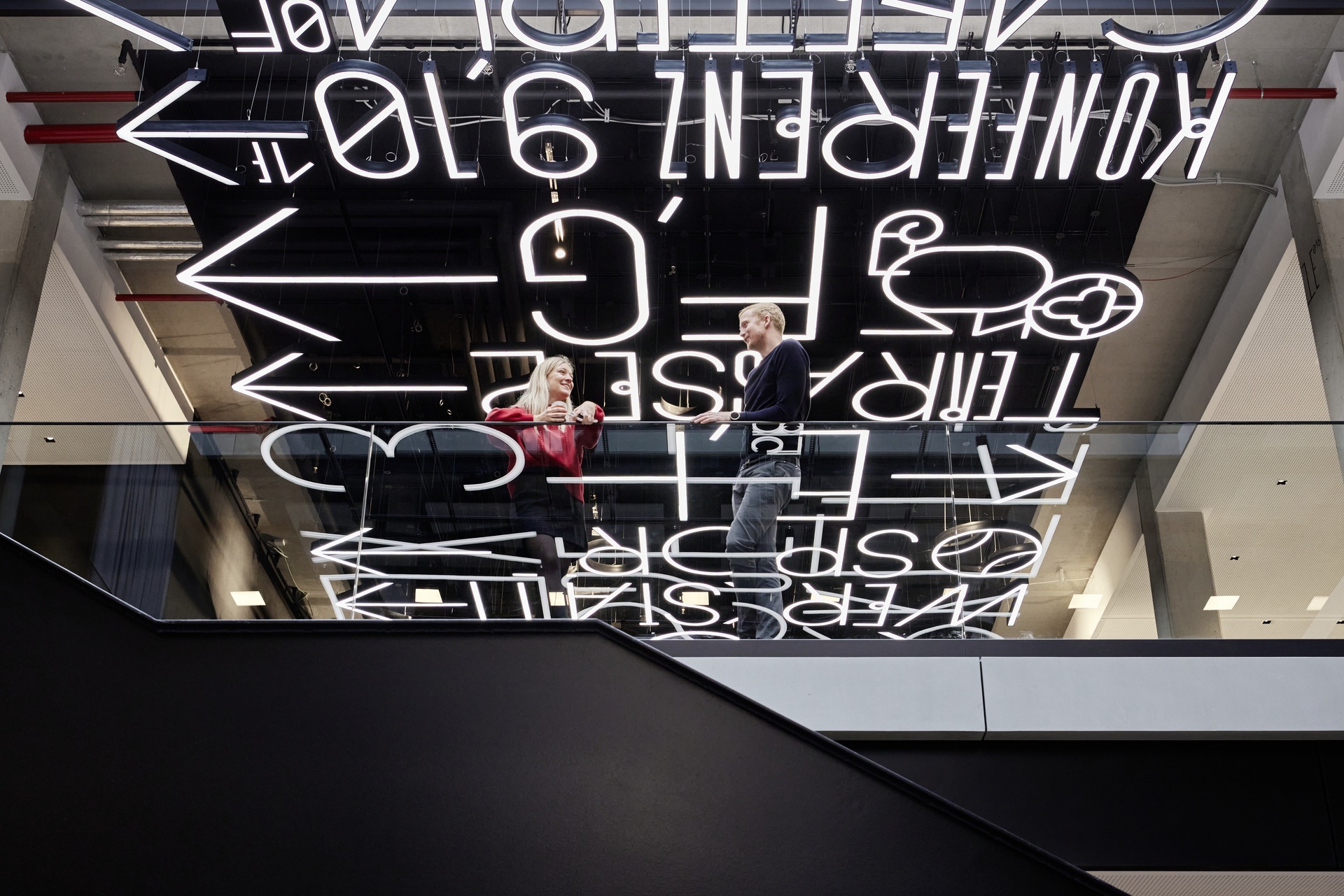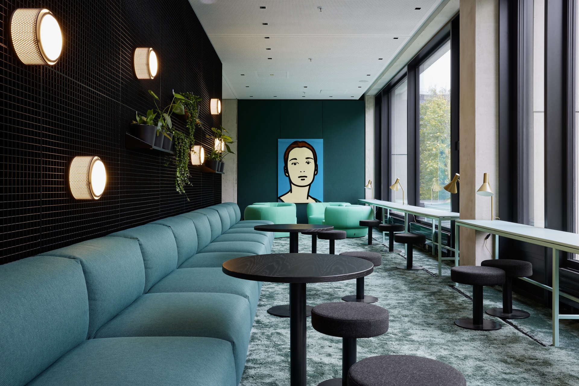 Die Idee von Kommunikation und Integration nimmt in Form von übergroßen Möbeln, die als modifizierte Einzelstücke hergestellt wurden, auch funktional Gestalt an. So finden etwa auf einem 30 Meter langen, leuchtend roten Sofa im Eingangsbereich 100 Menschen gleichzeitig Platz – 80 an der langen Holztafel in der Kantine.