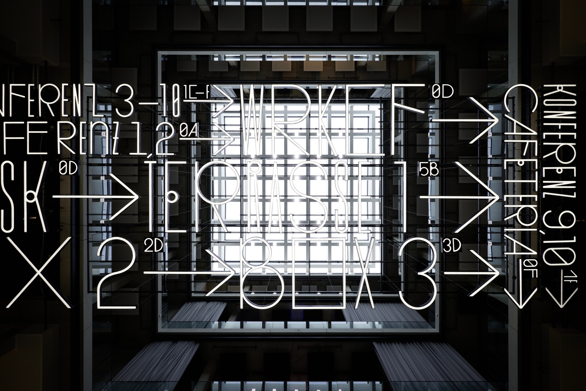 Die textilen Wandbespannungen mit einem Quadratraster in verschiedenen Farben und Größen sind eine Reverenz an die klare geometrische Architektur der Fassade. Exklusiv für die Signaletik im Haus hat das Büro Uebele eine eigene Schriftart für Serviceplan entwickelt. Sie wird überall im Haus eingesetzt – zur Orientierung and Wänden und Stützen, aber auch als typographisches Designelement in Übergröße in der zentralen Lichtinstallation.