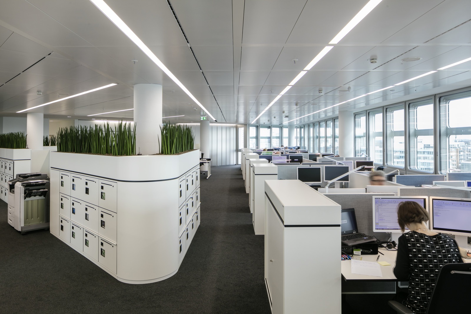 Im Gegensatz zur Fassade befand sich das Innere des Gebäudes nicht mehr im ursprünglichen Zustand und konnte im Zuge der Sanierung völlig neu gestaltet und zu einer modernen Arbeitswelt entwickelt werden. Die alten Bürogrundrisse wurden durch ein vom Bauherrn entwickeltes Smart-Working-Konzept ersetzt, das unterschiedliche Arbeits- und Kommunikationsmöglichkeiten miteinander kombiniert.