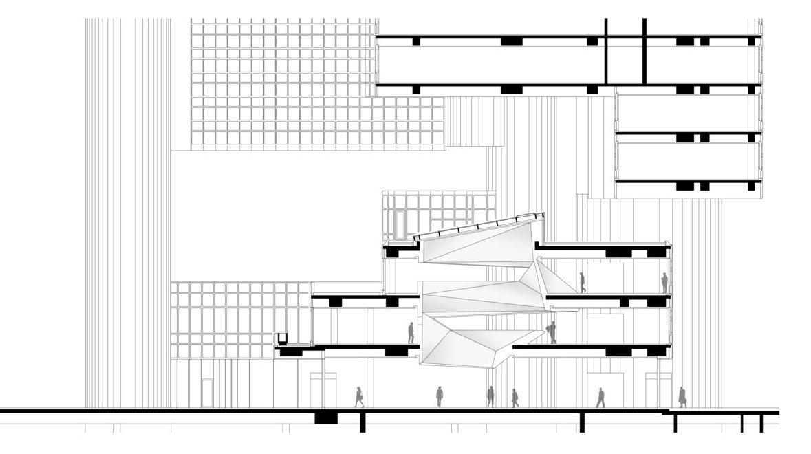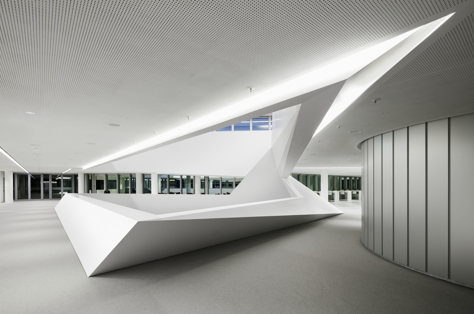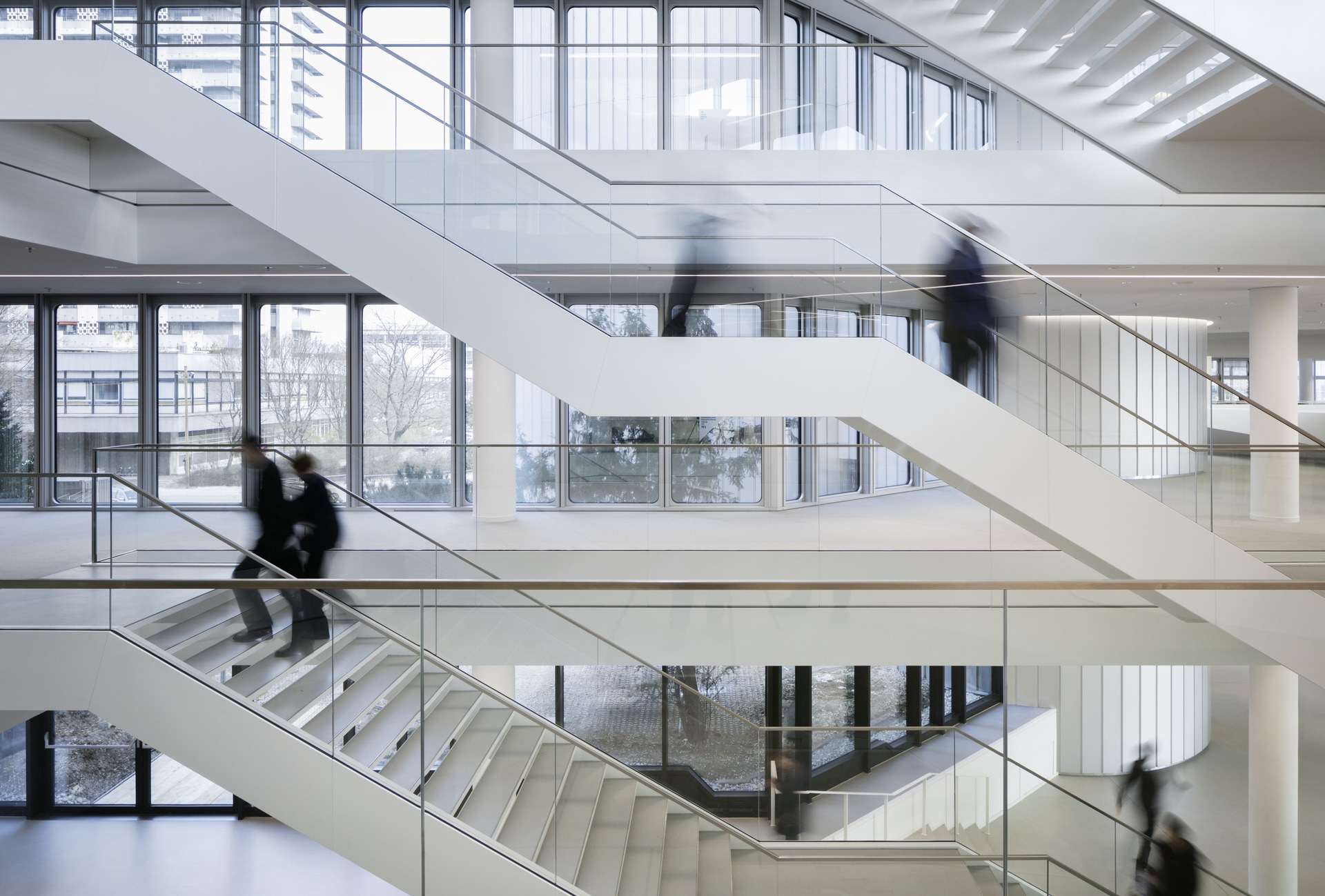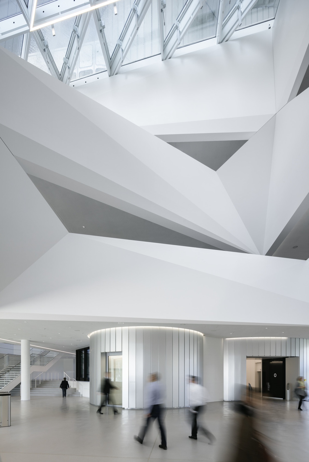 Das Erschließungsbauwerk erhielt ein neu gestaltetes Foyer. Der dreieckige Luftraum, der vom Foyer aus Einblicke in drei Etagen hinauf gewährt, wurde in einen dynamischen, aufgefalteten Raum aus polygonalen Flächen verwandelt. Durch das gläserne Pultdach strömt Tageslicht auf die mattweißen Mineralwerkstoffflächen dieser kristallinen Raumskulptur.