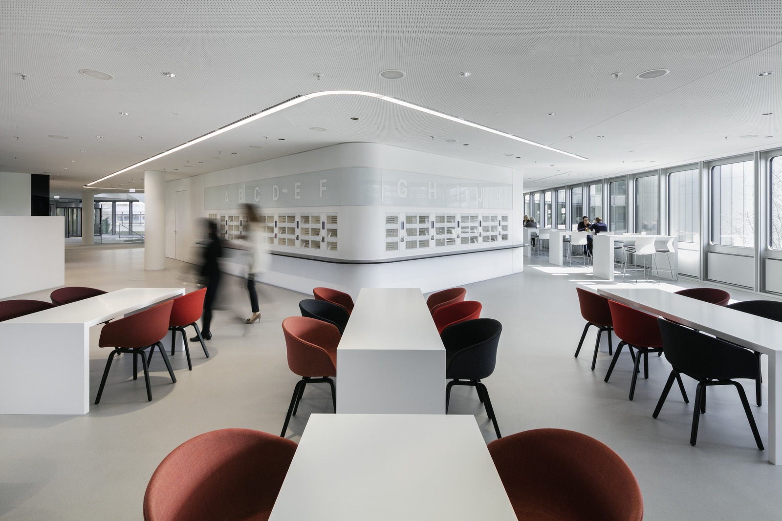 Die ständig wechselnden Sichtachsen zwischen den Etagen verbinden den Food-Court und die Cafeteria im ersten Obergeschoss mit der Veranstaltungsfläche im zweiten Stock und lenken den Blick nach oben. Der starke, körperhafte Charakter des ikonischen Gebäudes und seine futuristische und optimistische Anmutung sind ist nun auch im Inneren erlebbar.