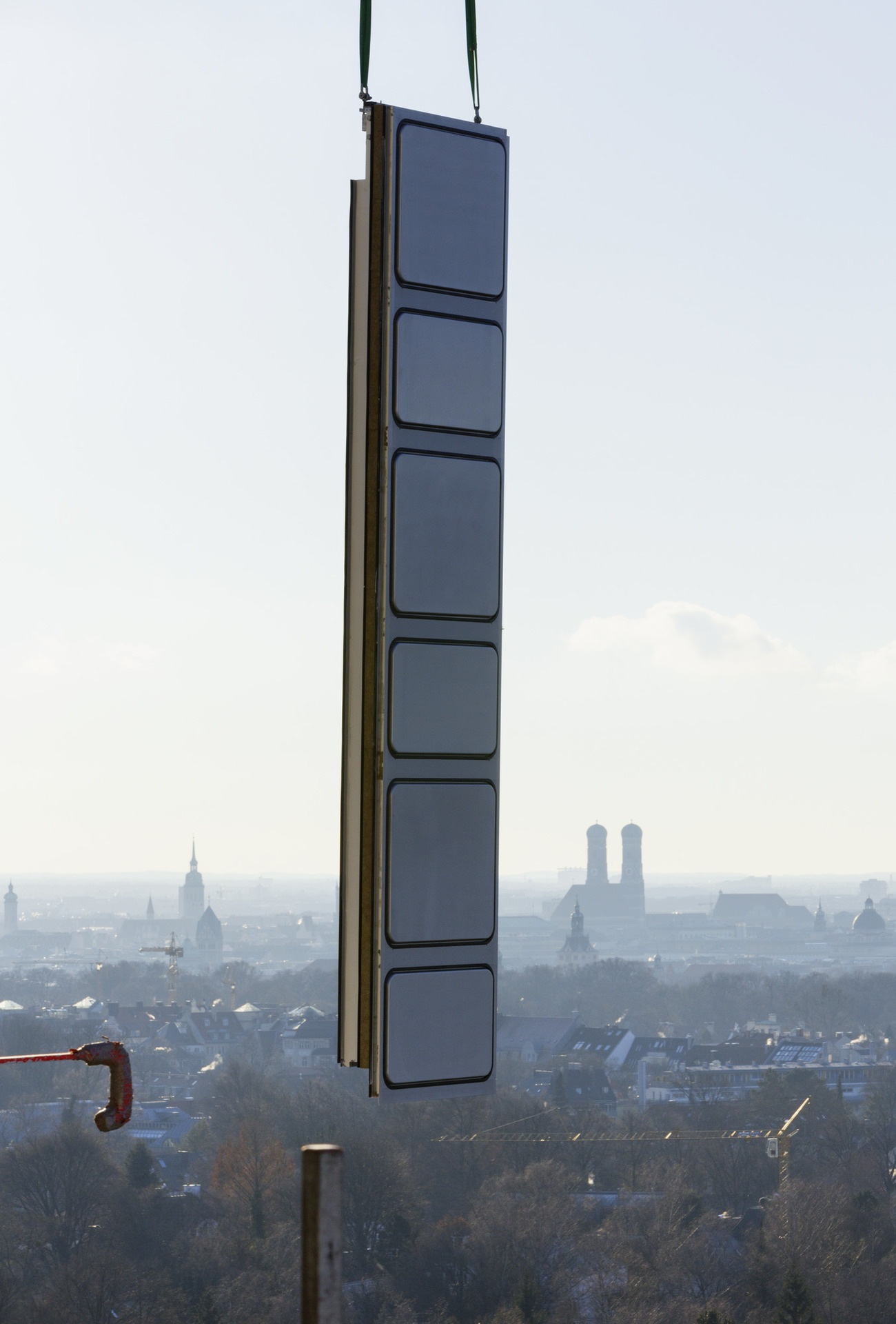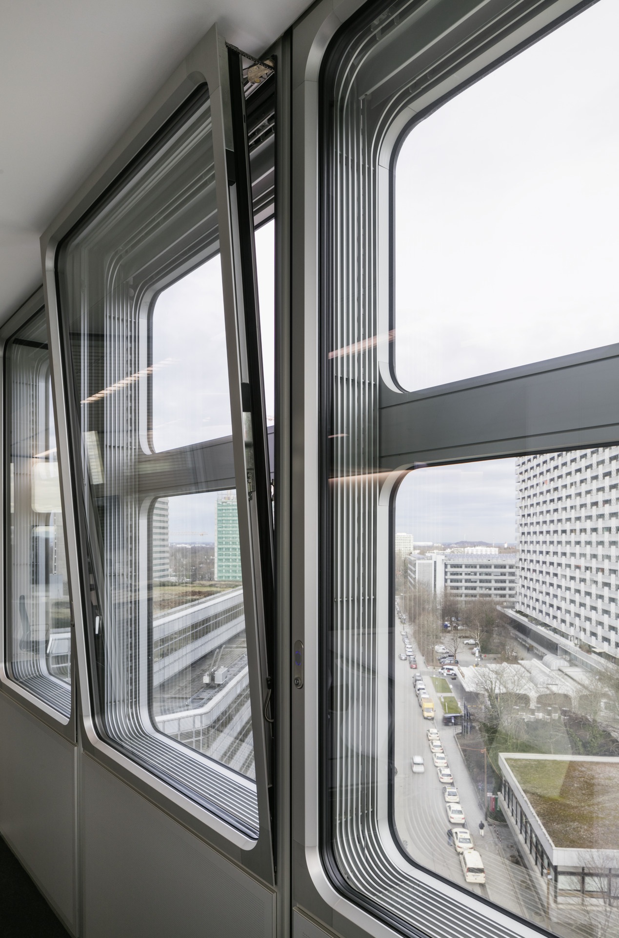 Die neu hinzugekommene innere Schale besteht aus einem akustisch wirksamen Brüstungspaneel und einem elektromotorisch bewegten Dreh-/Kipp-Öffnungsflügel mit Isolierverglasung. Diese Technik erlaubt es den Nutzern, die inneren Öffnungsflügel individuell per Tastendruck zu kippen und zu schließen und dadurch das Wohlbefinden am Arbeitsplatz deutlich zu steigern. Die für die Frischluftzufuhr notwendige Perforation der wiederverwendeten Fassadenelemente wird aus der Ferne nicht wahrgenommen. Durch die Sanierung der Anlagentechnik ist es gelungen, ein zeitgemäßes Raumklima-konzept zu implementieren.