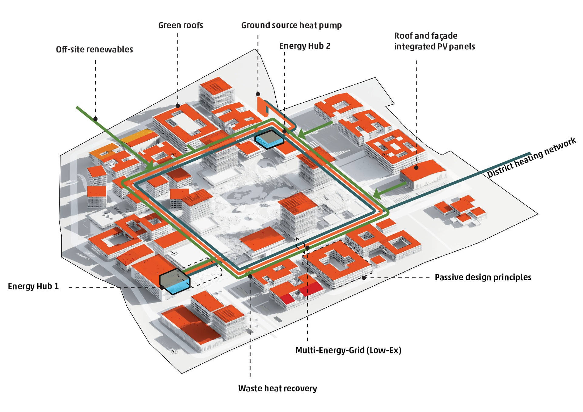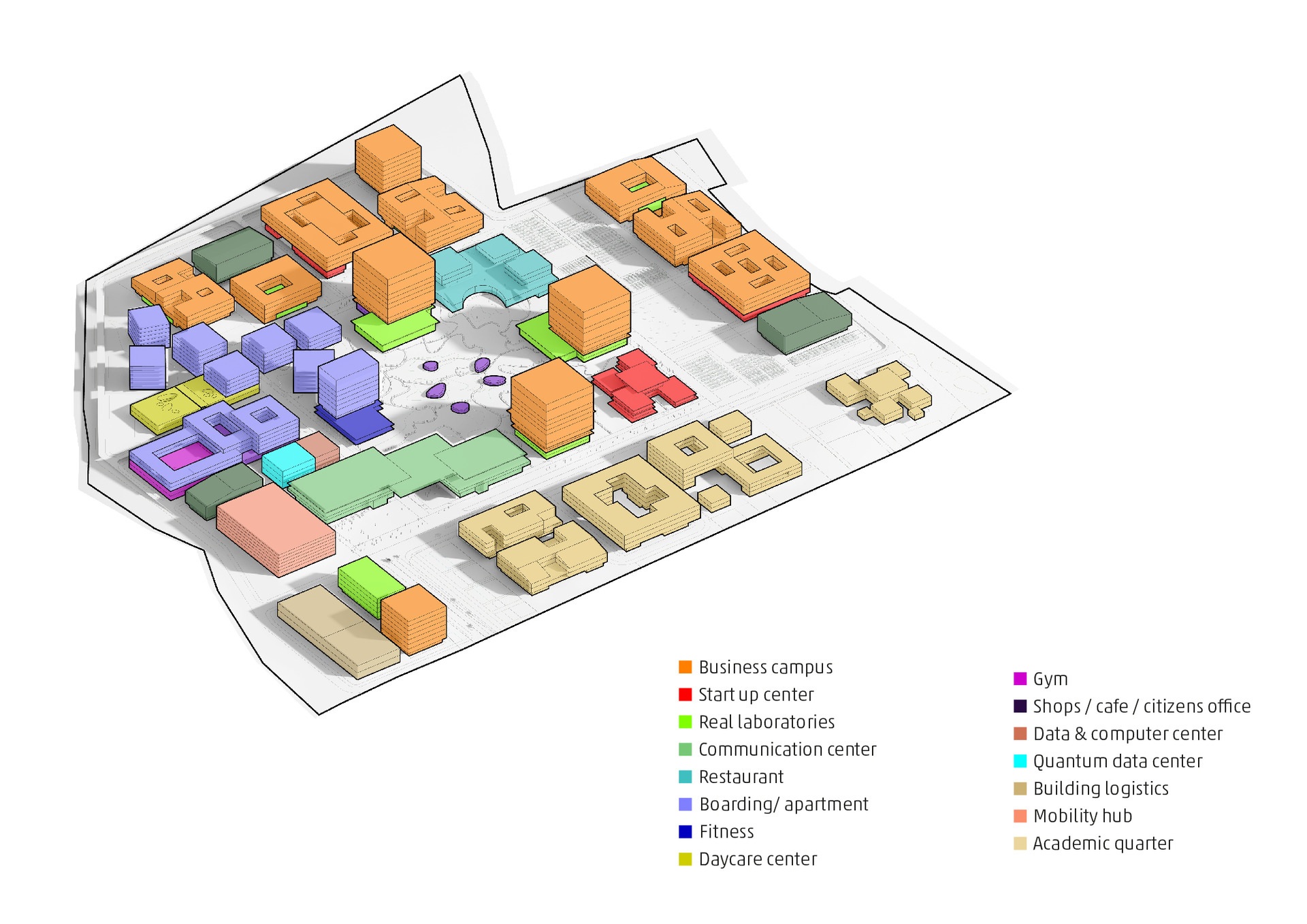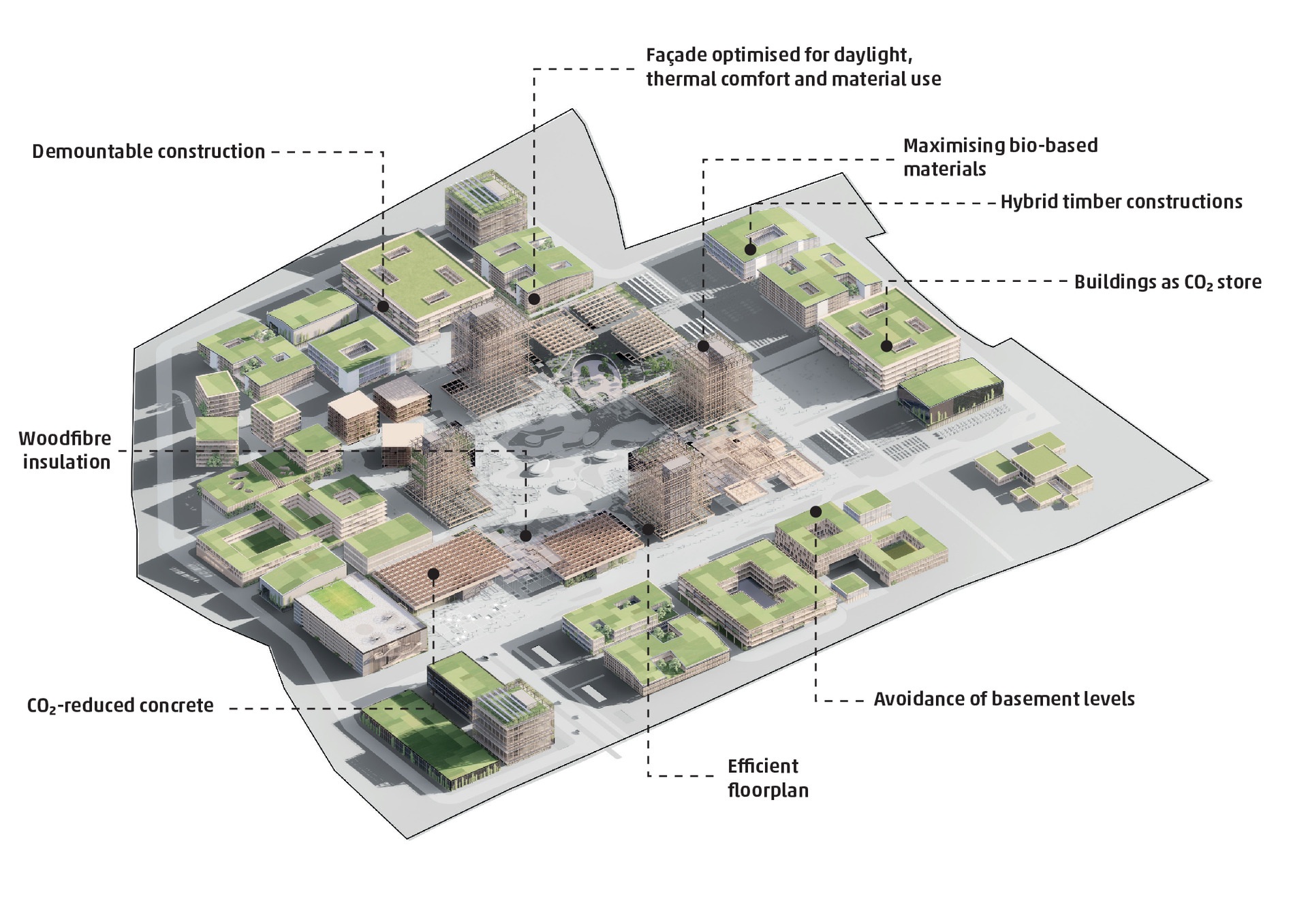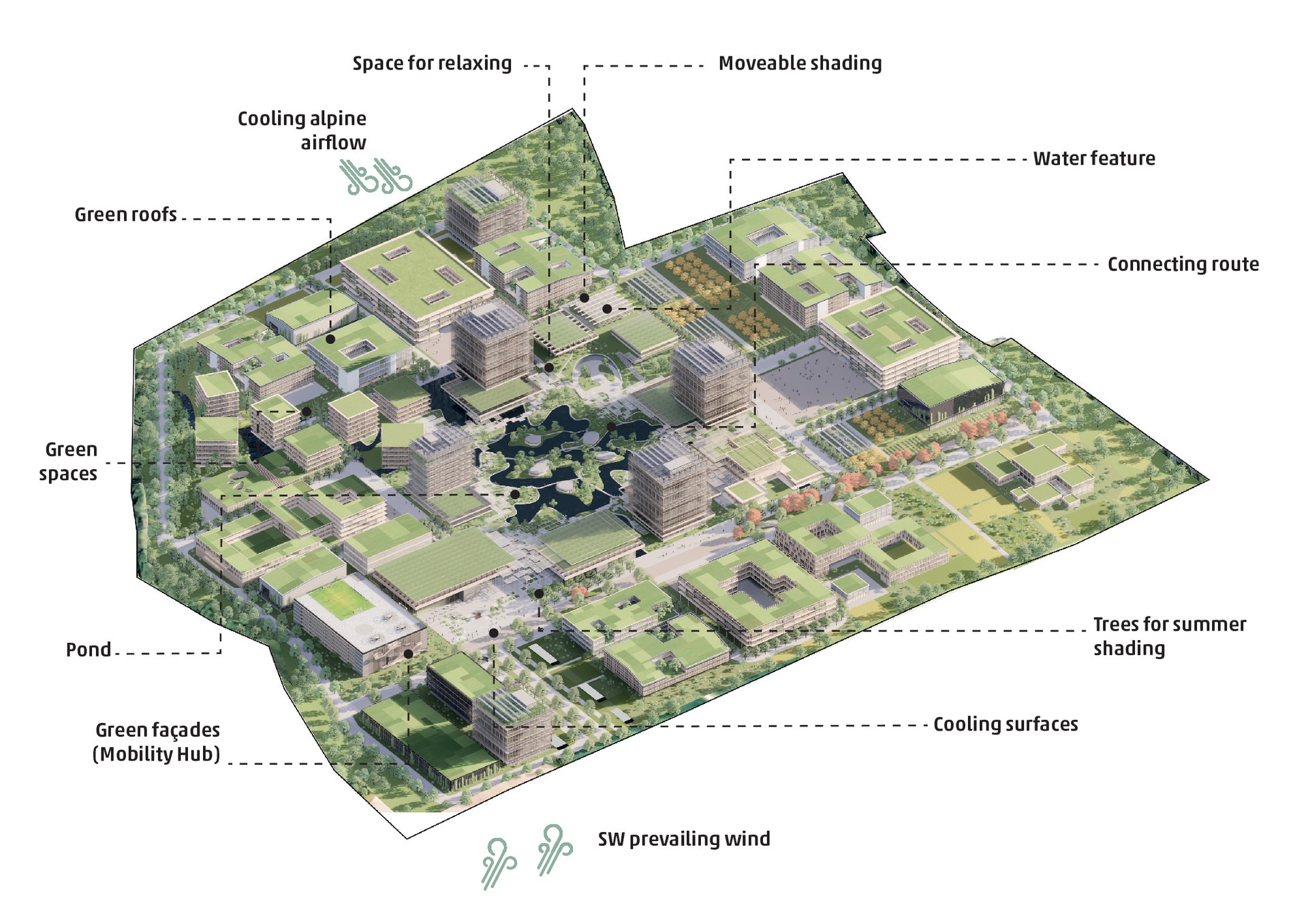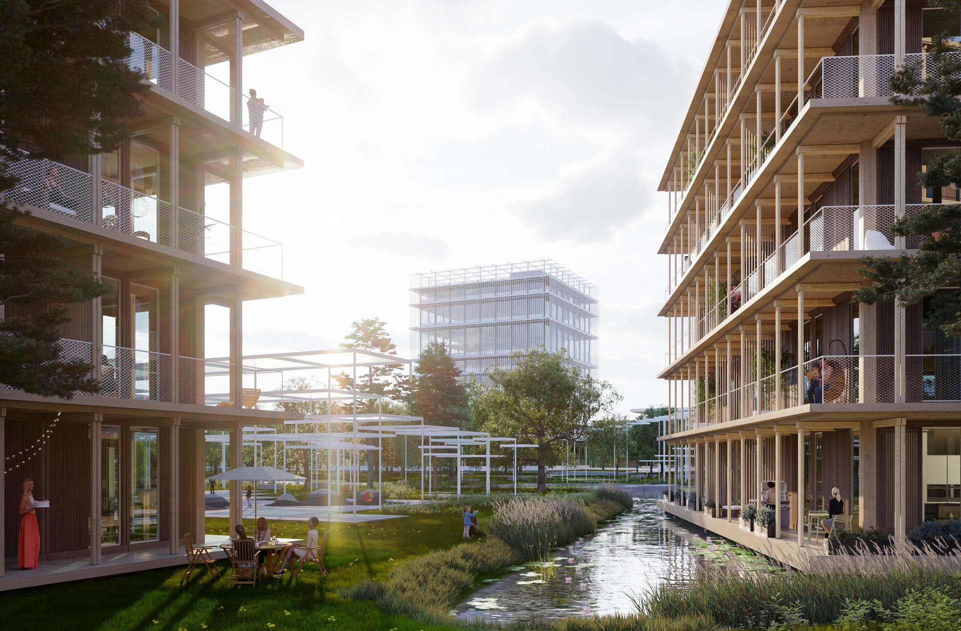Eingerahmt wird die grüne Oase von einem Ring aus Hoch- und Flachbauten, innerhalb dessen vier Bürotürme mit ihren dazugehörigen Quartiersplätzen die Schnittstelle zwischen Campus und Nachbarschaft bilden. Die Türme umfassen Räume für Innovation Hubs, Büroflächen für Start-ups, Labore sowie ein Konferenz- und Empfangszentrum. Die Bauten sind als hocheffiziente Holzhybrid-Konstruktionen geplant und verbrauchen auch dank ihrer smarten Gebäudeautomation im Vergleich zu herkömmlichen Bauweisen bis zu 50 Prozent weniger CO2. Auf Dächern und an Fassaden angebrachte Photovoltaik-Paneele erzeugen vor Ort zwei Drittel der vom Campus benötigten Energie. Grauwasser wird mithilfe von Schilfpoldern gereinigt und zusammen mit Regenwasser dem zentralen Gewässer zugeführt. Durch die Verdunstung wird der Campus natürlich gekühlt, überschüssiges Wasser wird in umliegende Flüsse eingeleitet.