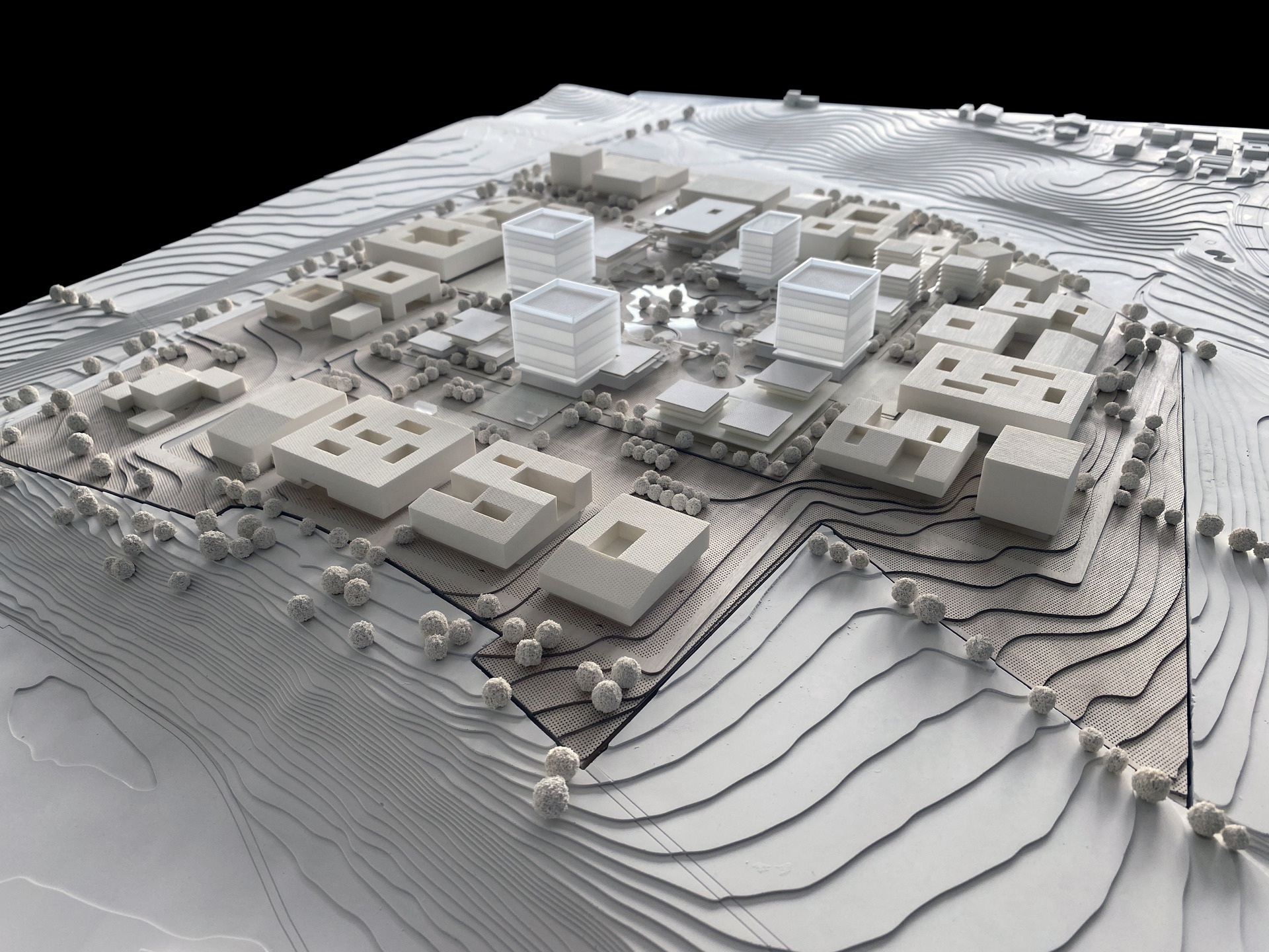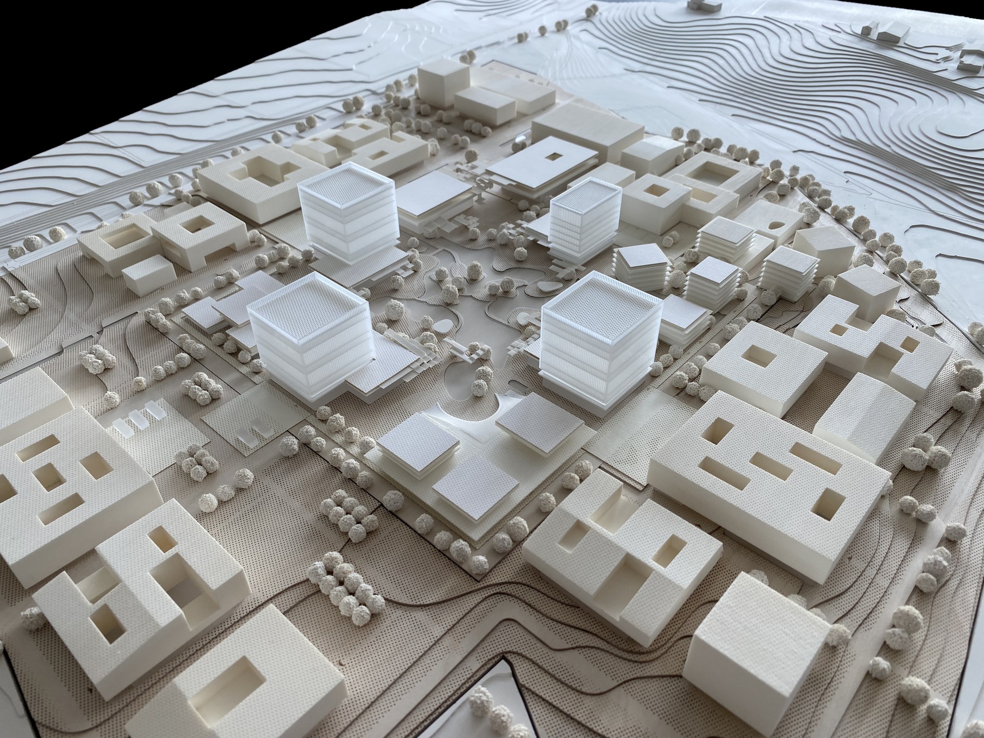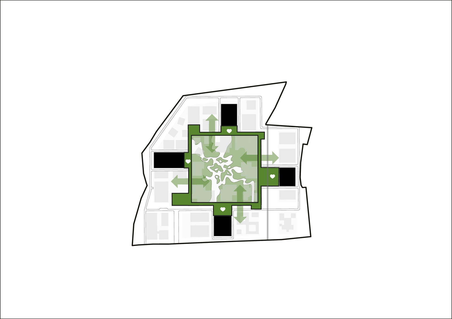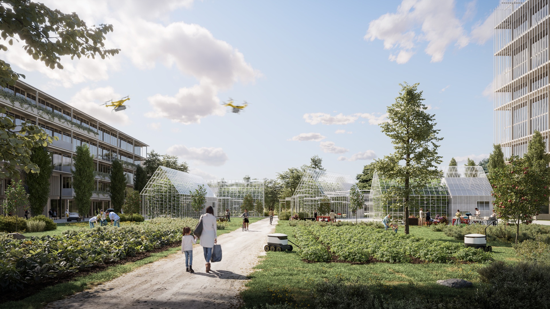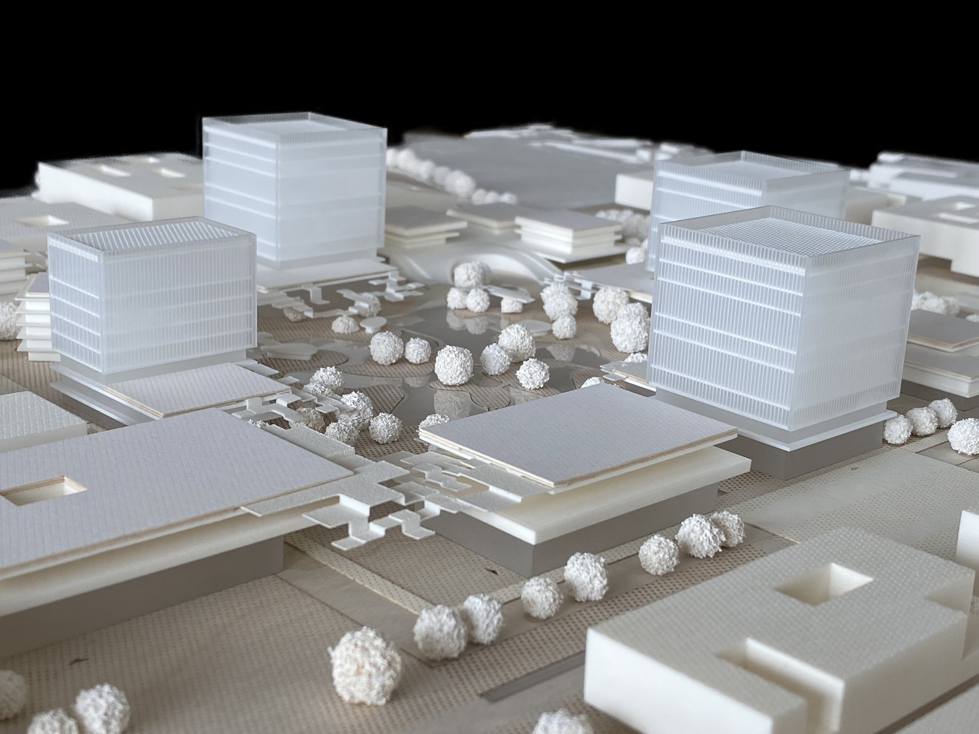 Eingerahmt wird die grüne Oase von einem Ring aus Hoch- und Flachbauten, innerhalb dessen vier Bürotürme mit ihren dazugehörigen Quartiersplätzen die Schnittstelle zwischen Campus und Nachbarschaft bilden. Die Türme umfassen Räume für Innovation Hubs, Büroflächen für Start-ups, Labore sowie ein Konferenz- und Empfangszentrum. Die Bauten sind als hocheffiziente Holzhybrid-Konstruktionen geplant und verbrauchen auch dank ihrer smarten Gebäudeautomation im Vergleich zu herkömmlichen Bauweisen bis zu 50 Prozent weniger CO2. Auf Dächern und an Fassaden angebrachte Photovoltaik-Paneele erzeugen vor Ort zwei Drittel der vom Campus benötigten Energie. Grauwasser wird mithilfe von Schilfpoldern gereinigt und zusammen mit Regenwasser dem zentralen Gewässer zugeführt. Durch die Verdunstung wird der Campus natürlich gekühlt, überschüssiges Wasser wird in umliegende Flüsse eingeleitet.