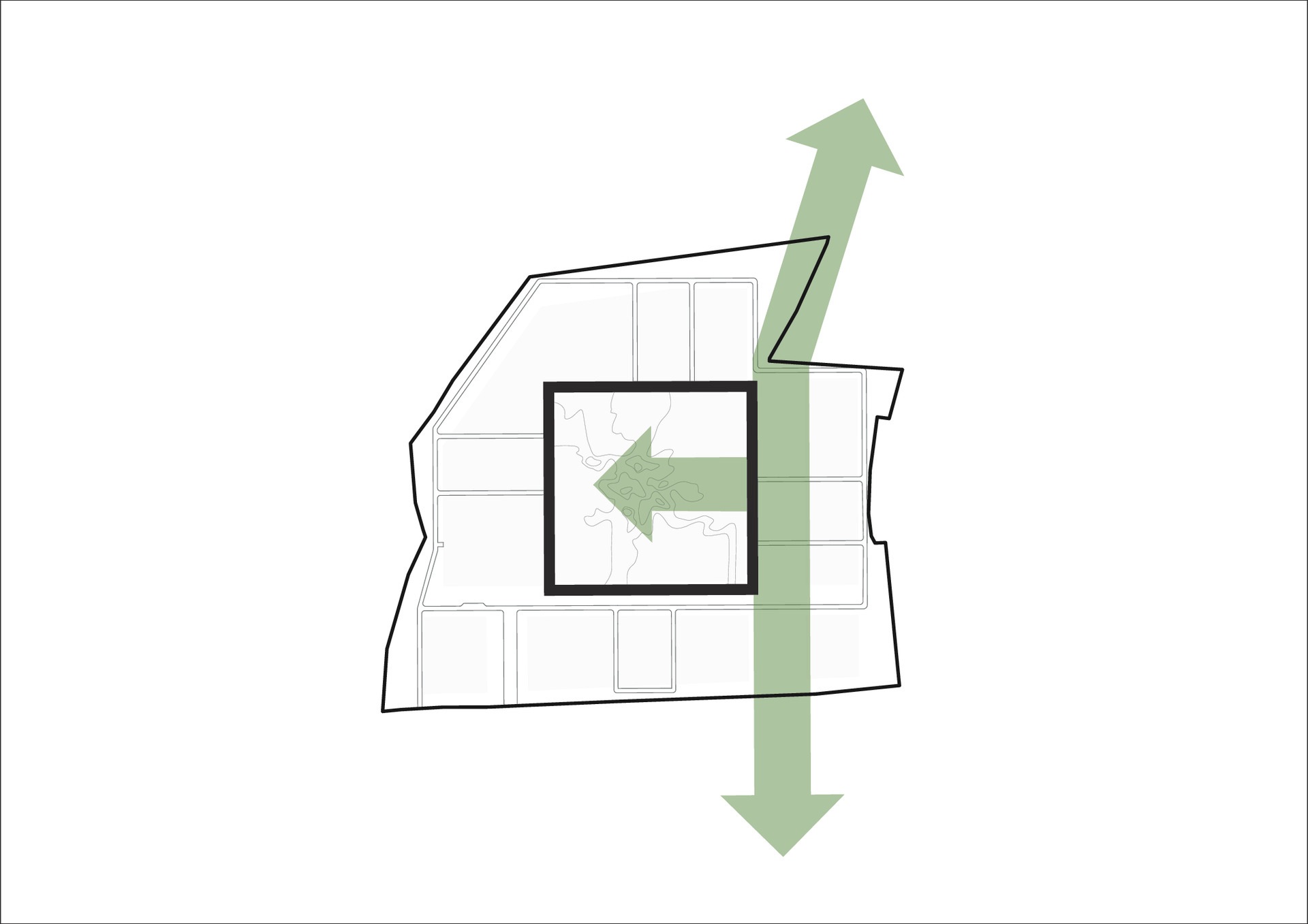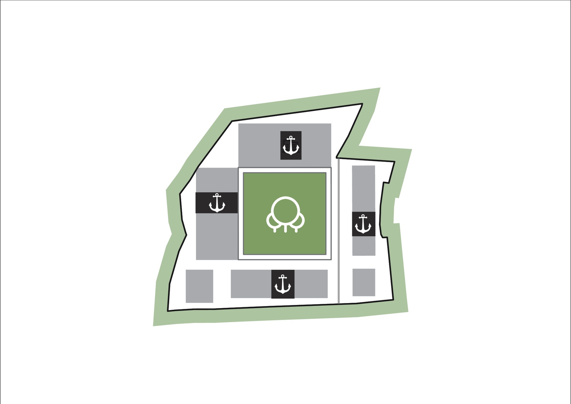 Eine „produktive Landschaft“ erprobt innovative Techniken in der Landwirtschaft. Die dafür vorgesehenen Flächen sind auf Dächern oder im äußeren Ring des Areals entlang des Römerwegs angeordnet – eine historische Straße, die den Campus von Norden nach Süden verbindet. An dieser zentralen Achse befindet sich ein Marktplatz, auf dem sich Gäste und Bewohner*innen in den Pop-up-Gastronomien treffen oder IPAI-Produkte auf dem Wochenmarkt kaufen können.
