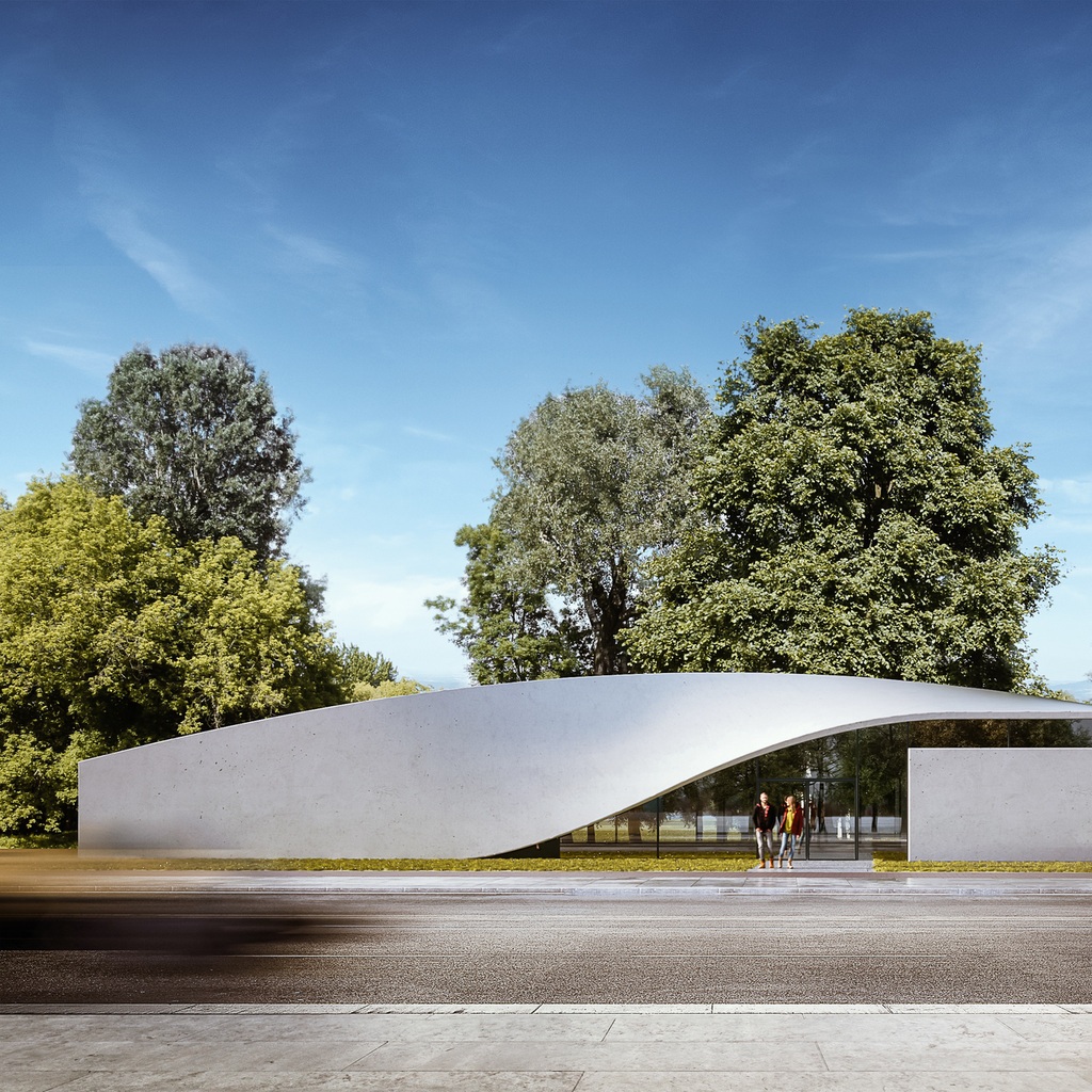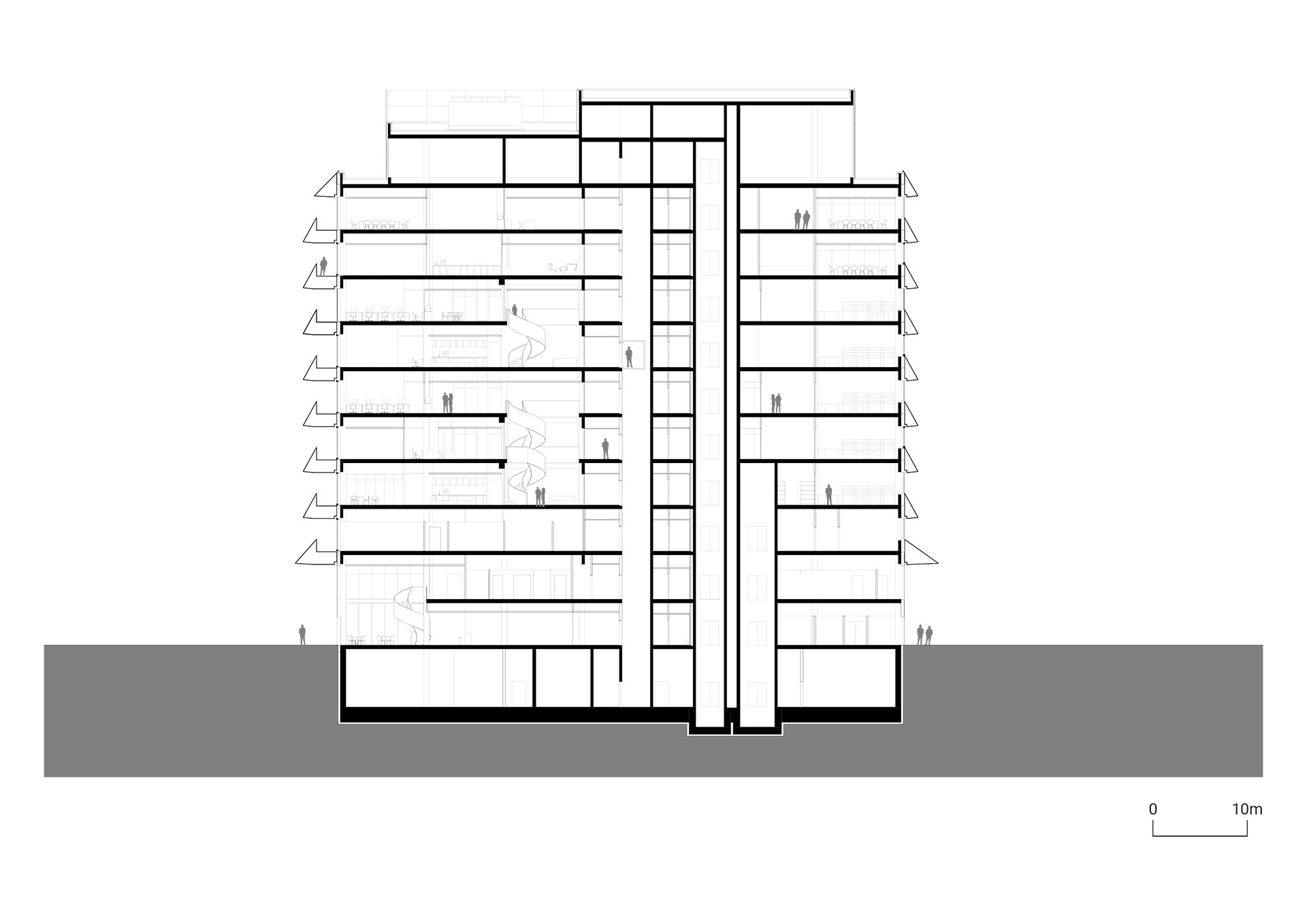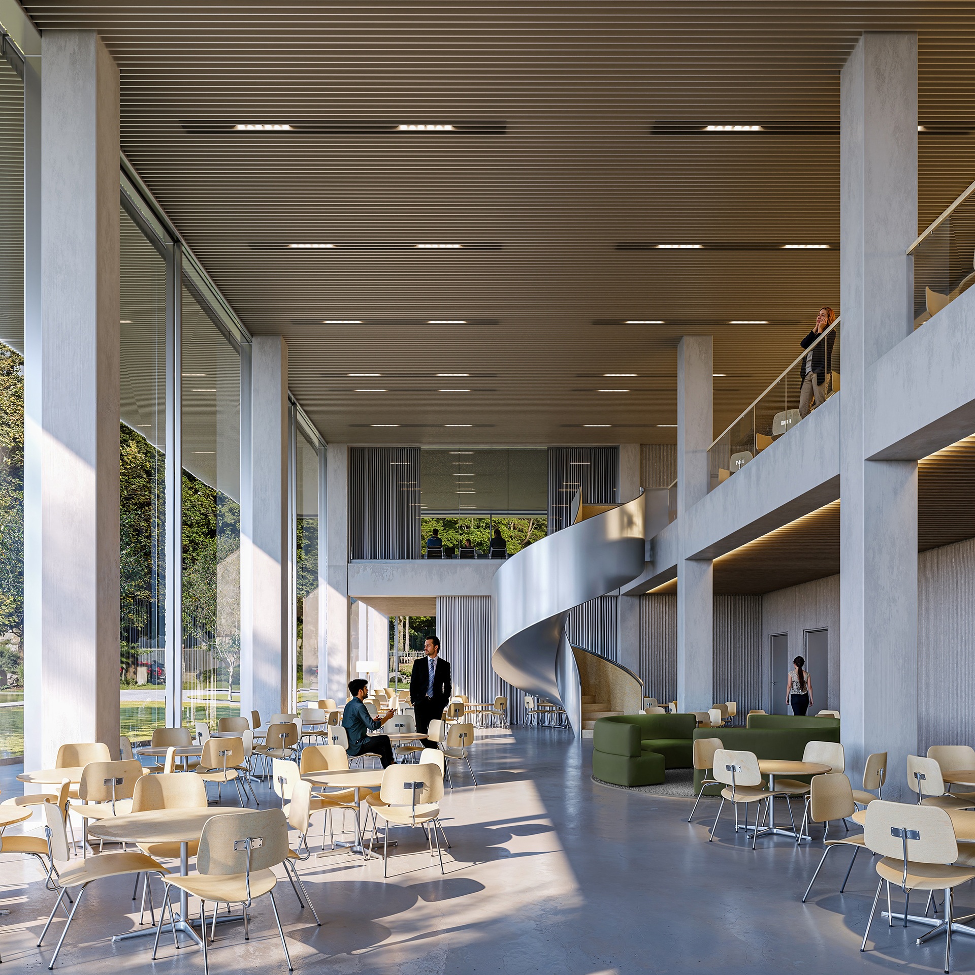 Eine Auskragung zur Uferpromenade hin bildet einen witterungsgeschützten Bereich, in dem auch ein Café Platz findet. Von hier aus haben Besucher*innen einen Einblick in die hochmoderne Technik und die Arbeitsvorgänge im Laborbereich im ersten Obergeschoss. In den Geschossen darüber entsteht die moderne Forschungswelt des Translationszentrums.