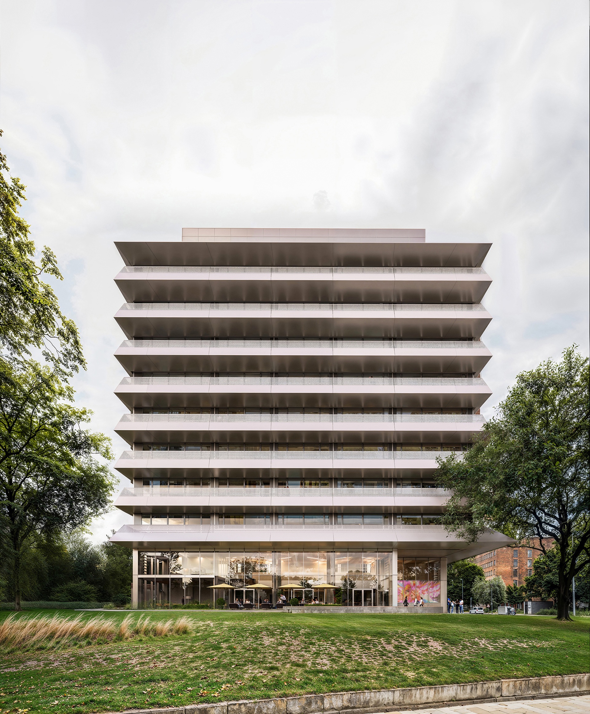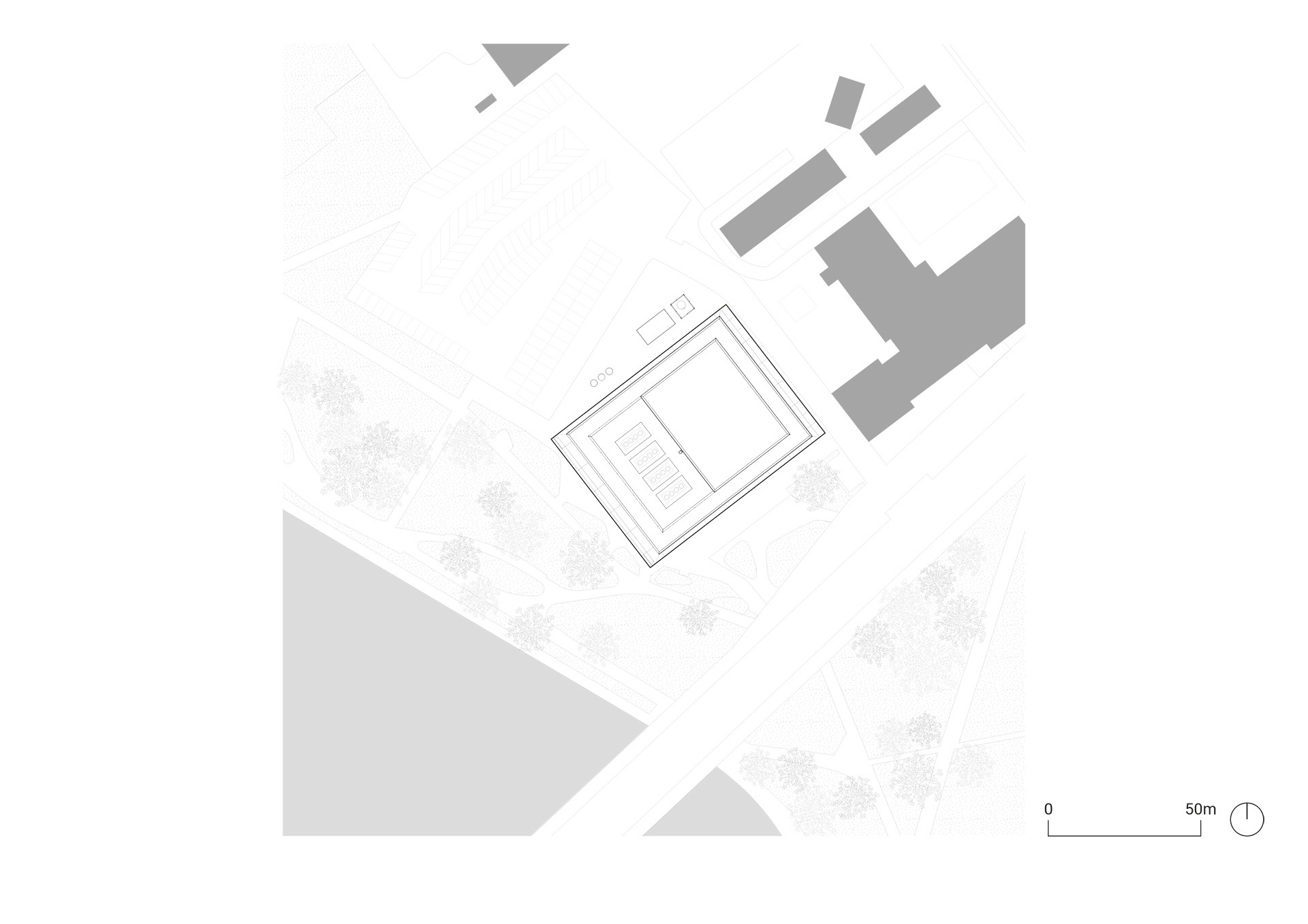 Durch seine Lage am Nordhafen, am südlichsten Teil des Campus, steht das Gebäude im direkten Dialog sowohl mit der Stadt als auch mit dem angrenzenden Grünraum und dem Bayer-Campus. Der kubische Baukörper nimmt mittels der horizontal gegliederten Fassade Bezug zu seiner städtischen Umgebung und dem Bayer-Campus auf. Durch die Transparenz des gläsernen Sockelbereichs verzahnt sich das Gebäude mit der umgebenden Natur.