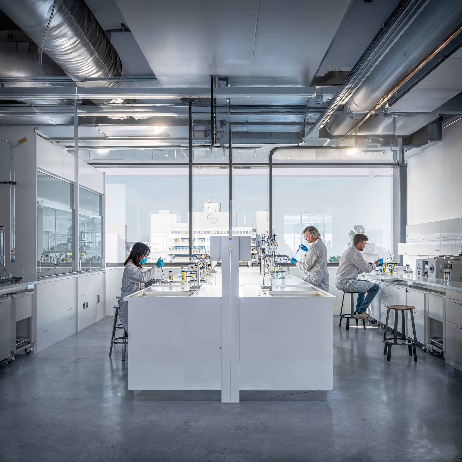Ein modulares Raster und die einfache Grundform des Gebäudes ermöglichen flexibel nutzbare und planbare Grundrisse, die durch doppelgeschossige Gemeinschaftszonen verbunden werden können. Das integrierte GMP-Labor (Good Manufacturing Practice) bietet Forschenden eine hochmoderne Umgebung, in der sie innovative Therapien nach höchsten Qualitäts- und Sicherheitsstandards entwickeln und testen können. Zudem gewährleistet es eine lückenlose Rückverfolgbarkeit und ermöglicht einen nahtlosen Übergang vom Forschungskonzept zur klinischen Anwendung.