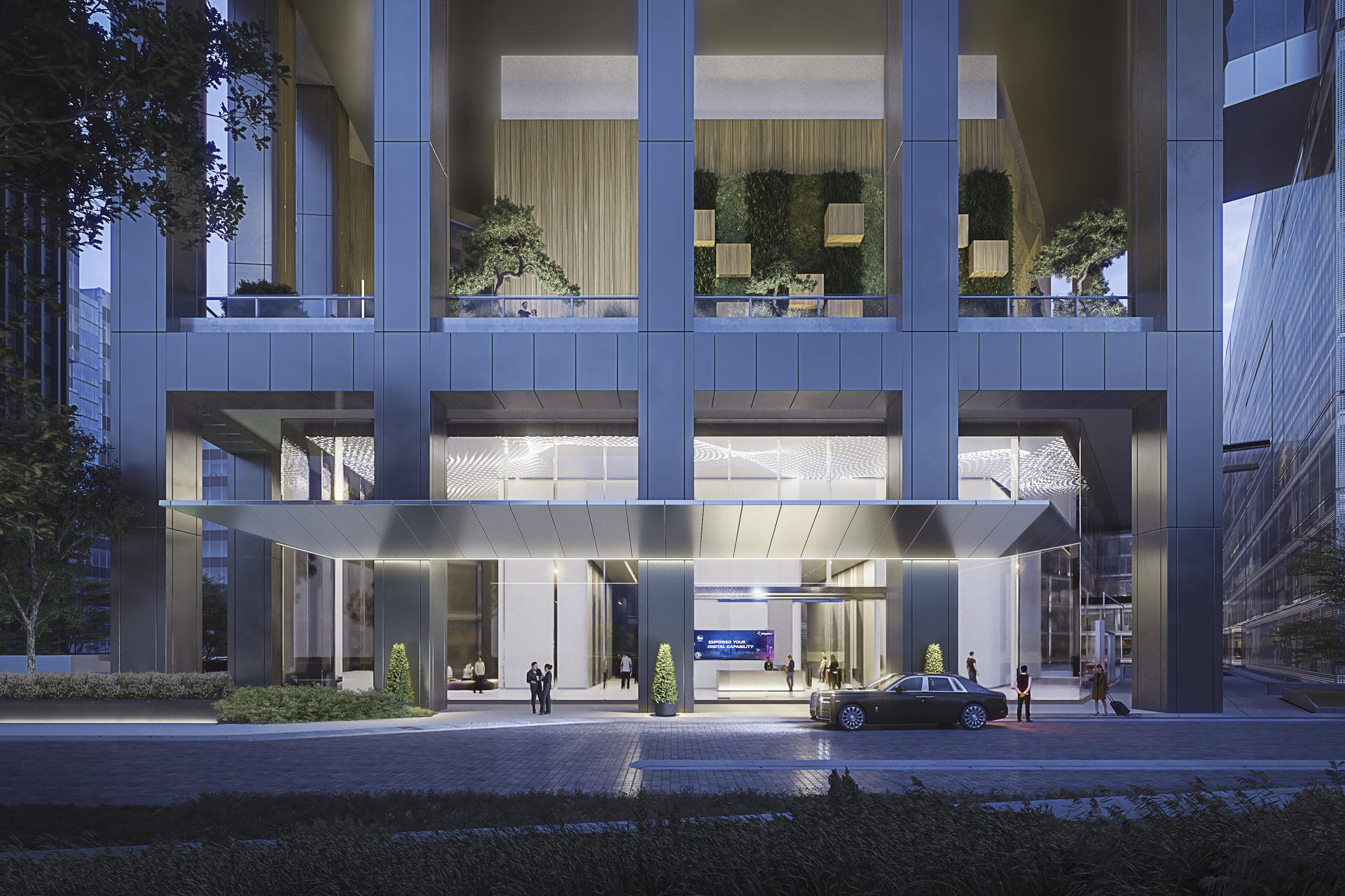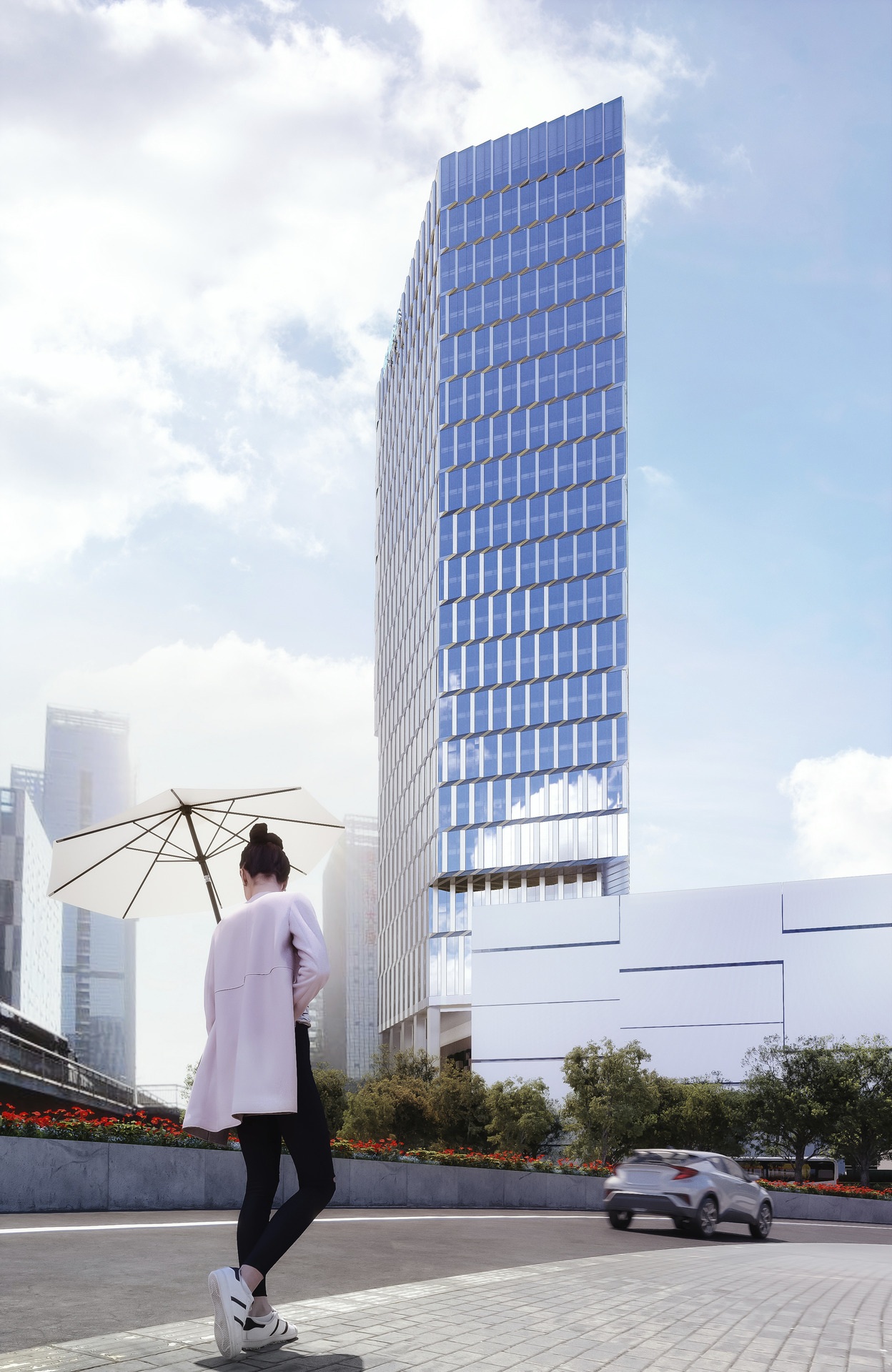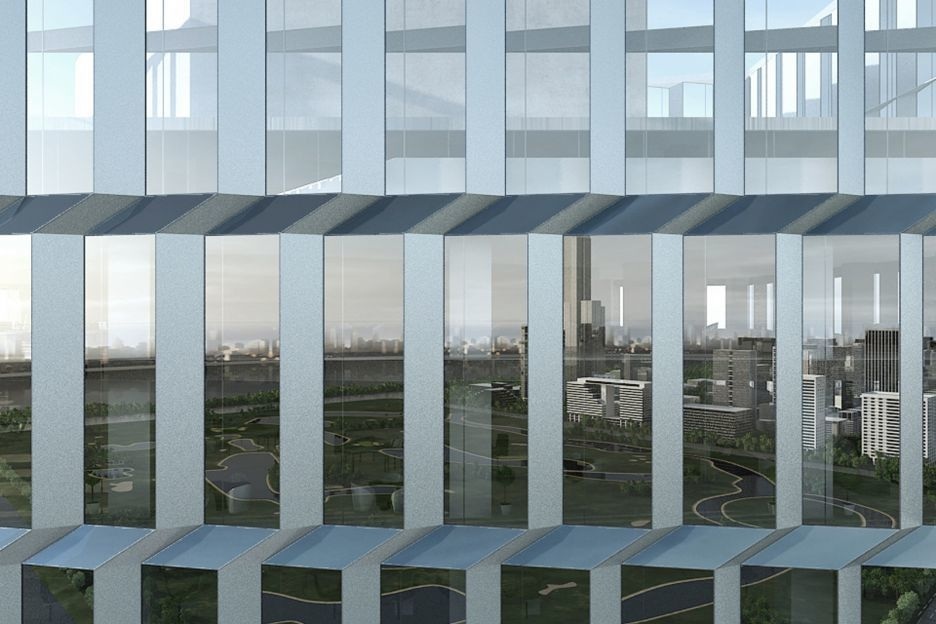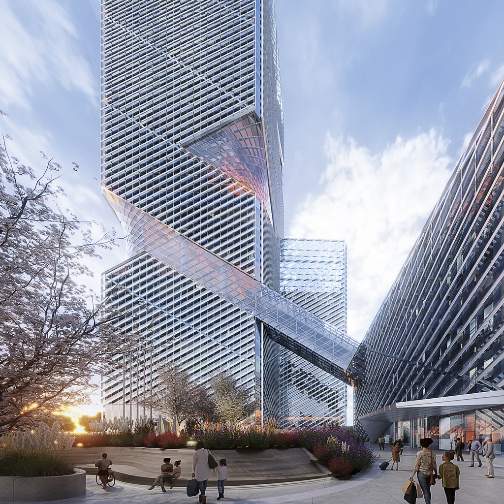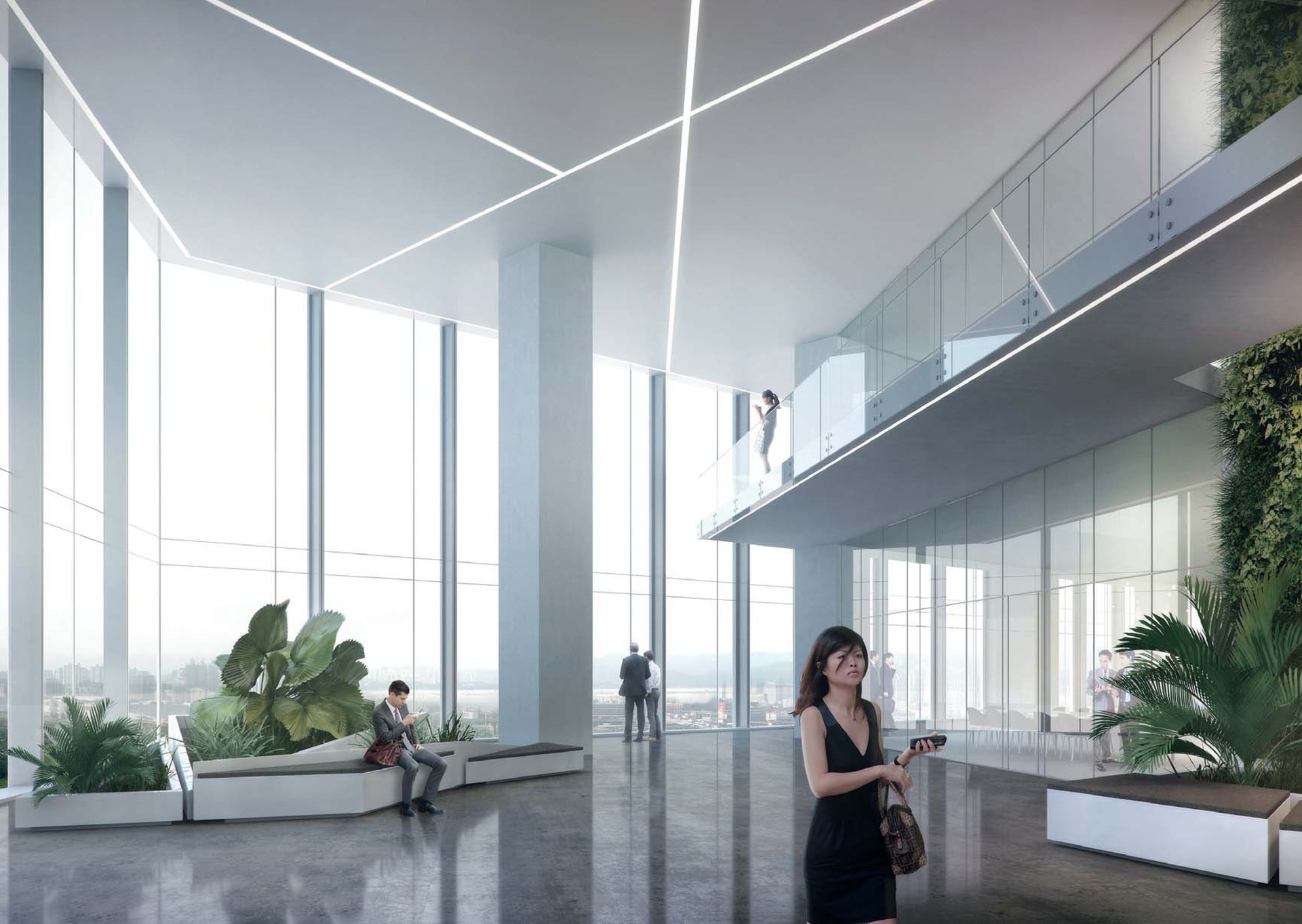 Nach außen sind die Sockelgeschosse offen gestaltet und verbinden so das Hochhaus mit der grünen Stadtlandschaft und laden das pulsierende Stadtleben in das Gebäude ein.