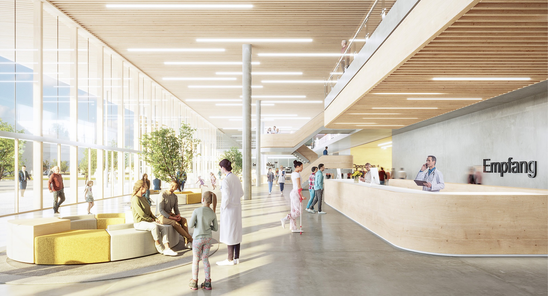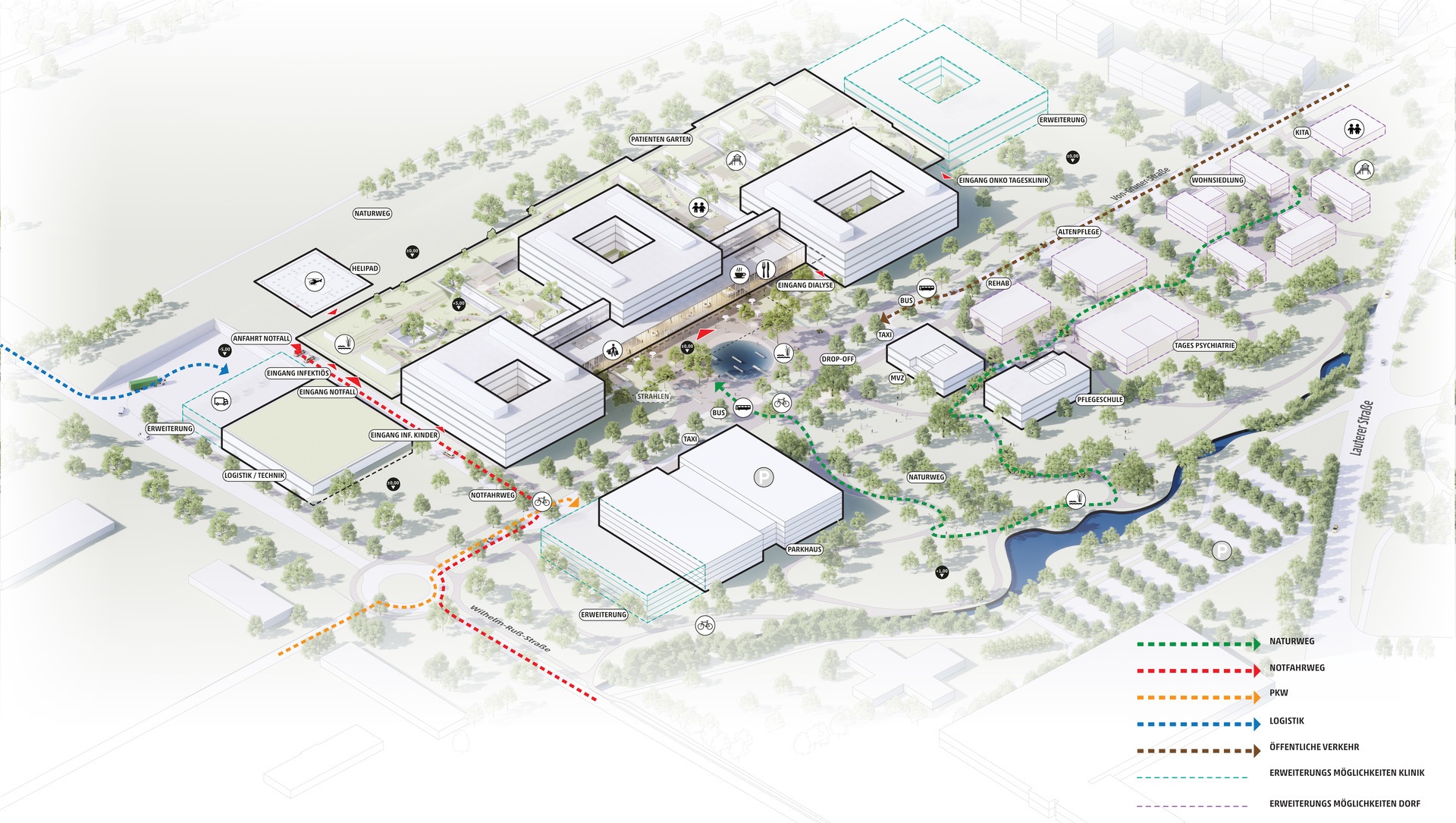 Mit dem Neubau des Klinikums entsteht ein Siedlungsbaustein, der eine zukunftsweisende und nachhaltige medizinische Versorgung sicherstellt. Wesentlicher Bestandteil des Projekts ist ein Höchstmaß an Flexibilität, Nachhaltigkeit, Interdisziplinarität und das Schaffen idealer Voraussetzungen für Zukunftsthemen wie Digitalisierung und künstliche Intelligenz. Im Einklang mit den regionalen baulichen und landschaftlichen Strukturen entsteht ein neues, qualitätvolles städtebauliches Motiv des „Klinikums im Grünen“.