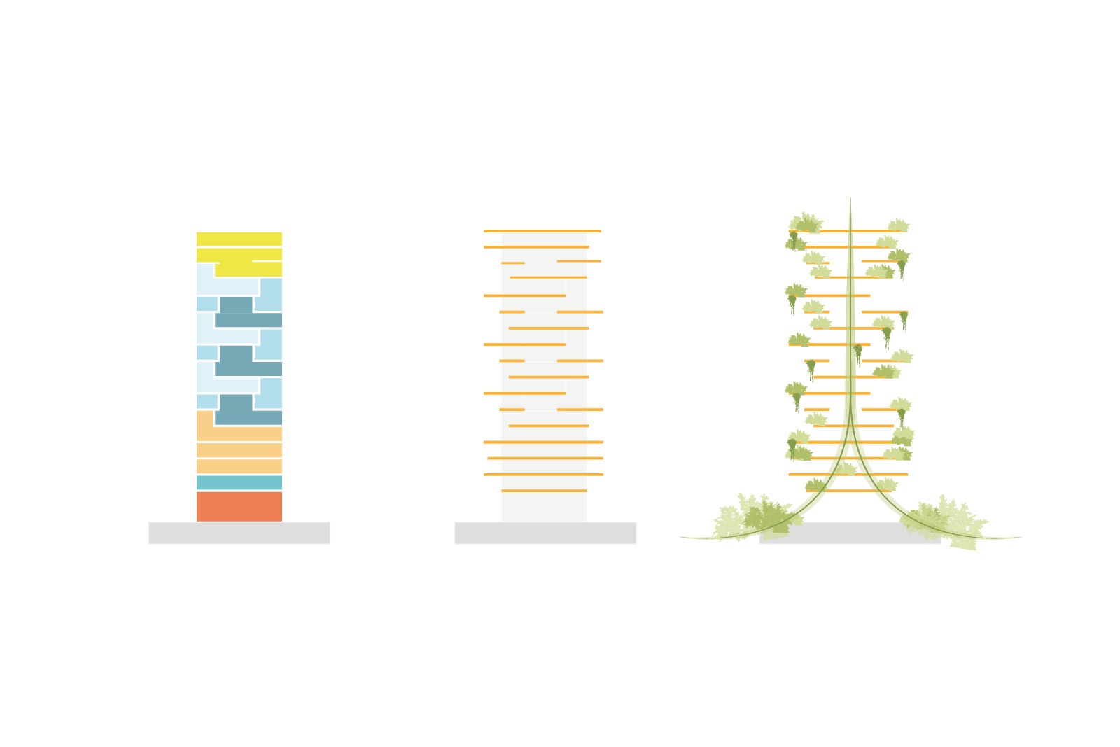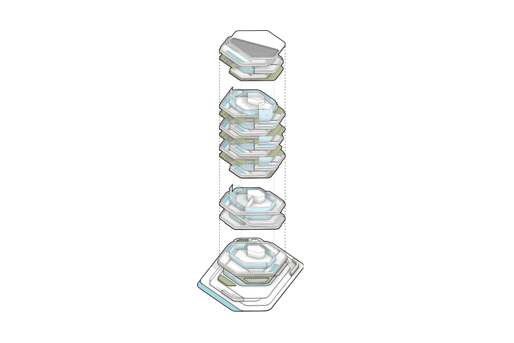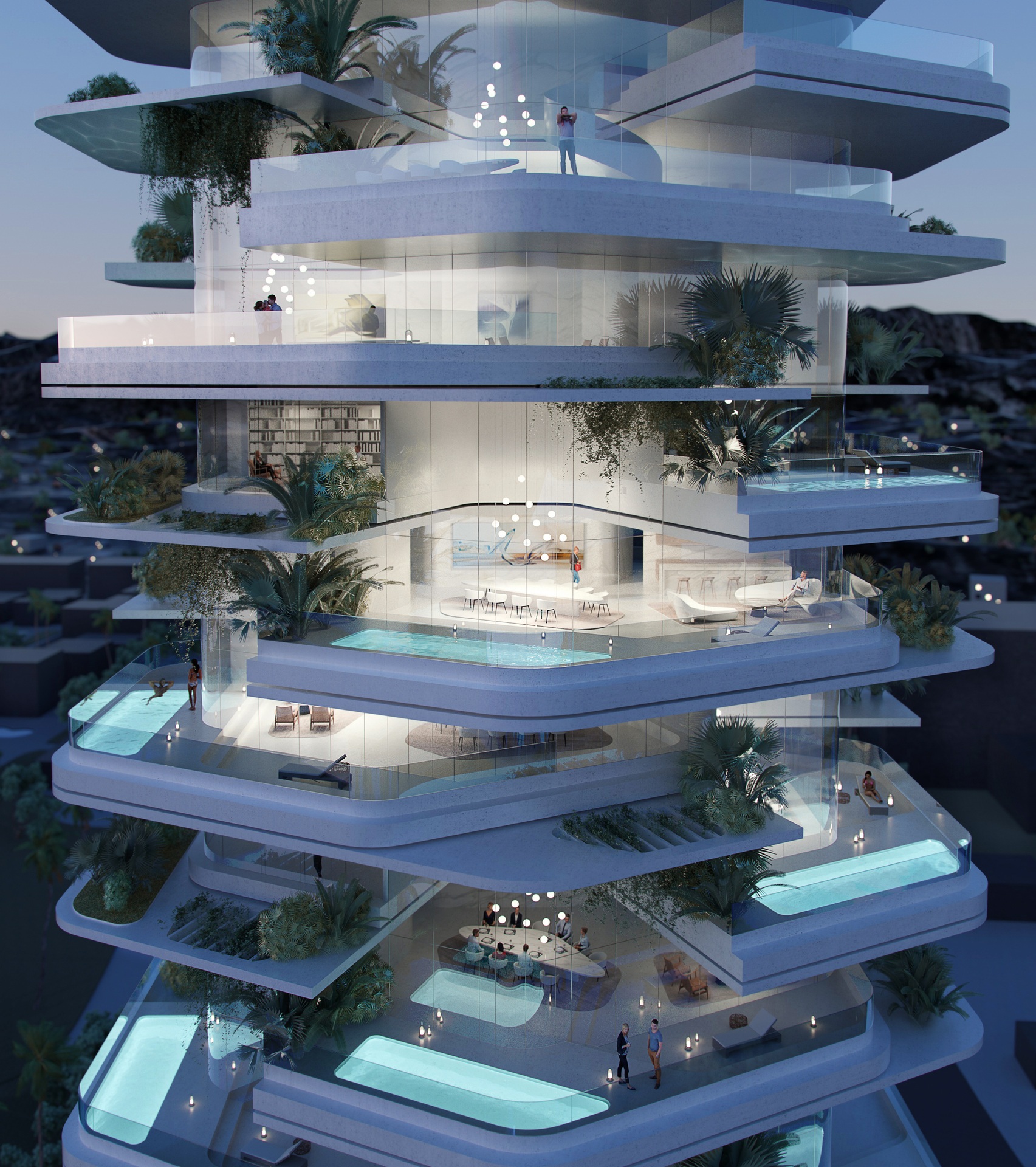 Das Interieur zeichnet sich durch einen klar geschnittenen Grundriss aus, der großzügige und zeitgemäße Raumeinheiten vorschlägt. Drei Wohnungen sind so übereinander angeordnet, dass ein großer, zweigeschossiger Luftraum in jeder Einheit entsteht, sowohl im Innenbereich als auch im Terrassenbereich. Durch eine durchdachte Grundrissgestaltung der verschiedenen Wohnungstypen entstehen 270°-Panoramen. Die großflächigen Verglasungen können geöffnet werden, um den Innenraum nahtlos mit dem Garten- und Terrassenbereich zu verschmelzen. Die Verglasungen wechseln sich mit dichtem Grün ab, um maximale Transparenz mit größtmöglicher Privatsphäre zu verbinden. Jedes Appartement verfügt über einen eigenen Außenpool mit Blick auf die Bucht von Akrotiri. In der Spitze des Gebäudes befindet sich ein 3-stöckiges Penthouse, das eine Aussicht in alle Richtungen, eine geräumige Dachterrasse sowie mehrere verschiedene Balkone und Gärten bietet. Die grüne Fassade mit ihren Gärten und der üppigen Begrünung führen zu einer Wohnqualität, bei der die Natur allgegenwärtig ist. Um das Angebot für die Bewohner abzurunden, befinden sich im Sockel kommerzielle Einrichtungen sowie ein Wellness- und Fitnessbereich im ersten Stock.
