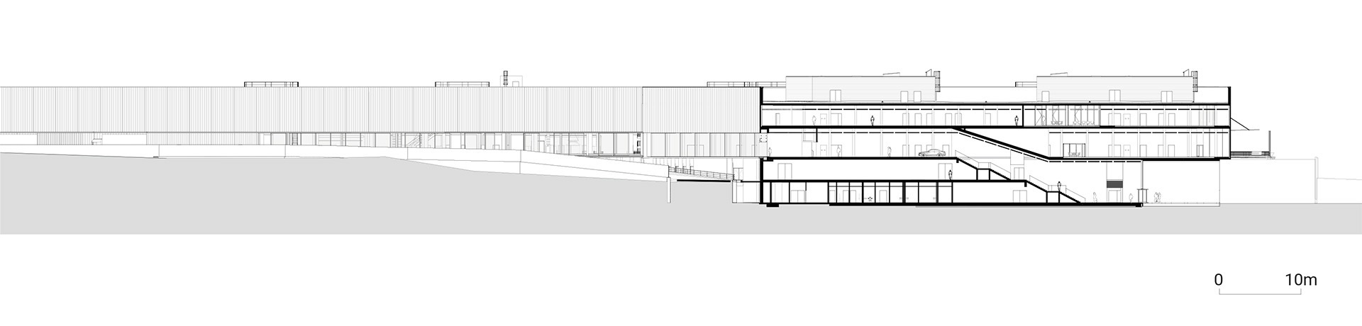 Die ungleichmäßige Grundstücksform und steile Topografie verlangten eine architektonisch innovative Herangehensweise, die für Fabrikhallen einzigartig ist: Der Kopfbau im niedriger gelegenen Bereich erhielt ein prägnantes zusätzliches Sockelgeschoss mit breiter Treppe, die ins Gebäude führt. Die Halle umschließt ein dunkel gestaltetes Sockelband, das Anlieferungstore diskret integriert. Darüber schließt die hell gestaltete und klar strukturierte Fassade an. Am transparent gestalteten Kopfbau öffnet sich das dunkle Band in eine breite Glasfuge, die Einblicke ins Innere gewährt.