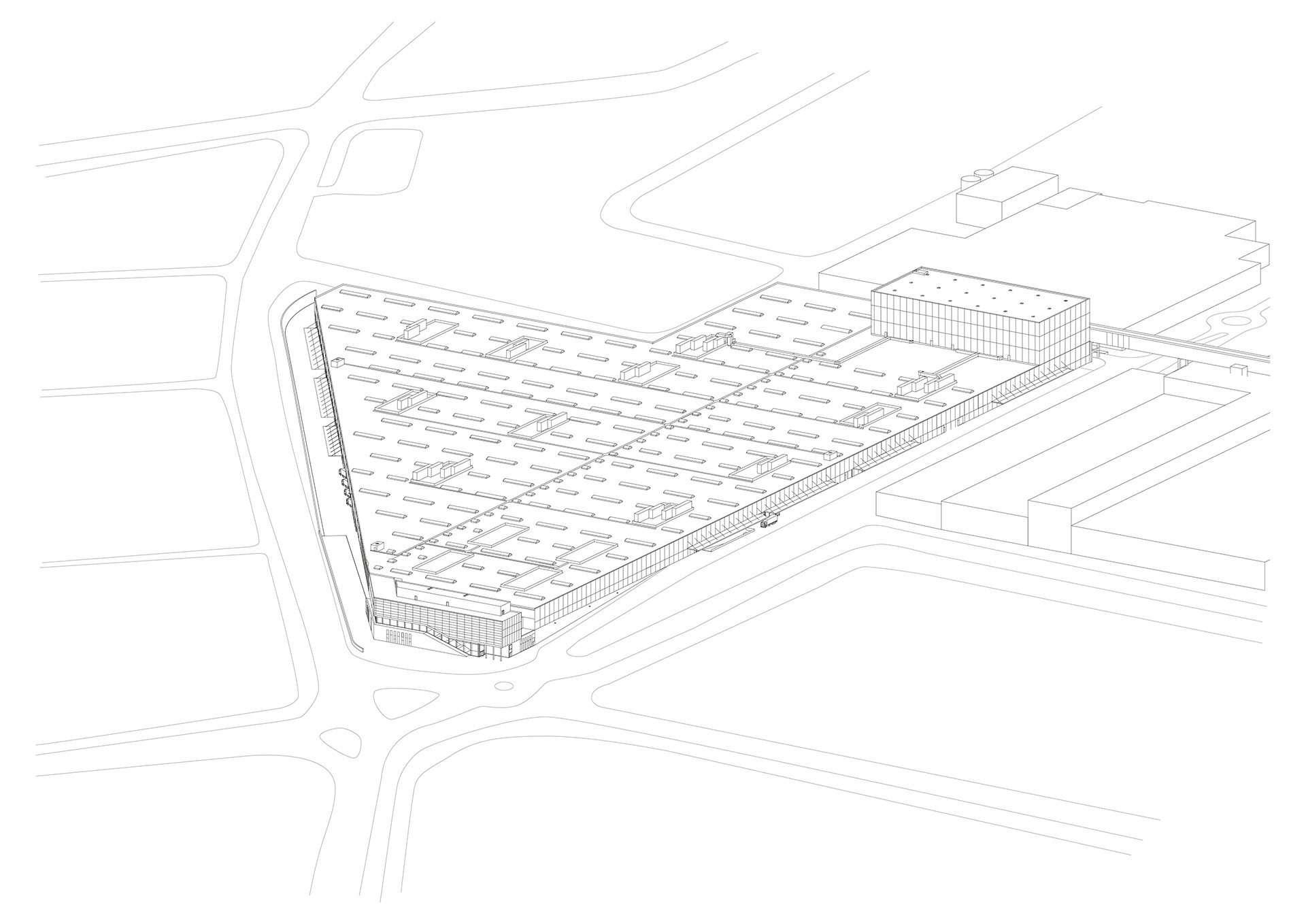 Um das gewünschte Maß an Flexibilität zu erreichen, basiert der Entwurf auf einem radikal offenen Grundriss. Das Stützenraster der leichten Stahlkonstruktion wurde von den üblichen Maßen teilweise auf knapp 29 Meter verdoppelt und kommt vollständig ohne Brandwände aus – eine höchst anspruchsvolle bauliche und logistische Lösung. Stattdessen wurde eine Schneise integriert, die als Brandschutzstreifen und Hauptverkehrsweg für selbstfahrende Transportfahrzeuge, sogenannte AGV, genutzt wird.