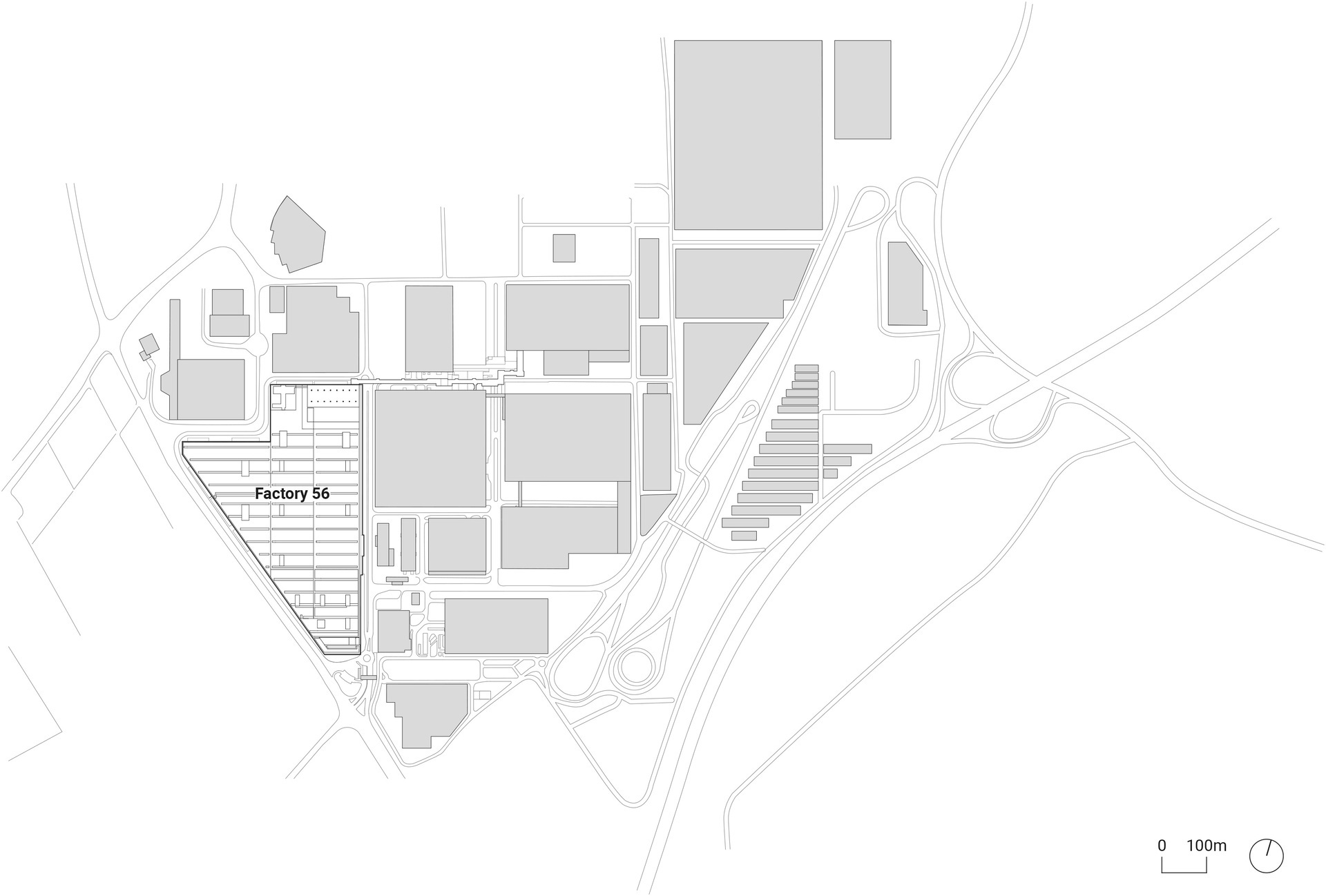 Das Gebäude ist material- und prozessoptimiert entwickelt, aber mit einem durchdachten gestalterischen Konzept – innen wie außen. Neben den Produktionsflächen umfasst die Factory 56 einen hybriden Kopfbau, das soziale Zentrum des Gebäudes. Hier befinden sich der gemeinsame Eingang für alle Mitarbeitenden über eine breite Treppe, eine Kantine, ein Mitarbeitershop und mehrere Konferenzflächen sowie die meisten Büro- und Meetingräume, die zum kleineren Teil als Module direkt in die Montagebereiche integriert sind.