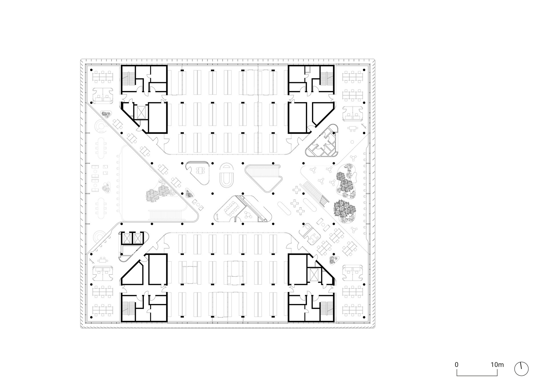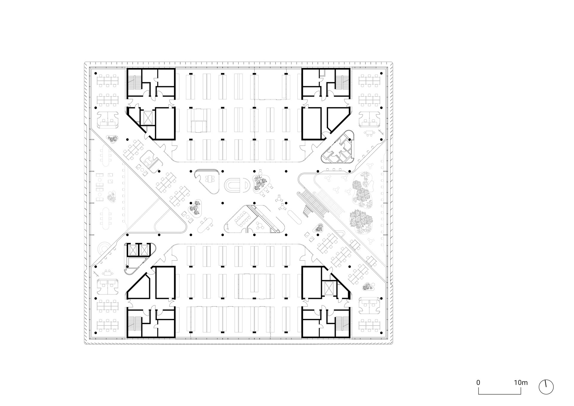 Auf den offenen Grundrissen der oberen Geschosse verbinden sich Labore und Büros zu einer zusammenhängenden Arbeitswelt. Die Laborflächen befinden sich gegenüberliegend an zwei Außenseiten des Gebäudes. Dazwischen spannt sich die Wissenswelt auf – mit Büroflächen und gemeinschaftlich genutzten Kommunikationsbereichen für fachlichen und informellen Austausch zwischen den Mitarbeitenden
