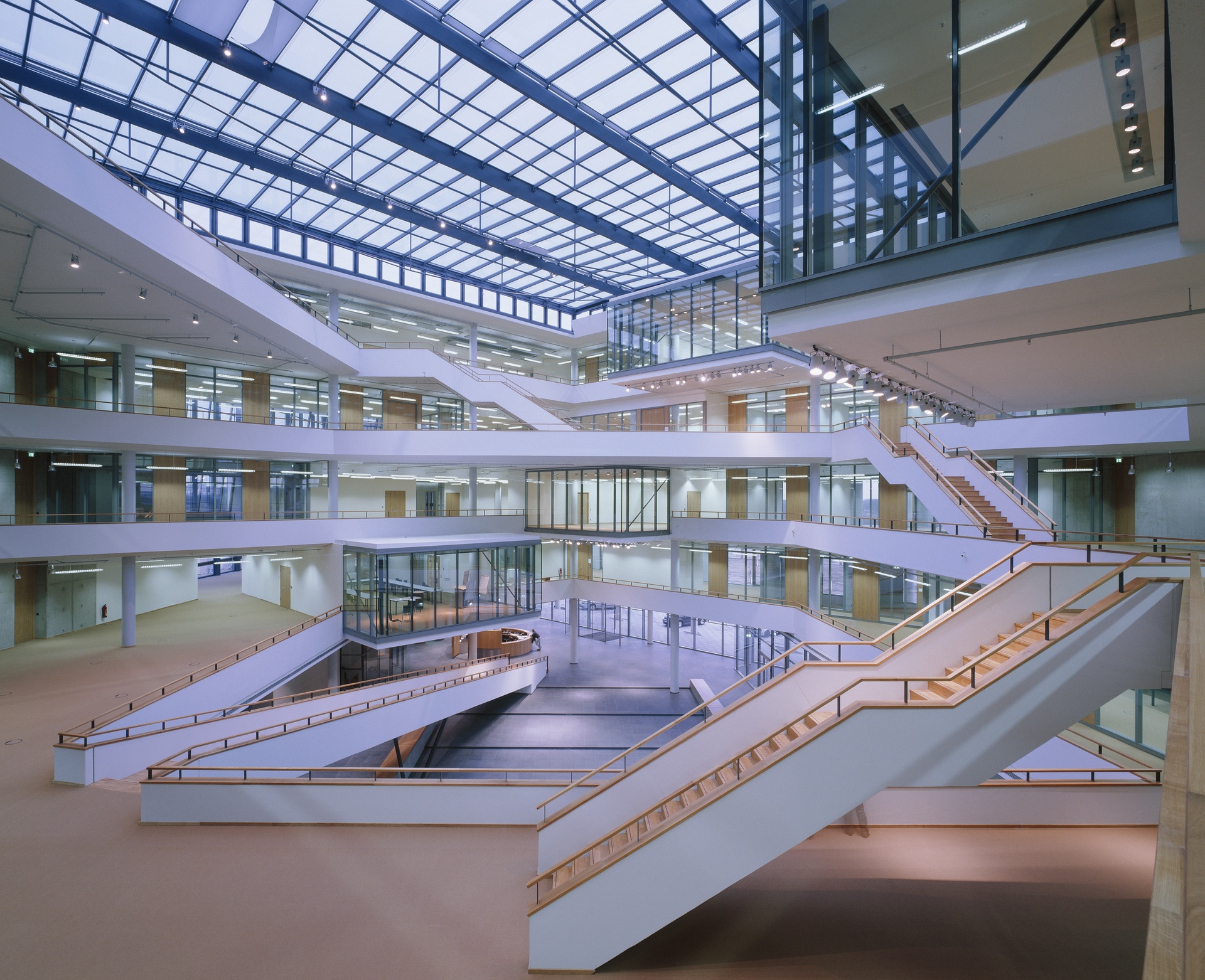 Im Inneren ist das bauliche und organisatorische Zentrum des MobileLifeCampus das mit einem Glasdach überspannte Atrium, das sich über vier Geschosse erstreckt und zu dem alle Wege führen. Offene Treppen ermöglichen unmittelbare Kontaktaufnahme und Kommunikation. Bewusste Vernetzungen der Wege unterstreichen die Offenheit. Die Seminarräume sind in freier Anordnung um das Atrium gruppiert und ragen auf unterschiedlichen Höhen in das Zentrum hinein.